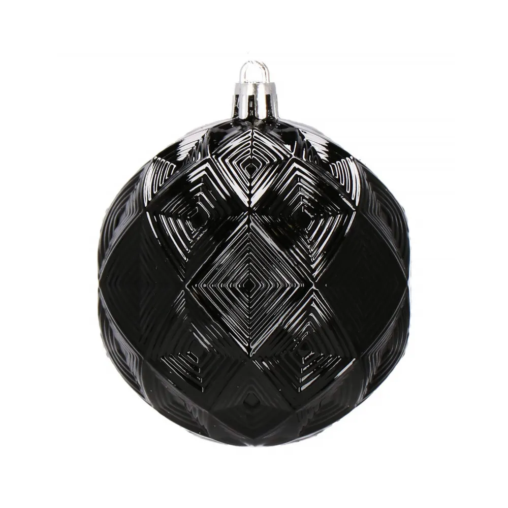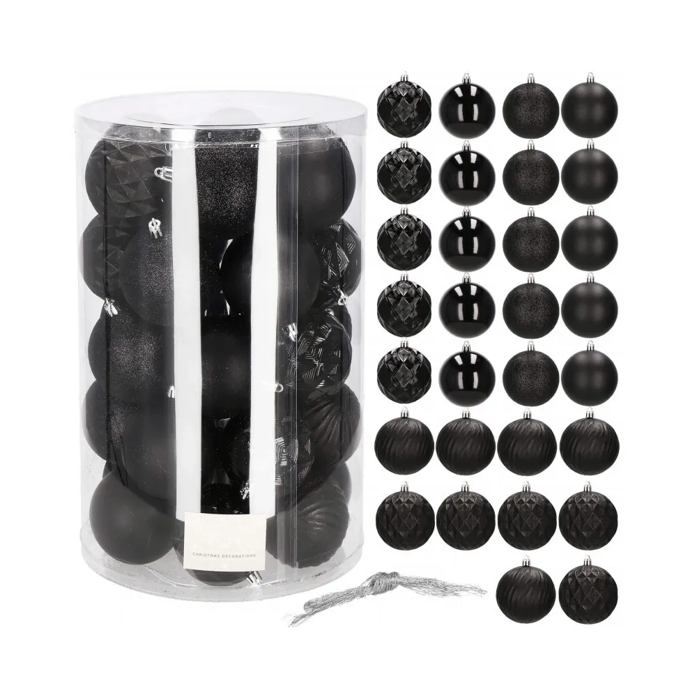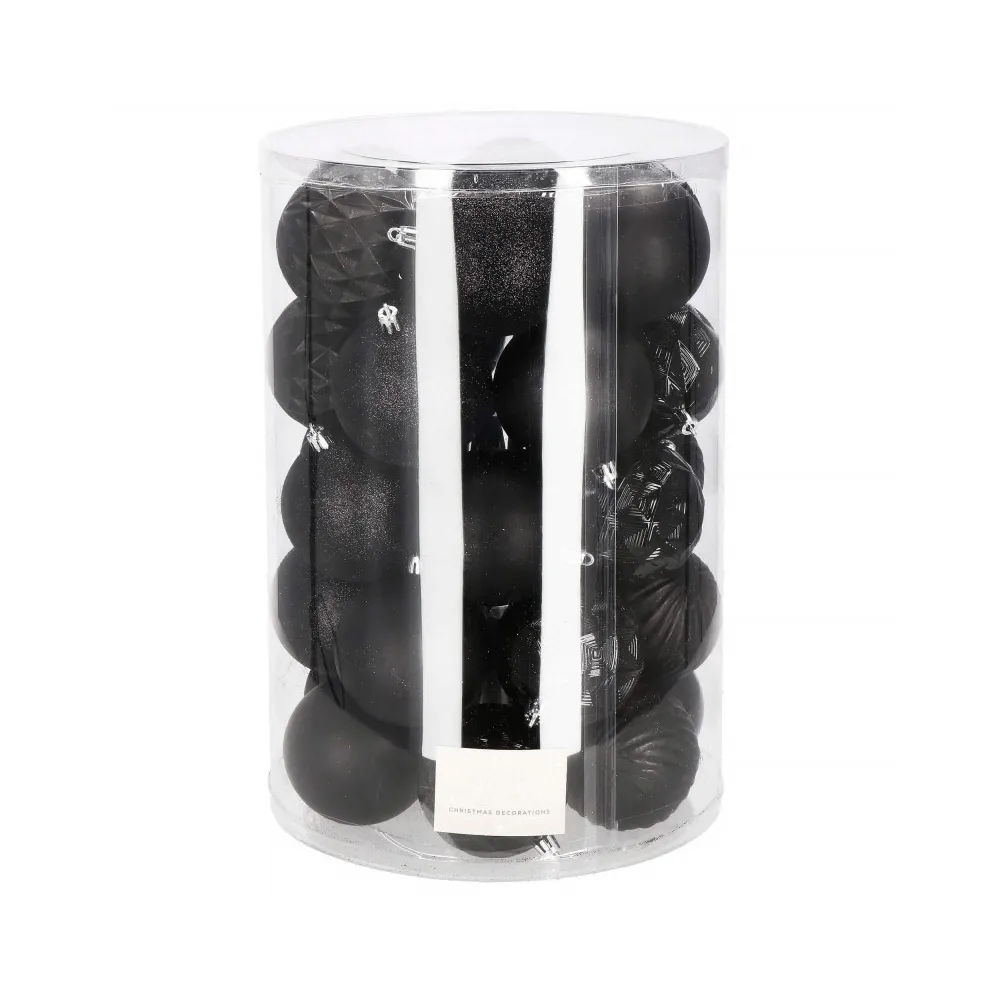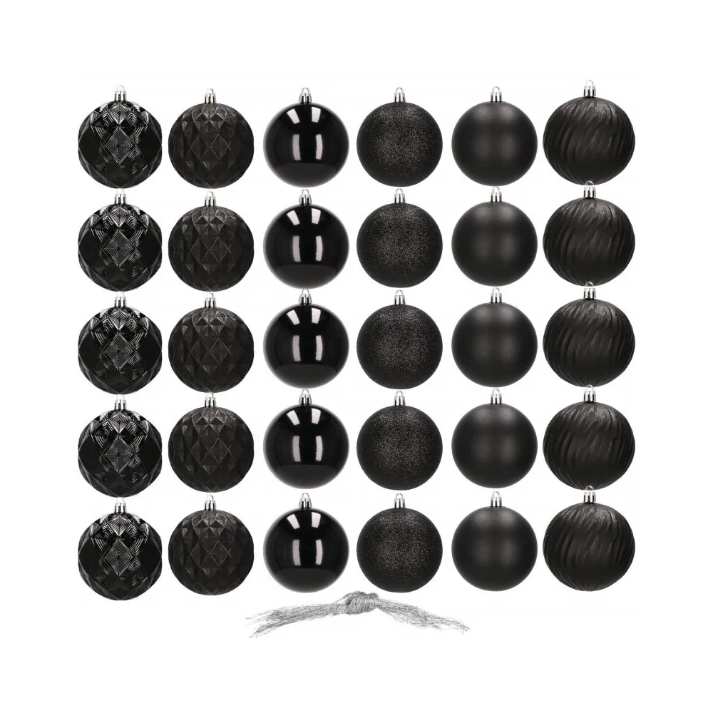 Sada 30 ks čiernych baniek na stromček so šiestimi rôznymi vzormi. Priemer banky je 8 cm. Pútko na zavesenie, nerozbitný plastový materiál. Ideálne na výzdobu stromčeka alebo ako vianočné dekorácie. Zadarmo povrázky pre ľahké zavesenie.