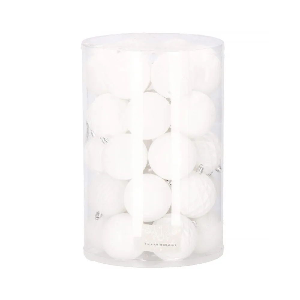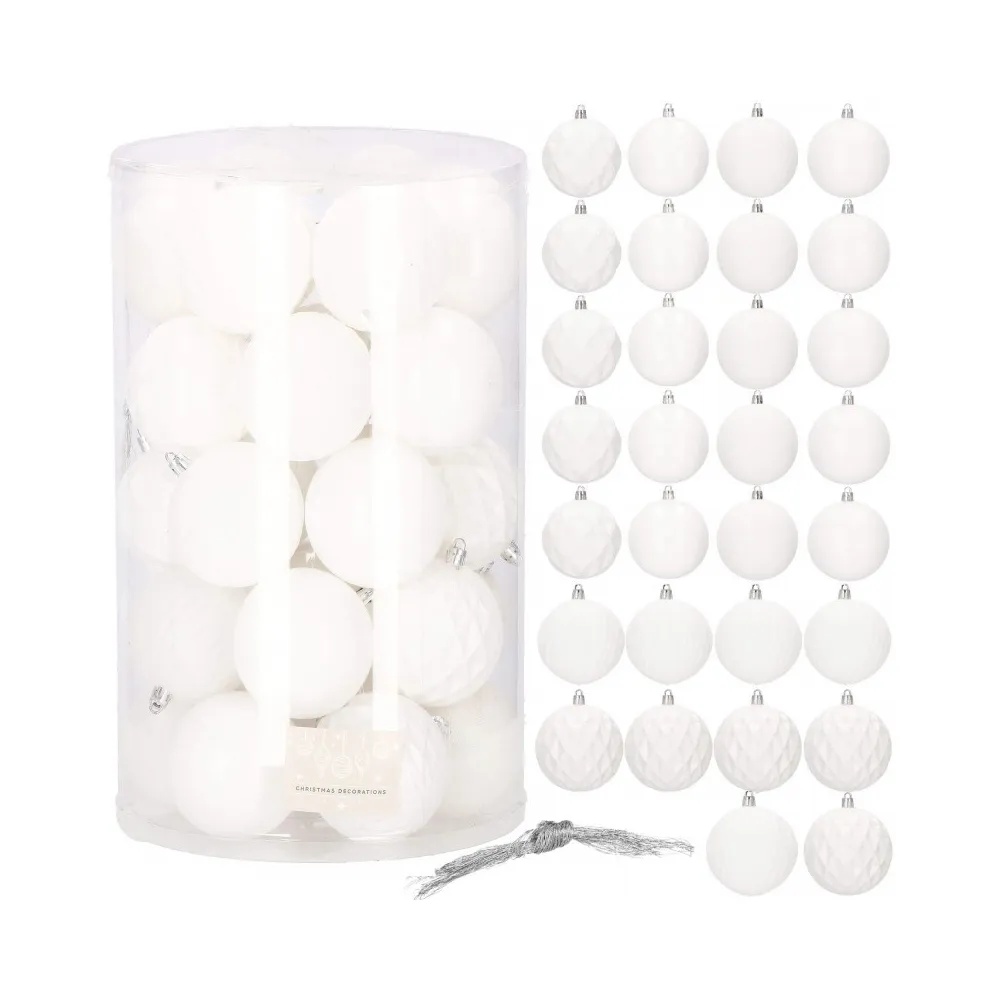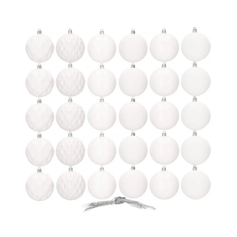 Sada 30 ks bielych baniek na stromček so šiestimi rôznymi vzormi. Priemer banky je 8 cm. Pútko na zavesenie, nerozbitný plastový materiál. Ideálne na výzdobu stromčeka alebo ako vianočné dekorácie. Zadarmo povrázky pre ľahké zavesenie.