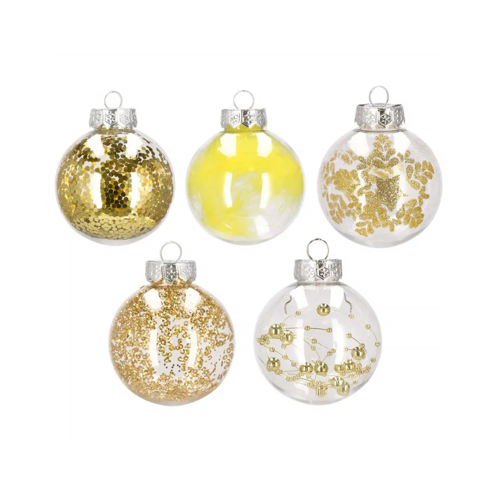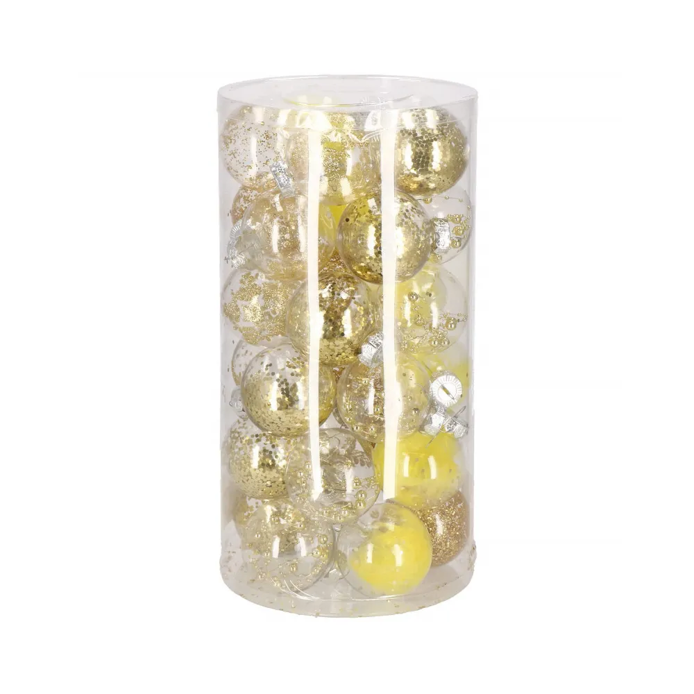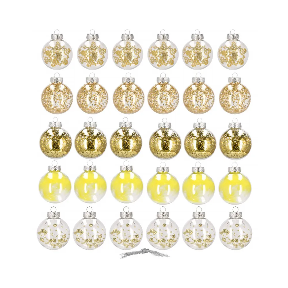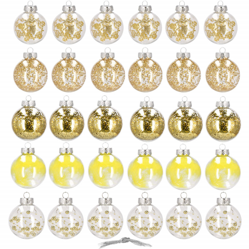 Sada 30 ks priehľadných baniek na stromček s piatimi rôznymi vzormi a vnútornou výplňou . Priemer banky 7 cm, pútko na zavesenie, nerozbitný plastový materiál. Ideálne na výzdobu stromčeka alebo ako vianočné dekorácie. Zadarmo povrázky pre ľahké zavesenie.