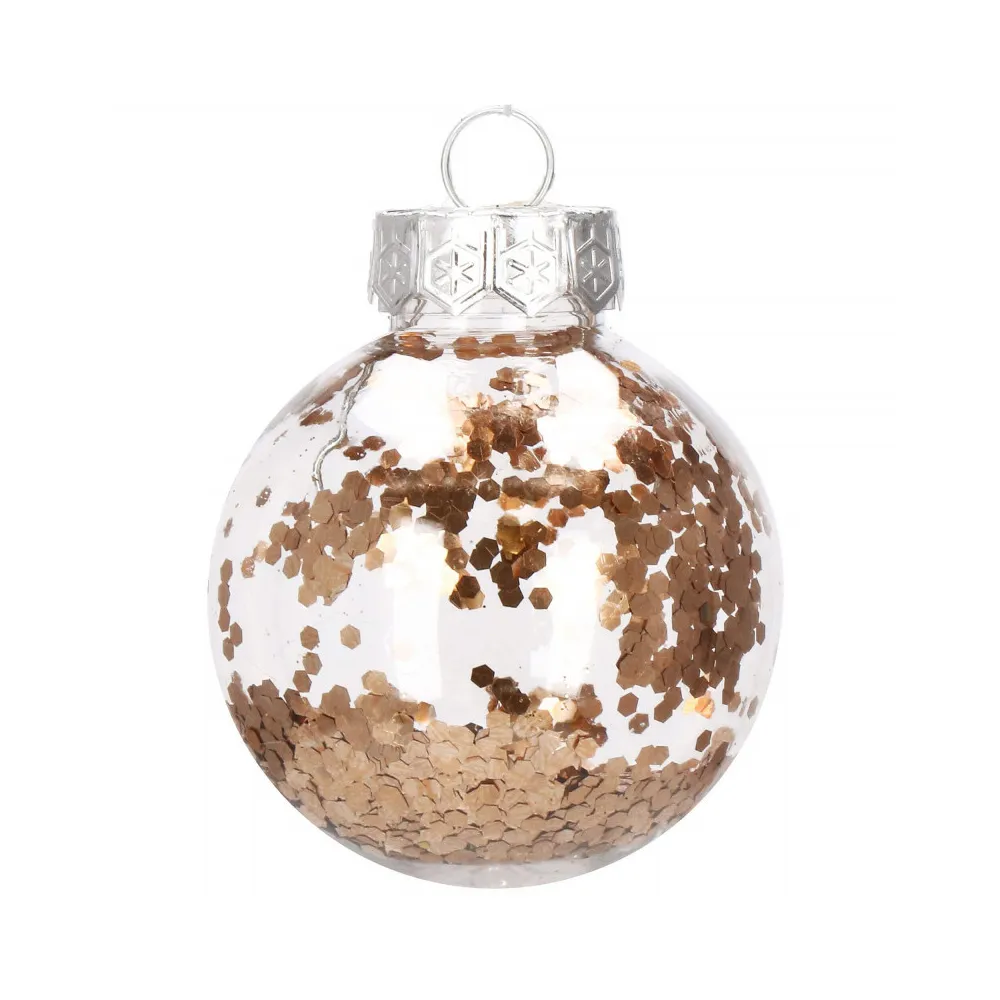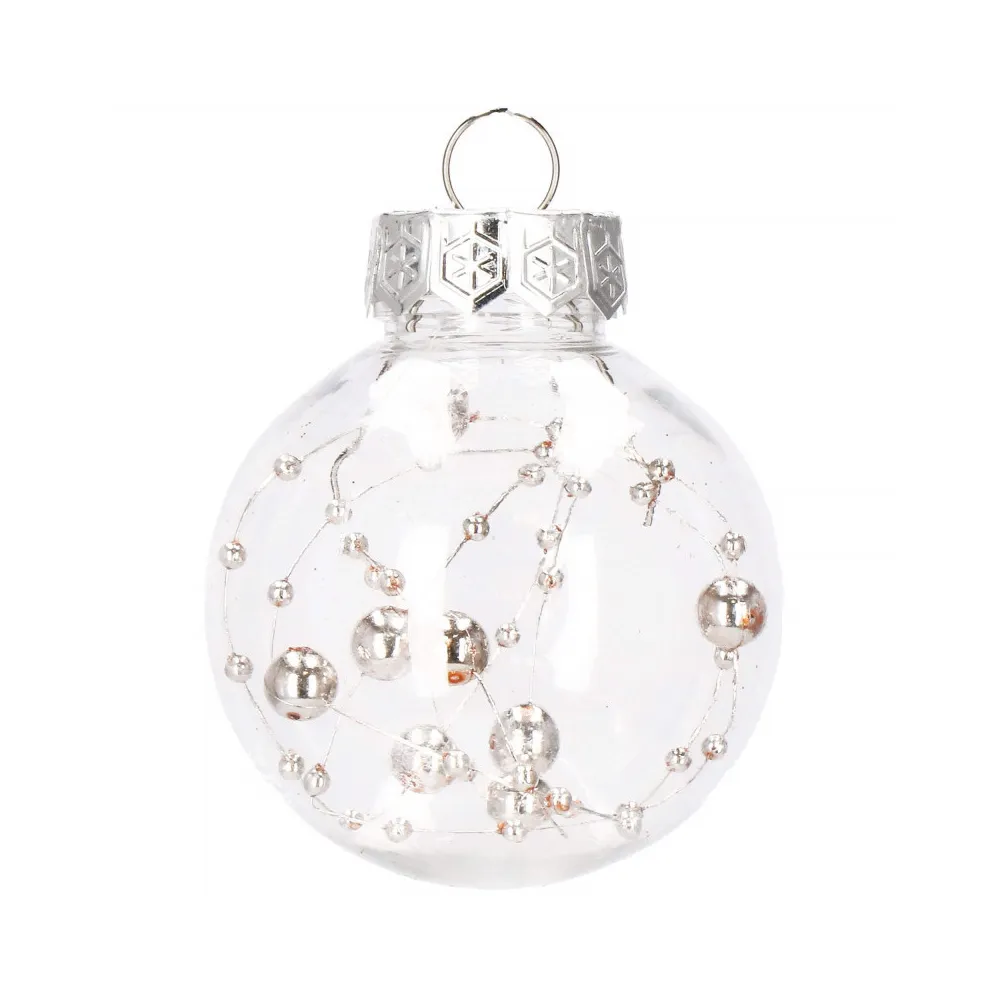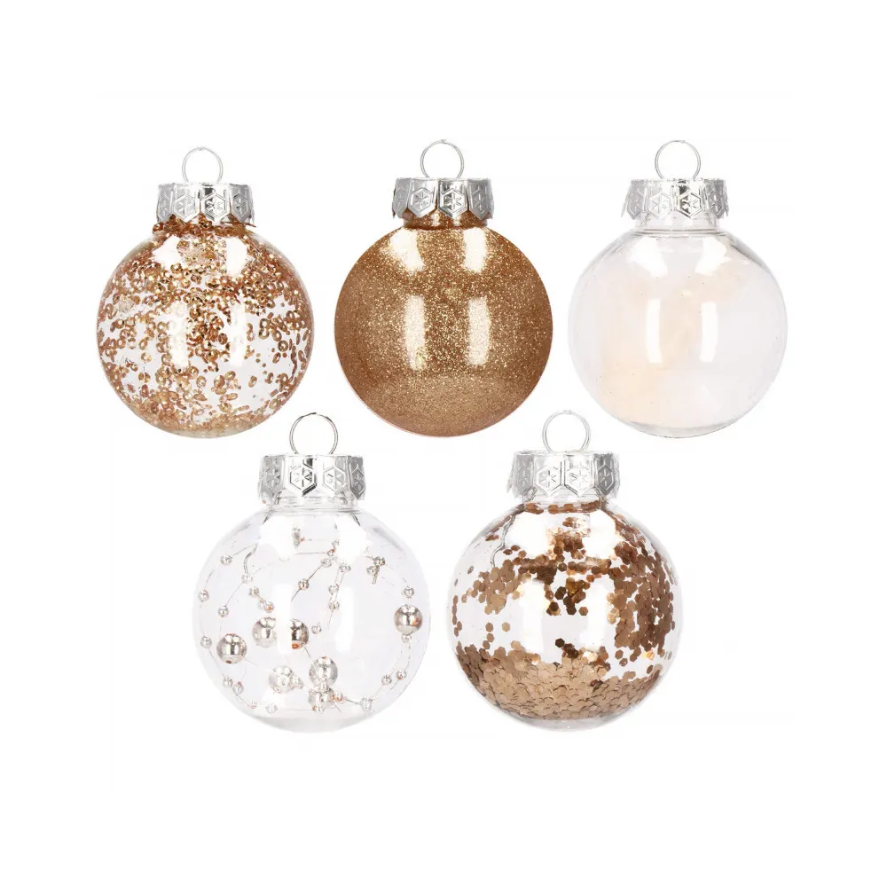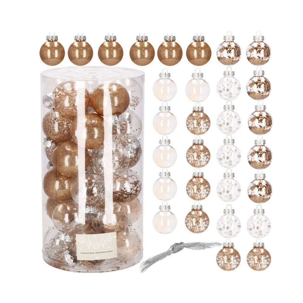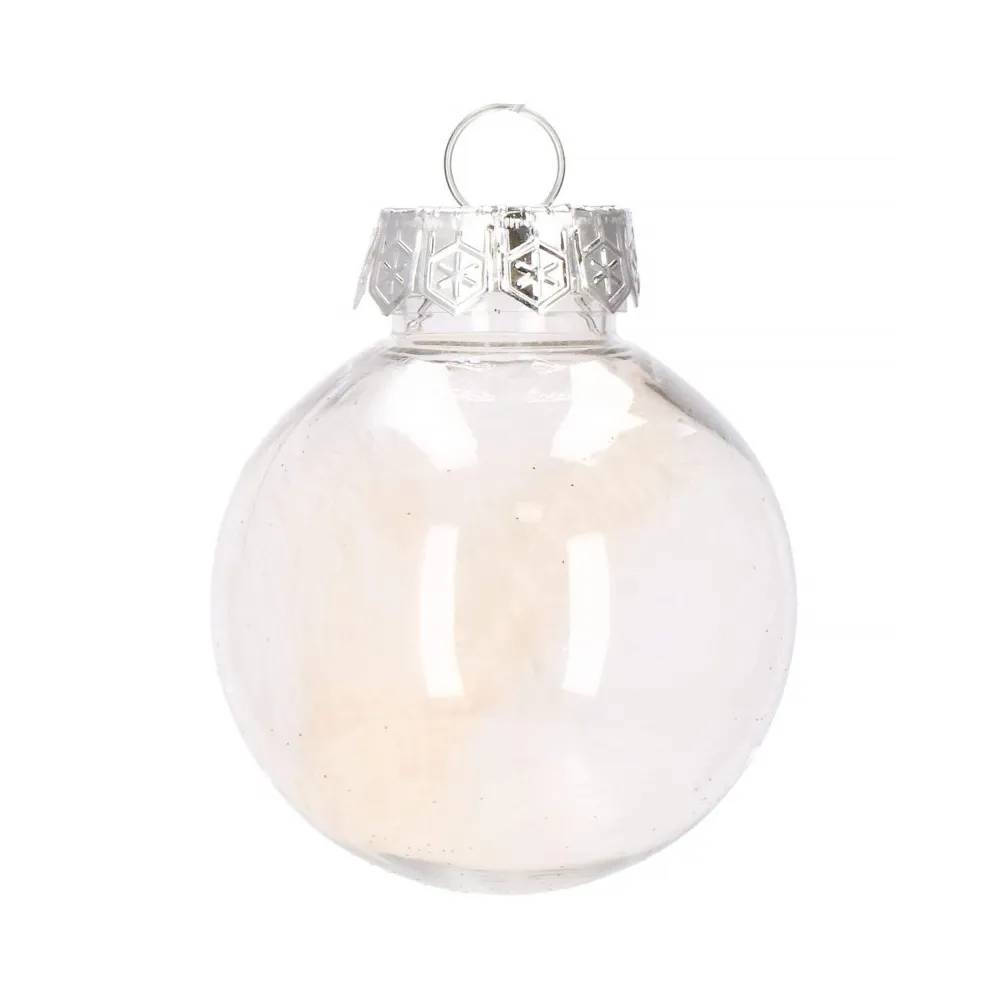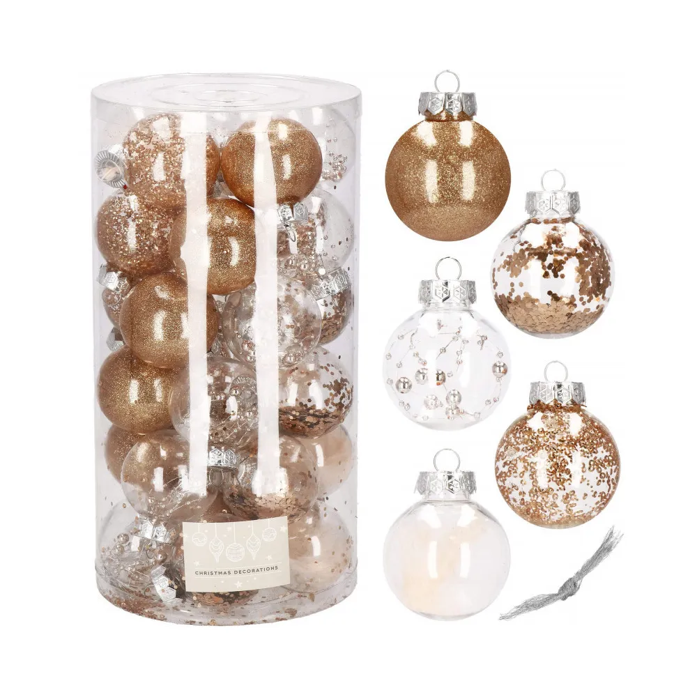 Sada 30 ks priehľadných baniek na stromček s piatimi rôznymi vzormi a vnútornou výplňou. Priemer banky 6 cm, pútko na zavesenie, nerozbitný plastový materiál. Ideálne na výzdobu stromčeka alebo ako vianočné dekorácie. Zadarmo povrázky pre ľahké zavesenie.