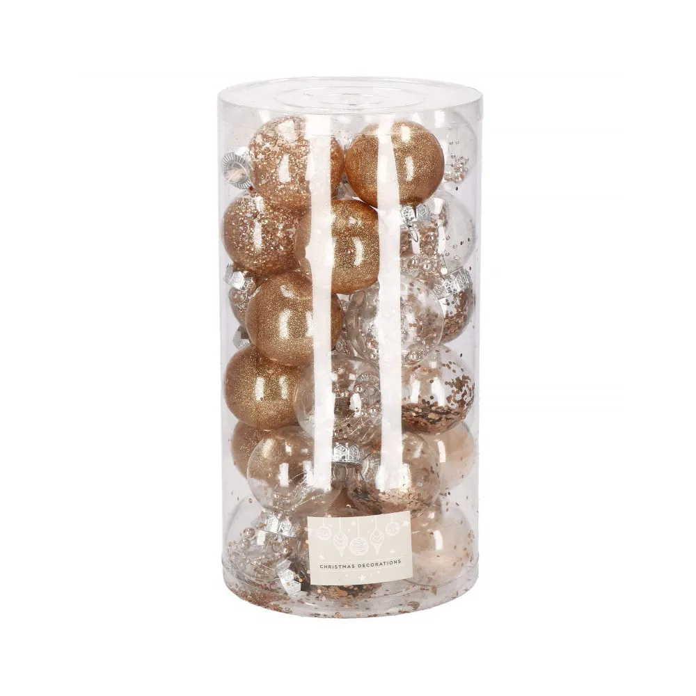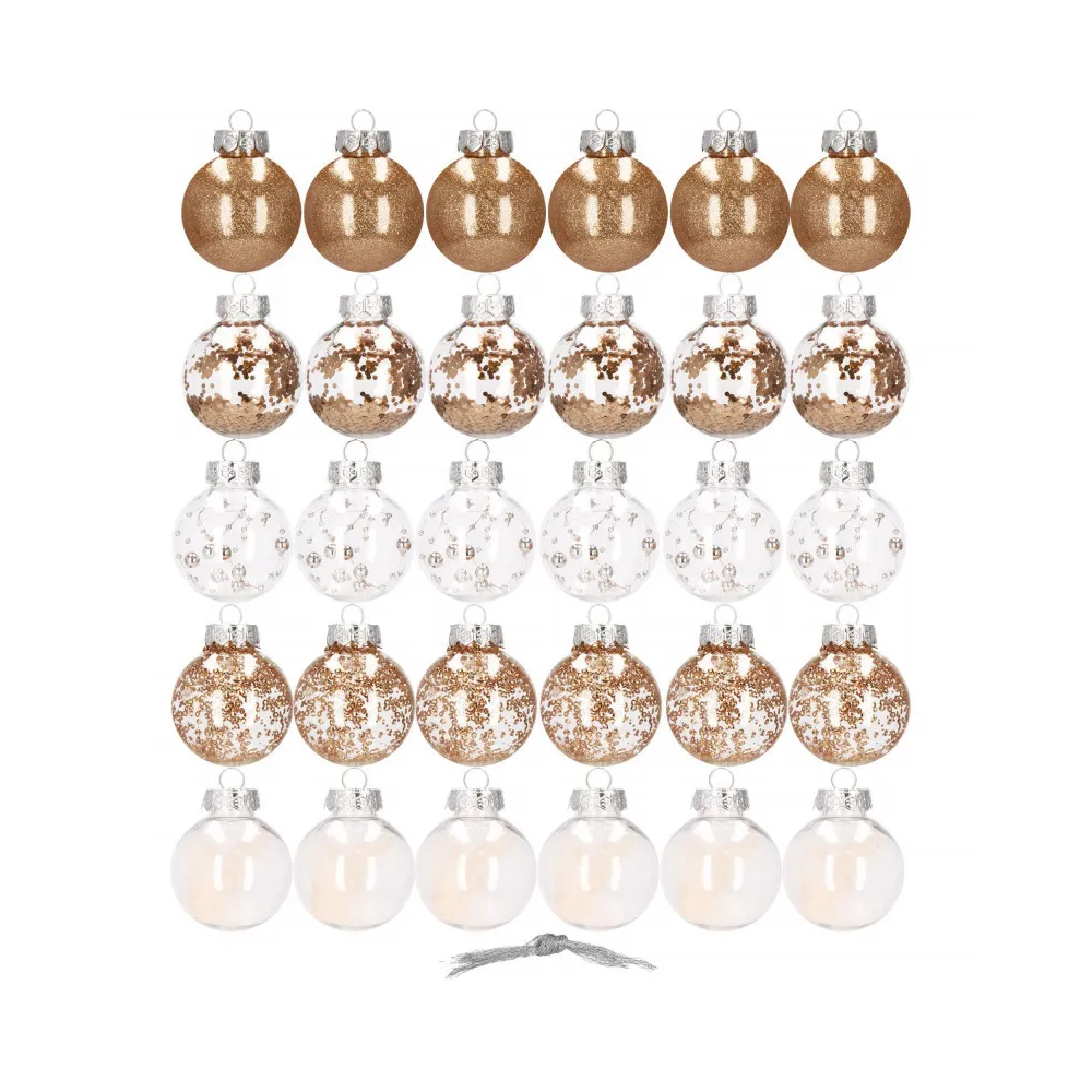 Sada 30 ks transparentných baniek na stromček s piatimi rôznymi vzormi. Zlaté a strieborné vnútorné zdobenie, pútko na zavesenie, nerozbitný plastový materiál. Ideálne na výzdobu stromčeka alebo ako vianočné dekorácie. Zadarmo povrázky pre ľahké zavesenie.