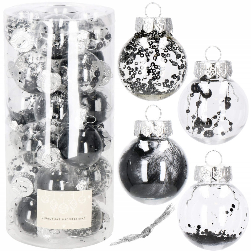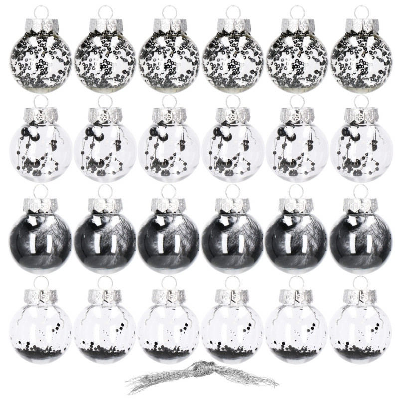 Sada 24 ks priehľadných baniek na stromček so štyrmi rôznymi vzormi a vnútornou výplňou. Priemer banky 5 cm, pútko na zavesenie, nerozbitný plastový materiál. Ideálne na výzdobu stromčeka alebo ako vianočné dekorácie. Zadarmo povrázky pre ľahké zavesenie.