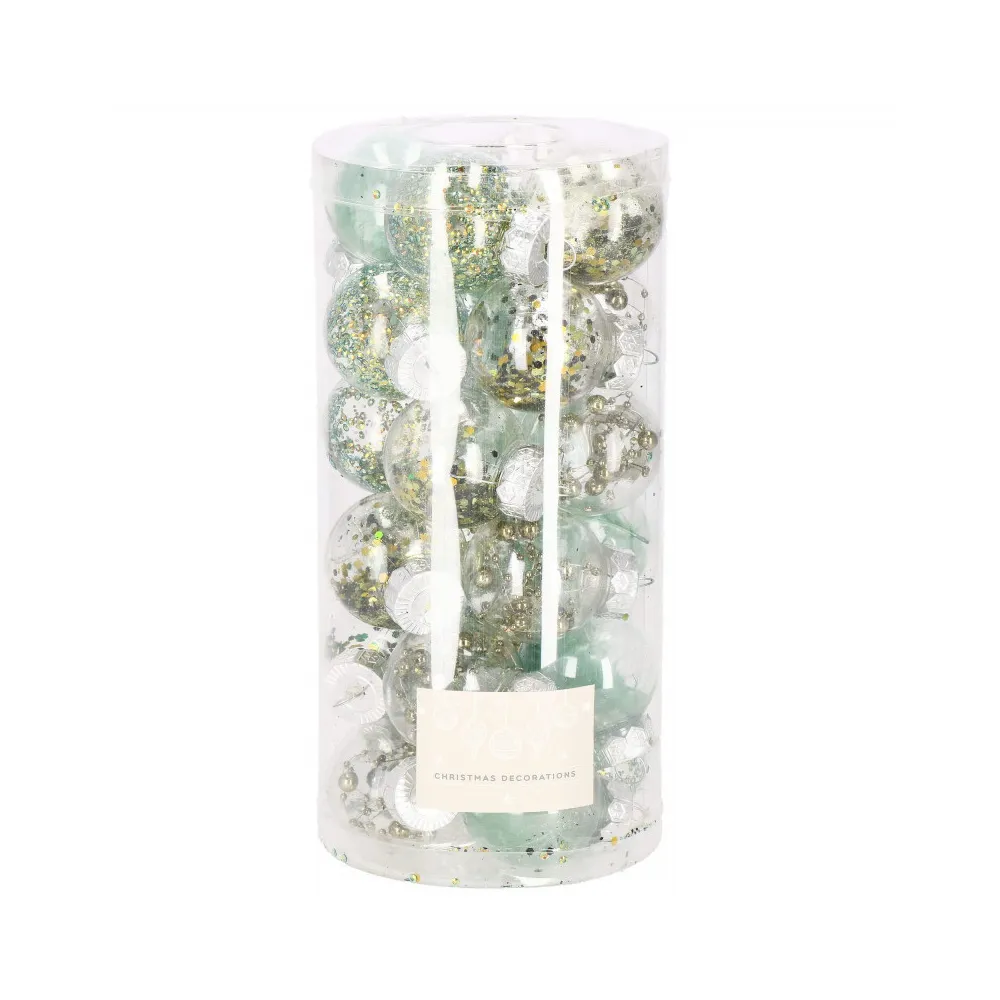 Sada 24 ks priehľadných baniek na stromček so štyrmi rôznymi vzormi a vnútornou výplňou. Priemer banky 5 cm, pútko na zavesenie, nerozbitný plastový materiál. Ideálne na výzdobu stromčeka alebo ako vianočné dekorácie. Zadarmo povrázky pre ľahké zavesenie.