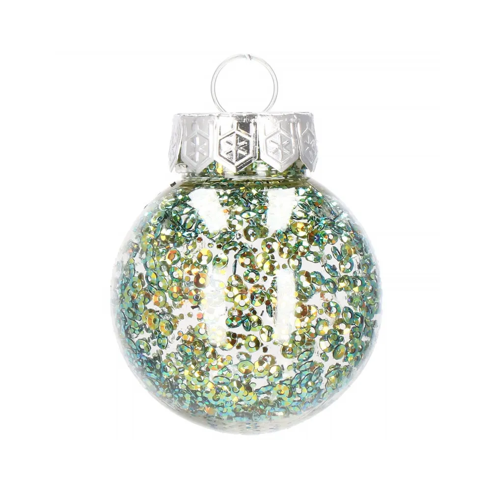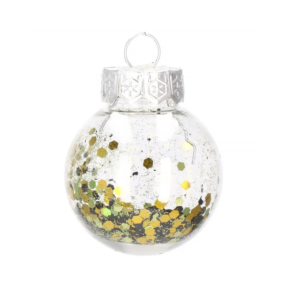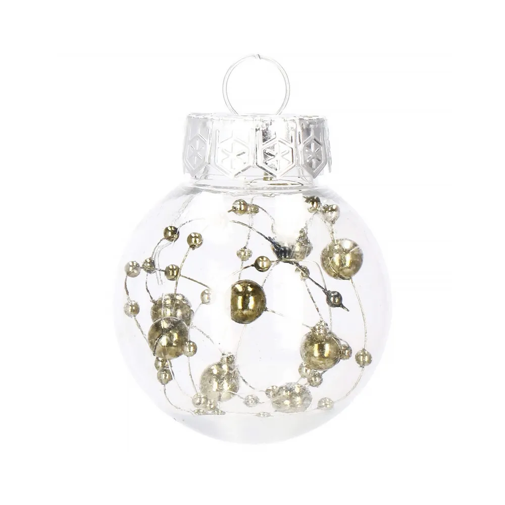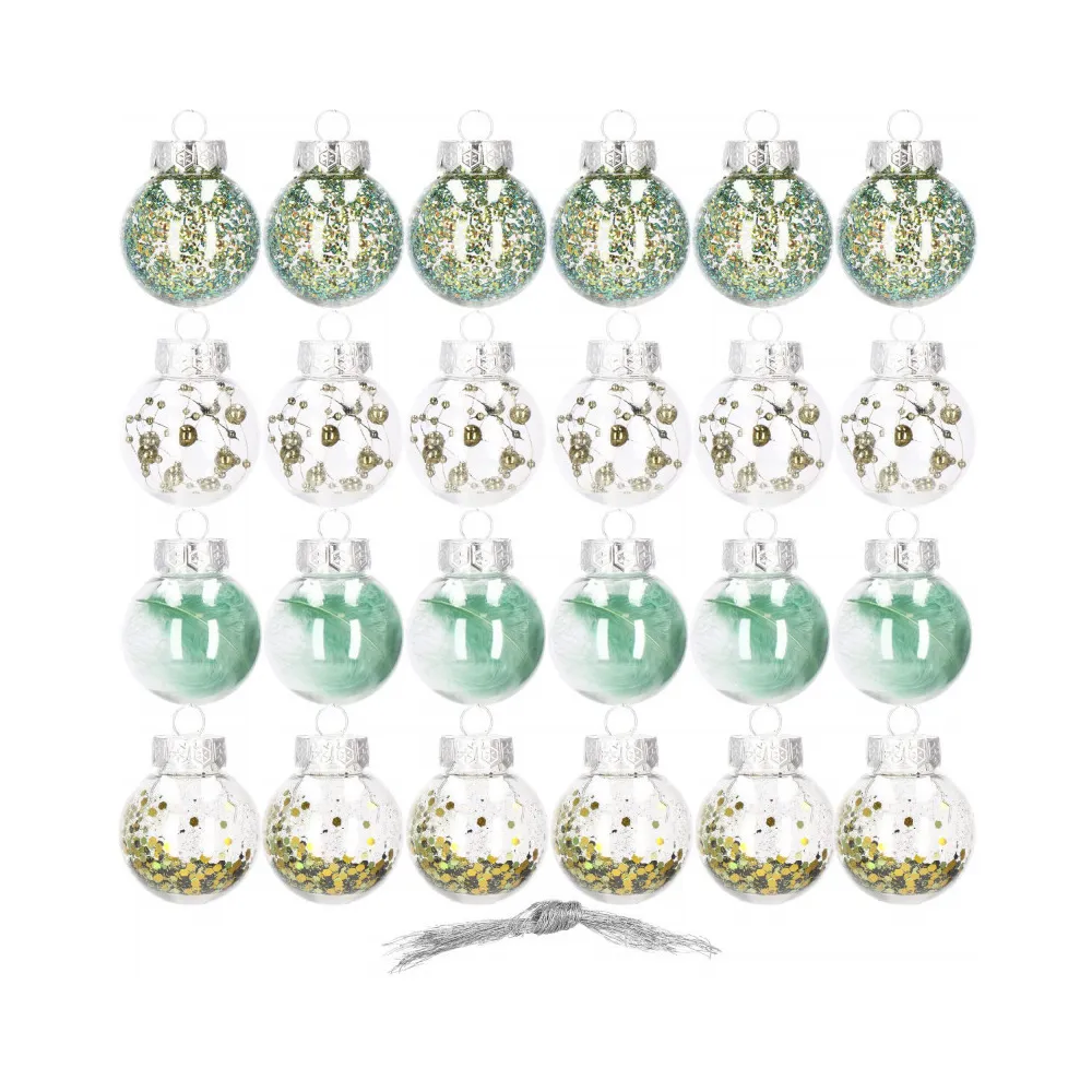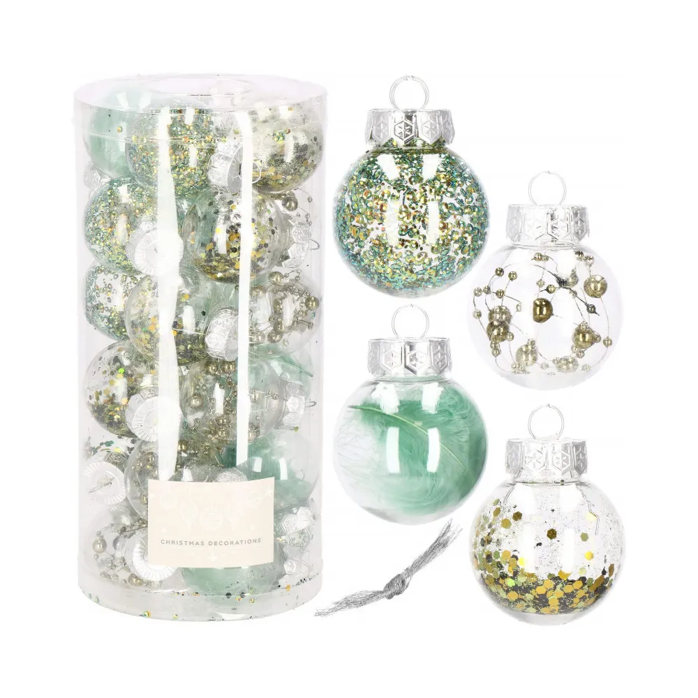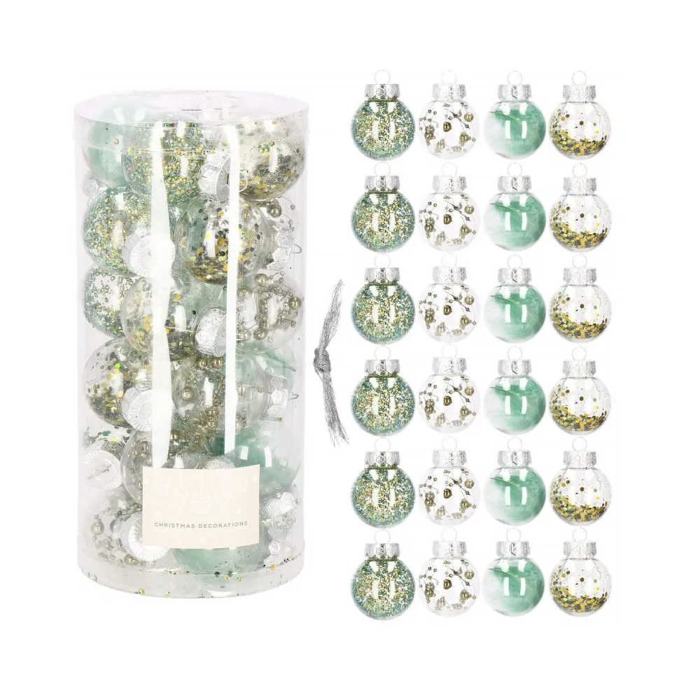 Sada 24 ks priehľadných baniek na stromček so štyrmi rôznymi vzormi a vnútornou výplňou. Priemer banky 5 cm, pútko na zavesenie, nerozbitný plastový materiál. Ideálne na výzdobu stromčeka alebo ako vianočné dekorácie. Zadarmo povrázky pre ľahké zavesenie.