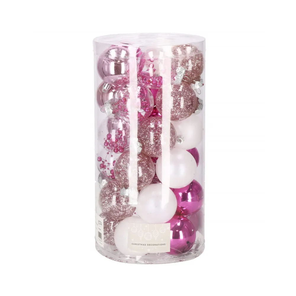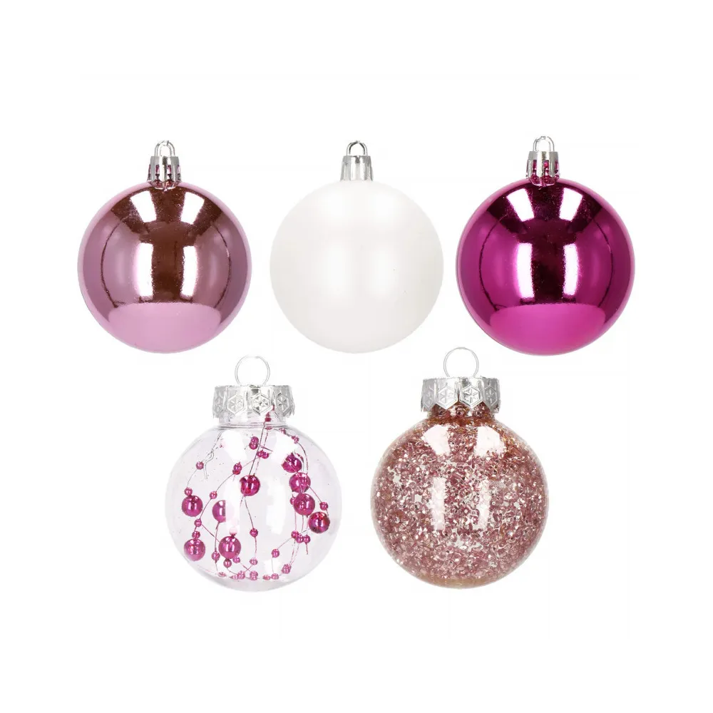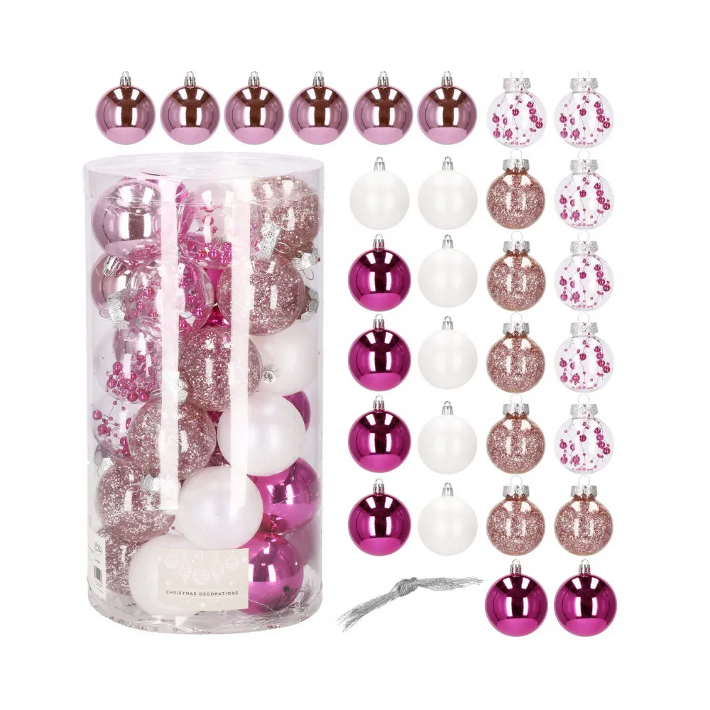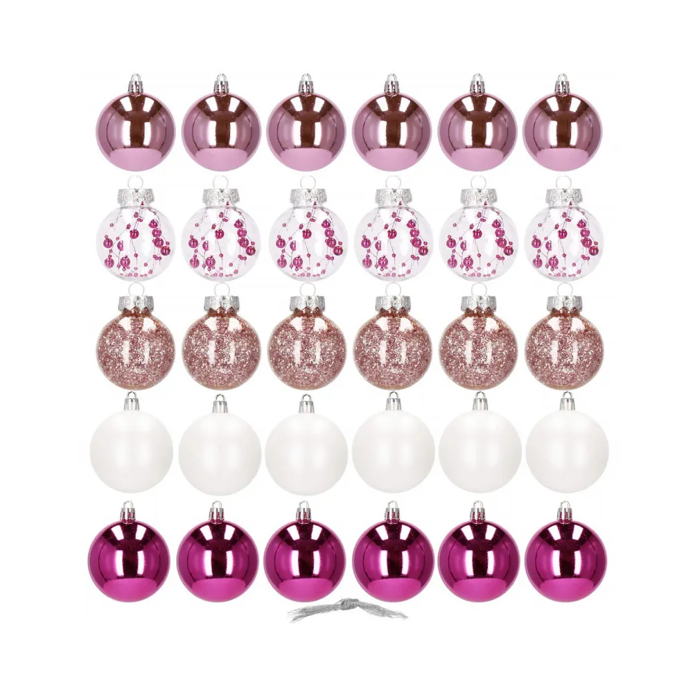 Sada 30 ks ružových a bielych baniek na stromček s piatimi rôznymi vzormi. Pútko na zavesenie, nerozbitný plastový materiál. Ideálne na výzdobu stromčeka alebo ako vianočné dekorácie. Zadarmo povrázky pre ľahké zavesenie.