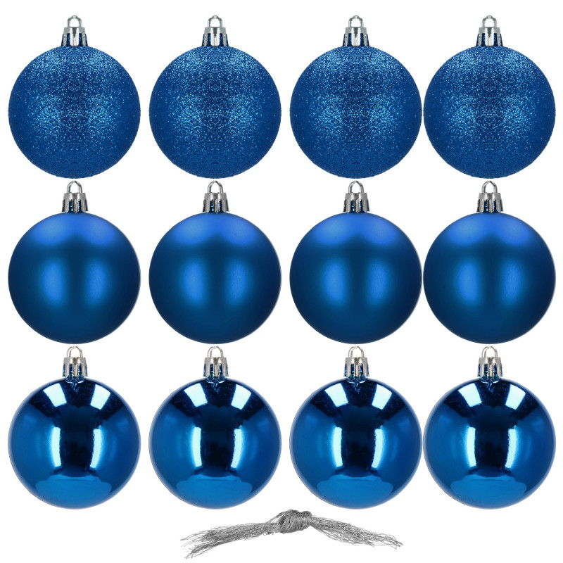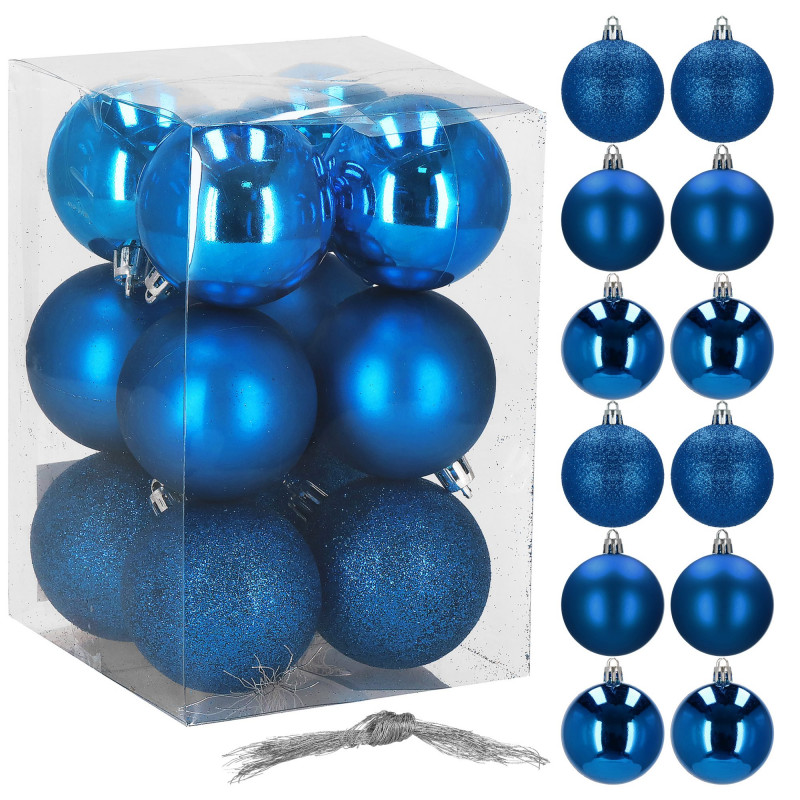Sada 12 ks modrých baniek na stromček s tromi rôznymi vzormi. Priemer banky 6 cm, pútko na zavesenie, nerozbitný plastový materiál. Ideálne na výzdobu stromčeka alebo ako vianočné dekorácie. Zadarmo povrázky pre ľahké zavesenie.