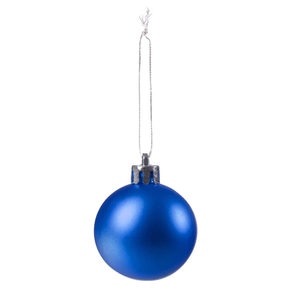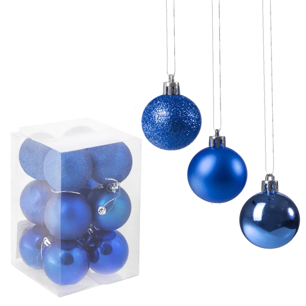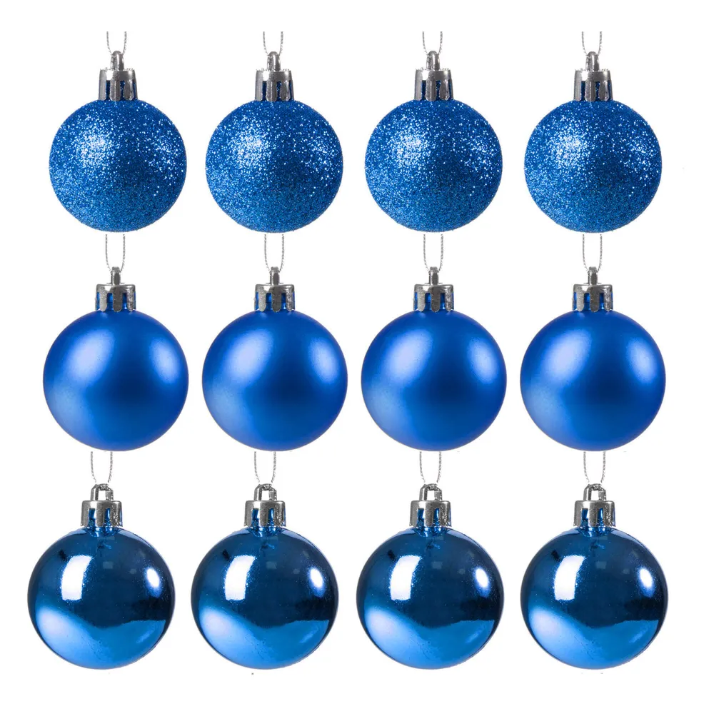 Sada 12 ks modrých baniek na stromček s tromi rôznymi vzormi. Priemer banky 6 cm, pútko na zavesenie, nerozbitný plastový materiál. Ideálne na výzdobu stromčeka alebo ako vianočné dekorácie. Zadarmo povrázky pre ľahké zavesenie.