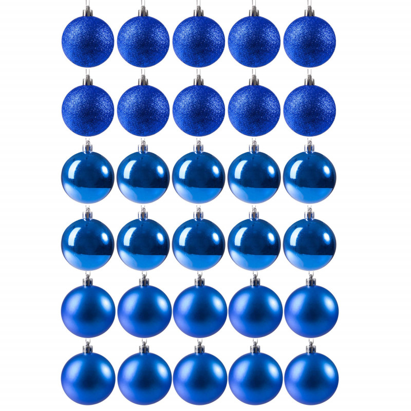 Sada 30 ks modrých baniek na stromček s tromi rôznymi vzormi. Priemer 6 cm, pútko na zavesenie, nerozbitný plastový materiál. Ideálne na výzdobu stromčeka alebo ako vianočné dekorácie. Zadarmo strieborné povrázky pre ľahké zavesenie.