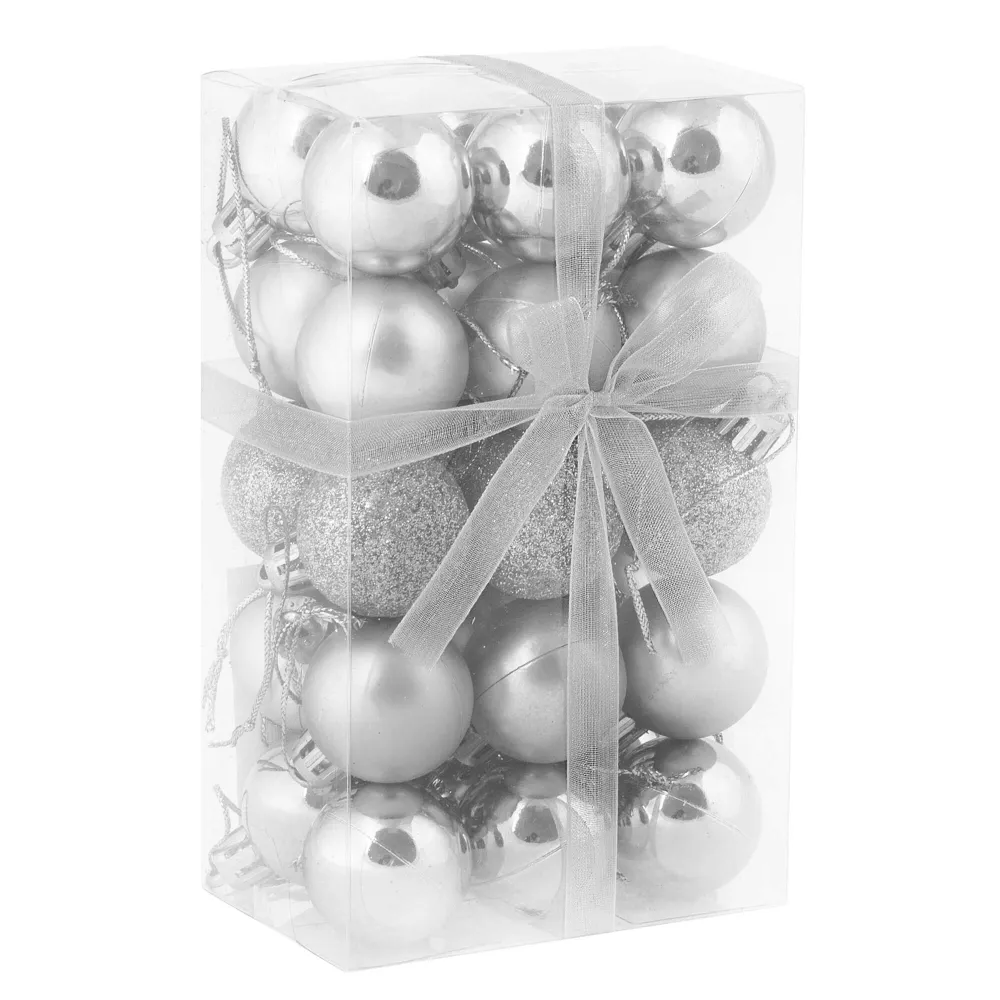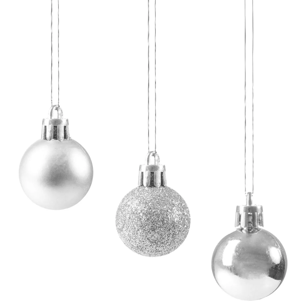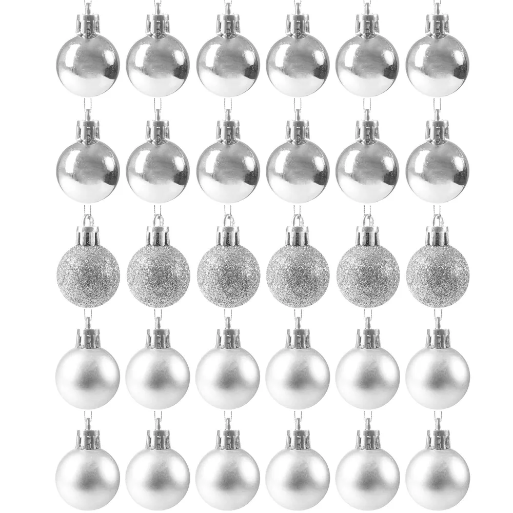 Sada 30 ks strieborných baniek na stromček s tromi rôznymi vzormi. Priemer banky je 3 cm. Pútko na zavesenie, nerozbitný plastový materiál. Ideálne na výzdobu stromčeka alebo ako vianočné dekorácie. Zadarmo povrázky pre ľahké zavesenie.