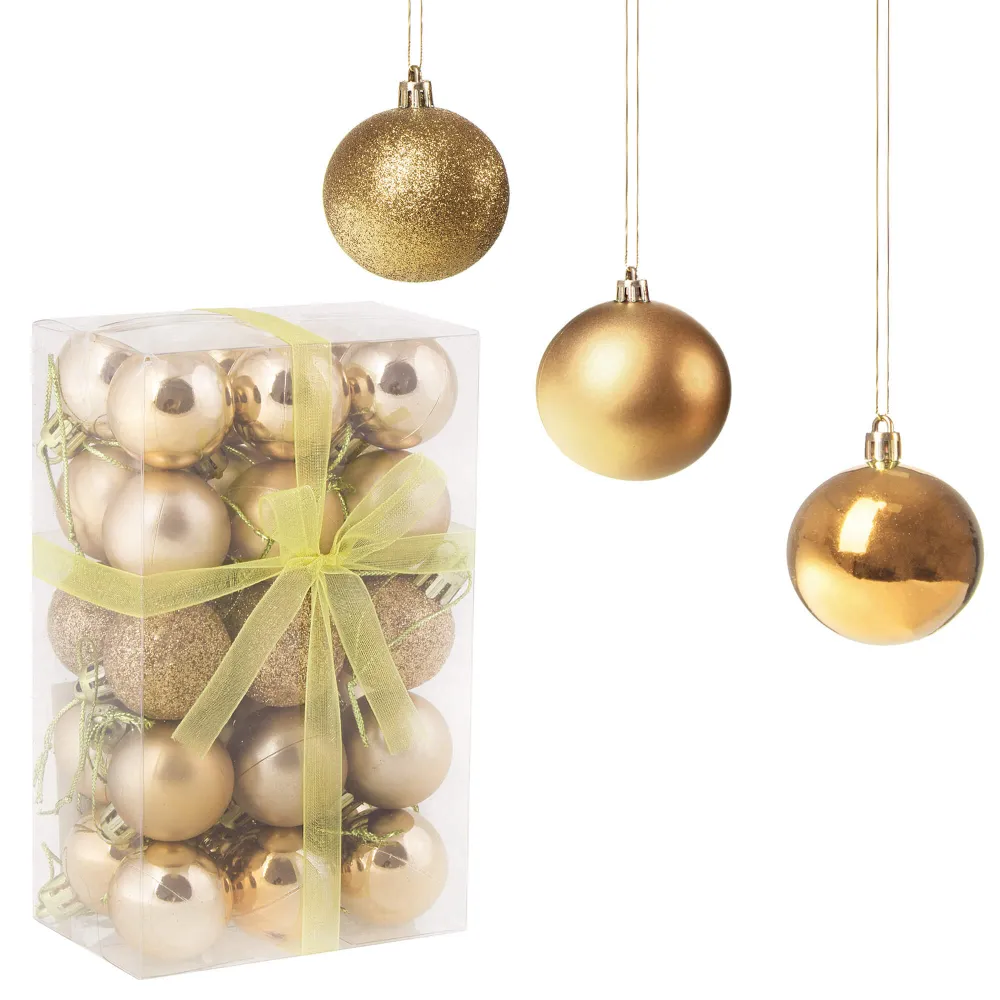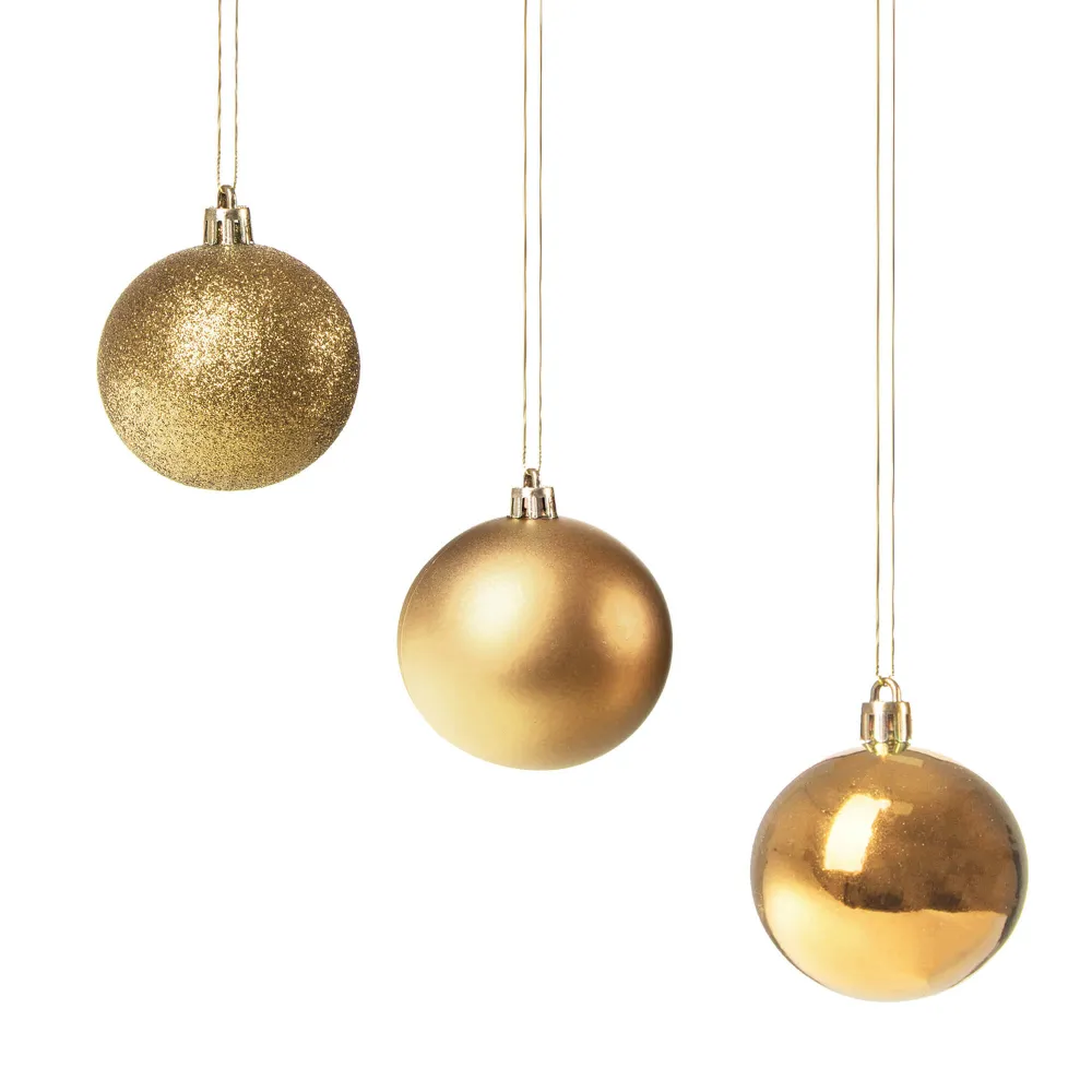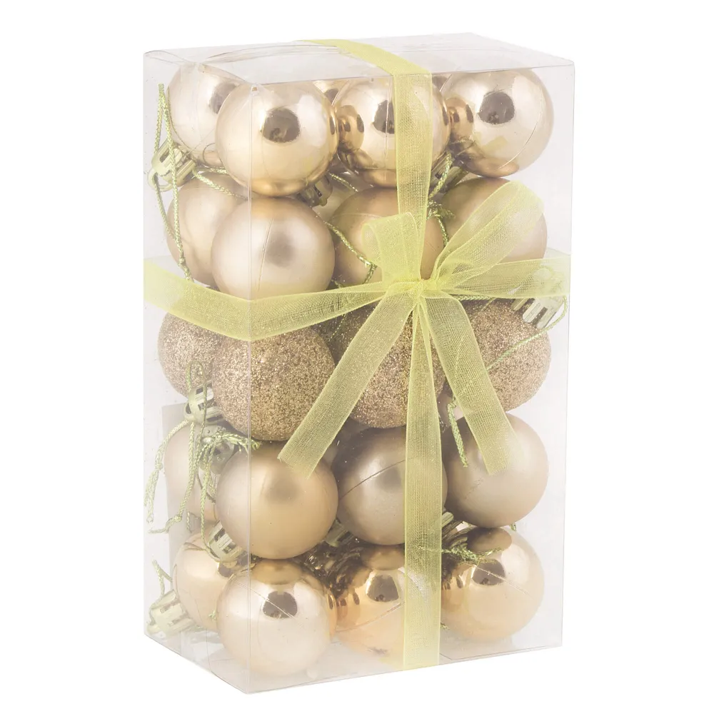 Sada 30 ks zlatých baniek na stromček so štyrmi rôznymi vzormi. Priemer banky 3 cm, pútko na zavesenie, nerozbitný plastový materiál. Ideálne na výzdobu stromčeka alebo ako vianočné dekorácie. Zadarmo povrázky pre ľahké zavesenie.