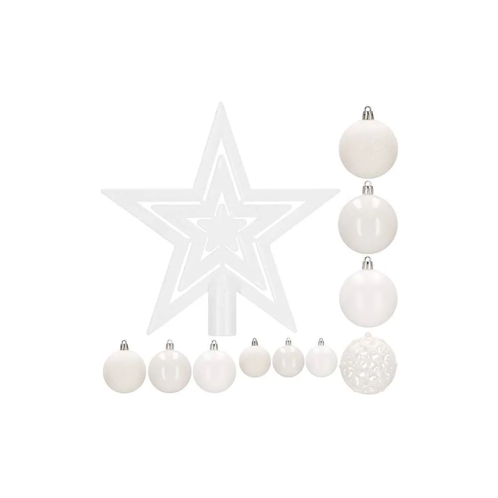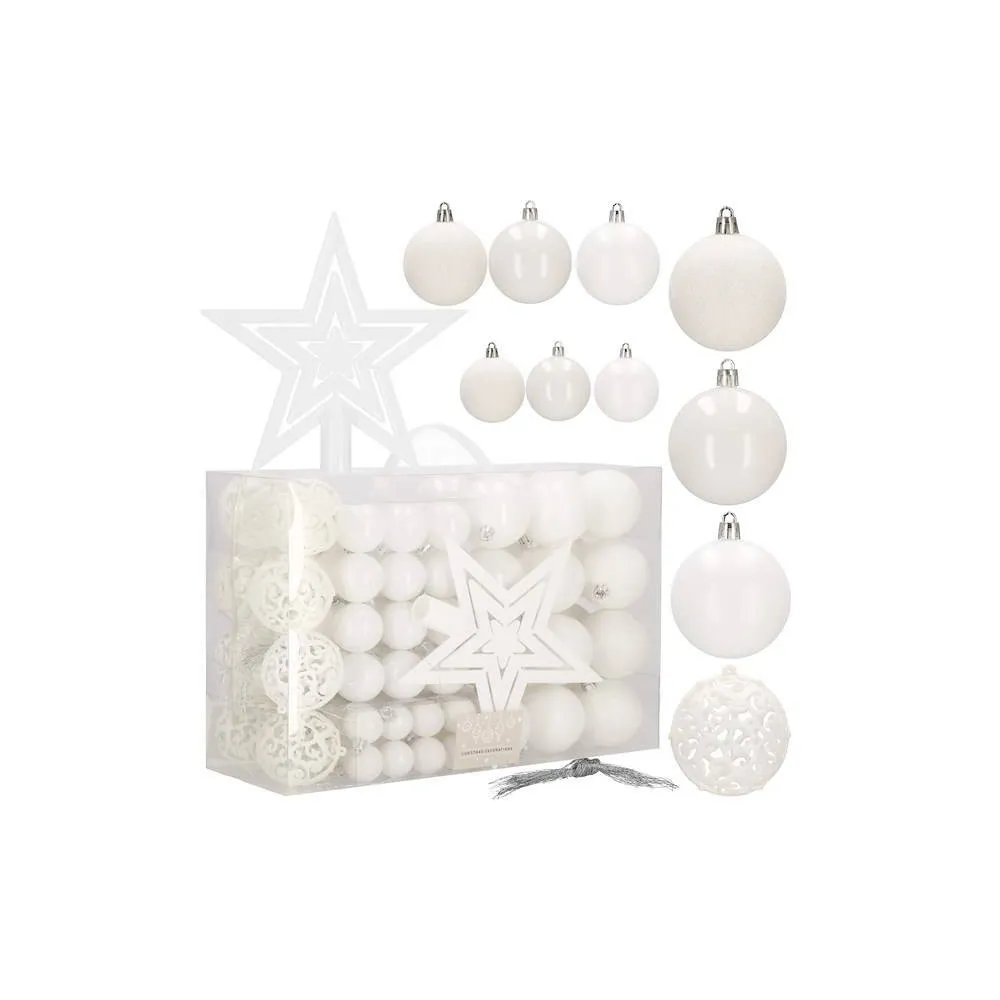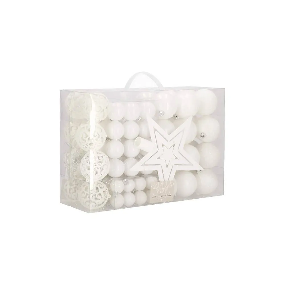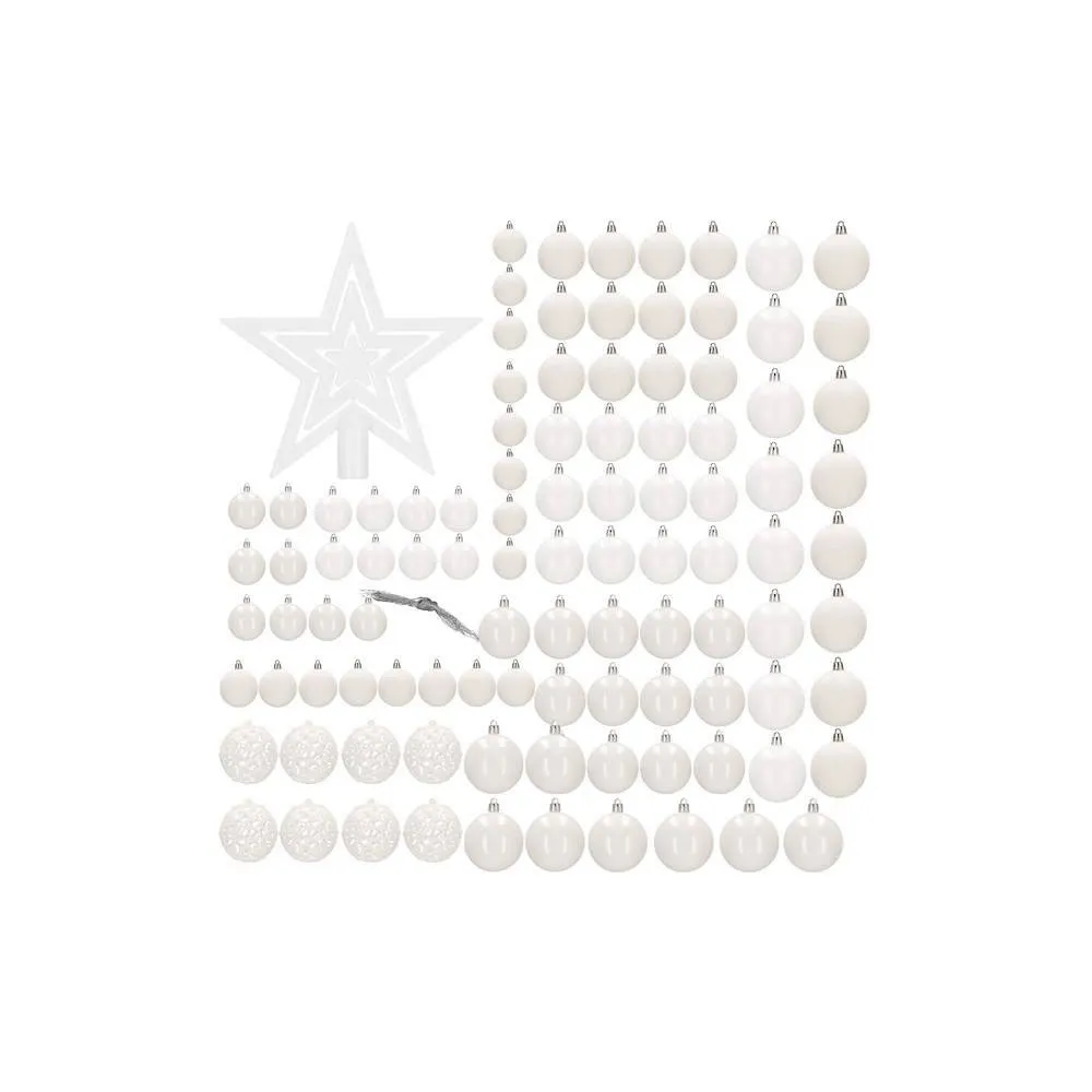 Nádherne zdobená 100 dielna sada vianočných ozdôb na stromček. Set tvoria rôzne prevedenia a veľkosti bielych baniek doplnené o prekrásnu hviezdu. Všetko z nerozbitného plastového materiálu. Ideálne na výzdobu stromčeka alebo ako vianočné dekorácie. Zadarmo povrázky pre ľahké zavesenie.