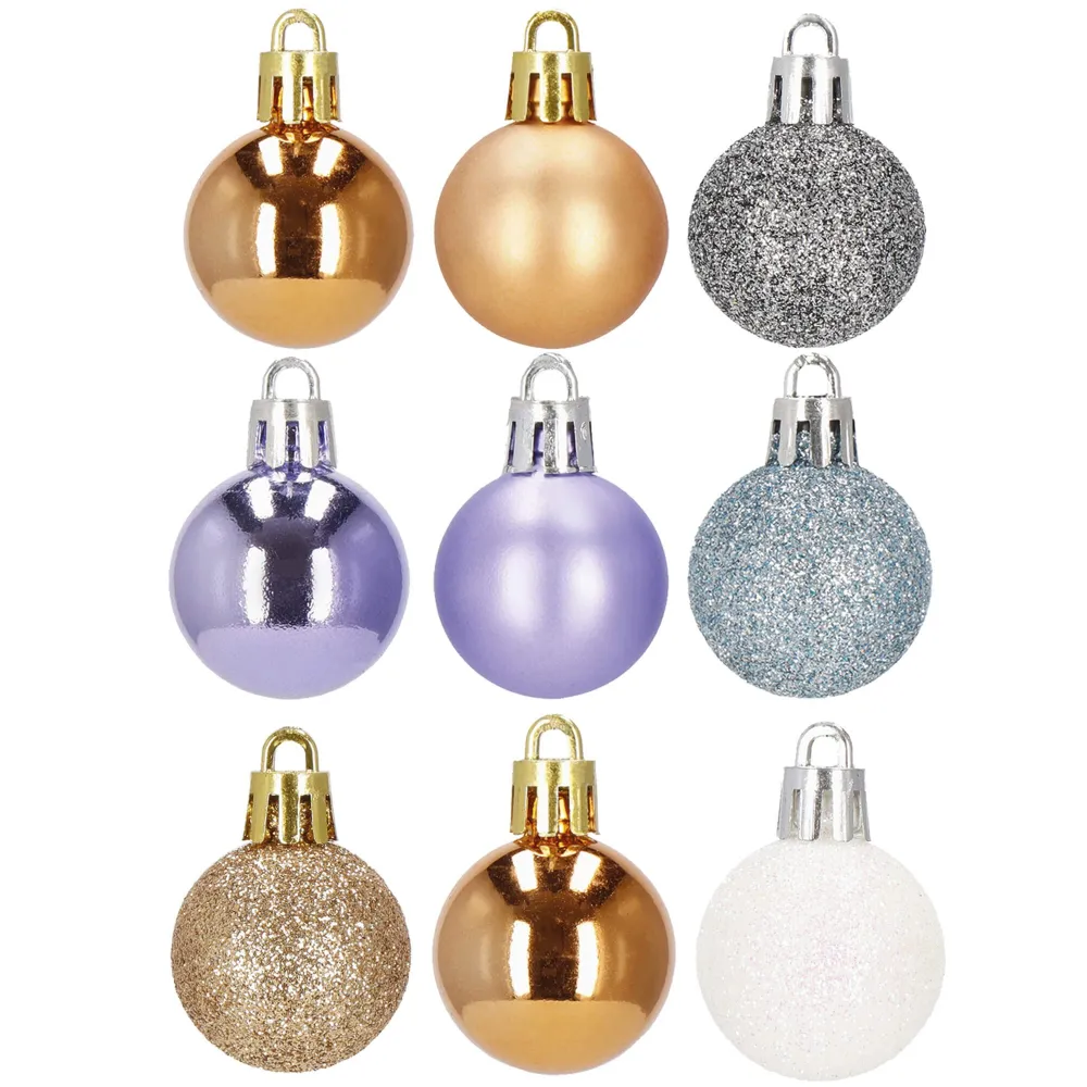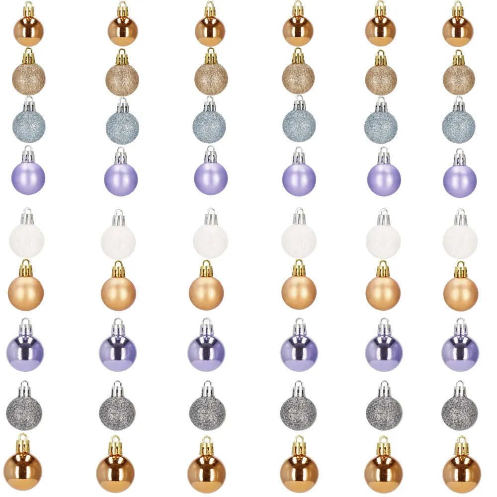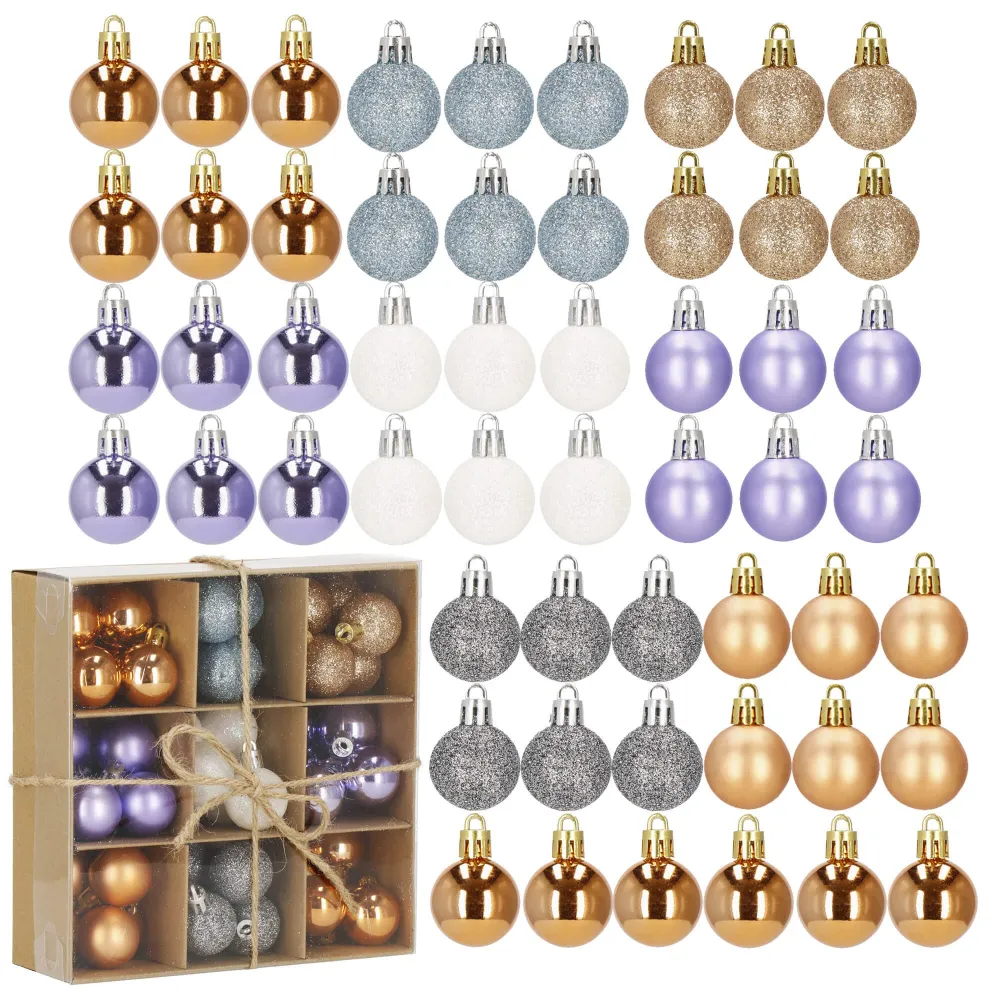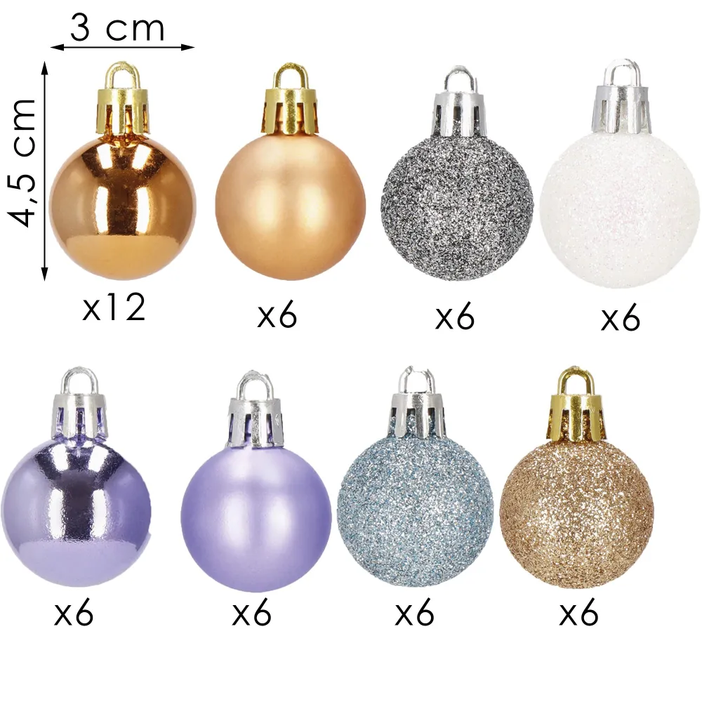 Maxi sada 54 ks farebných baniek na stromček s tromi rôznymi vzormi. Priemer banky 3 cm, pútko na zavesenie, nerozbitný plastový materiál. Ideálna ozdoba stromčeka alebo ako vianočná dekorácia.