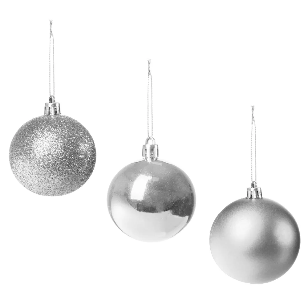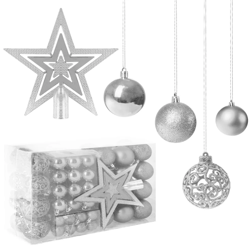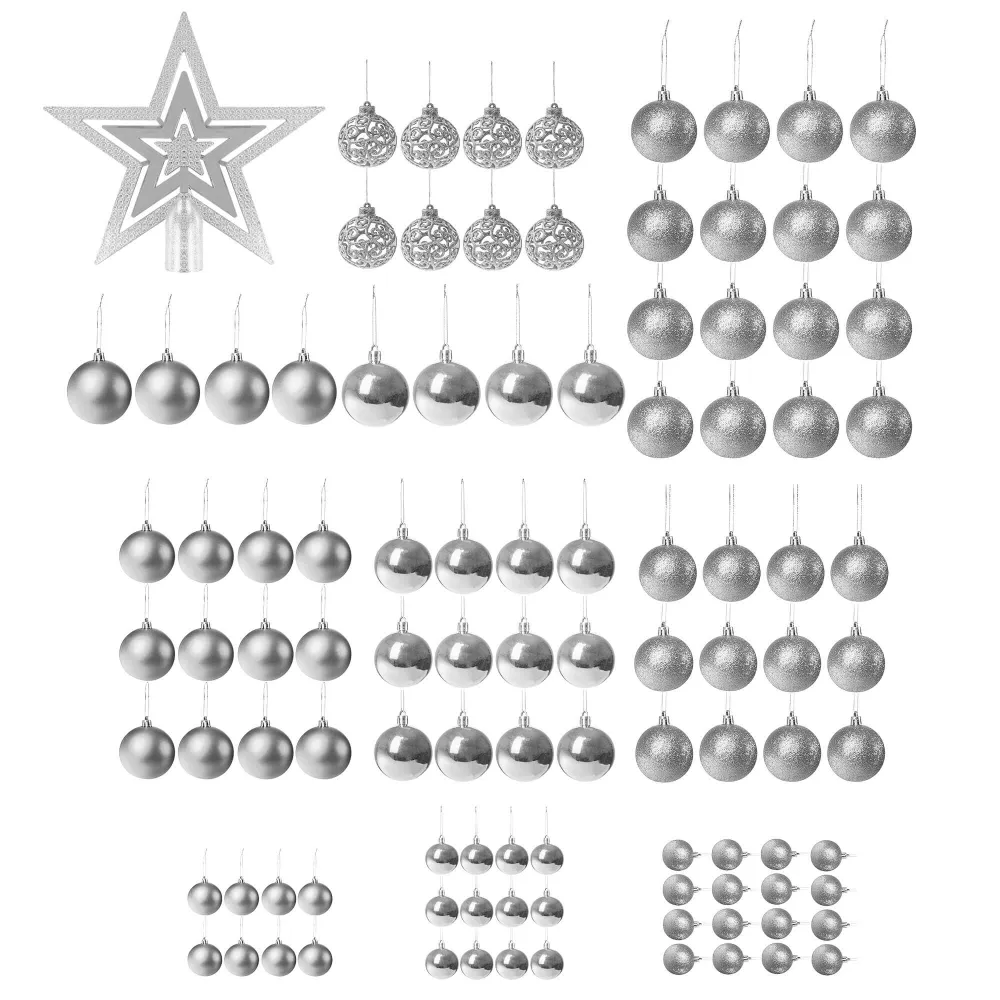 Luxusná 101 dielna sada vianočných ozdôb na stromček. Set tvoria rôzne motívy a veľkosti strieborných baniek doplnené o prekrásnu hviezdu. Všetko z nerozbitného plastového materiálu. Ideálne na výzdobu stromčeka alebo ako vianočné dekorácie. Zadarmo zlaté povrázky pre ľahké zavesenie.