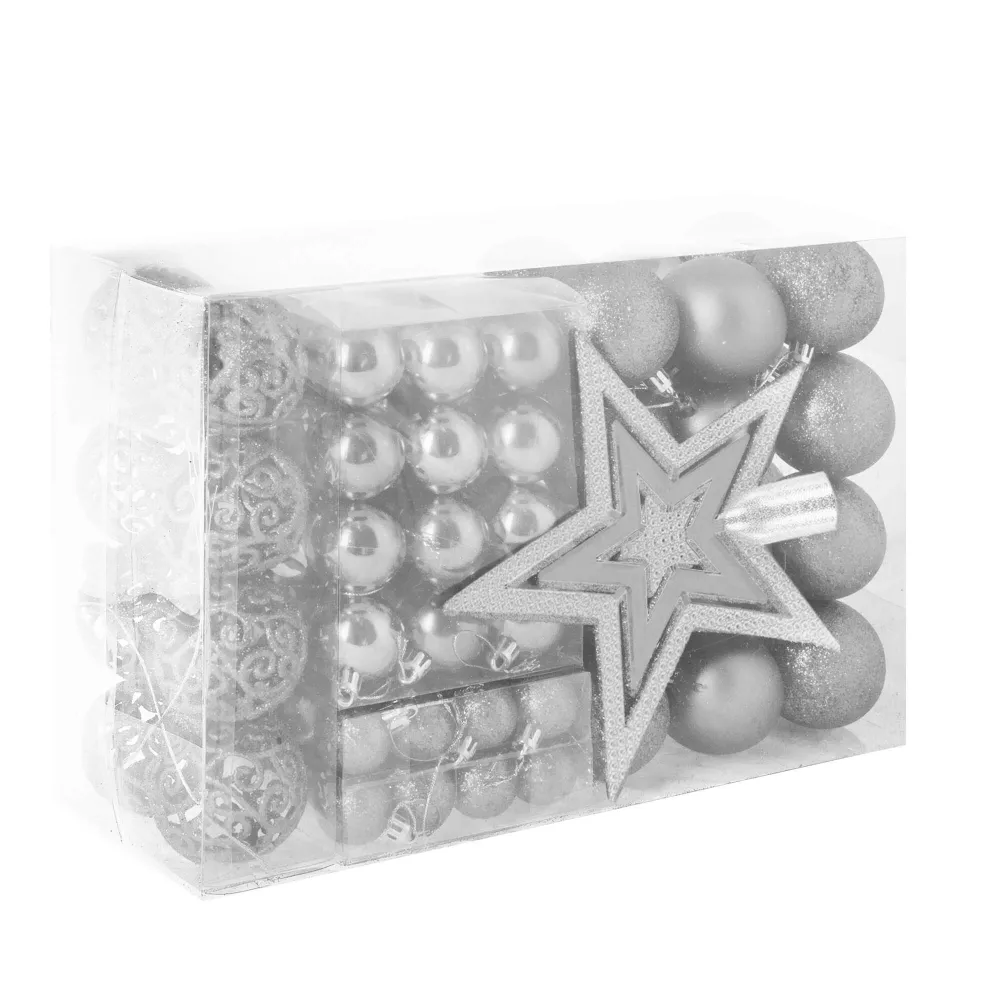 Luxusná 101 dielna sada vianočných ozdôb na stromček. Set tvoria rôzne motívy a veľkosti strieborných baniek doplnené o prekrásnu hviezdu . Všetko z nerozbitného plastového materiálu. Ideálne na výzdobu stromčeka alebo ako vianočné dekorácie. Zadarmo zlaté povrázky pre ľahké zavesenie.