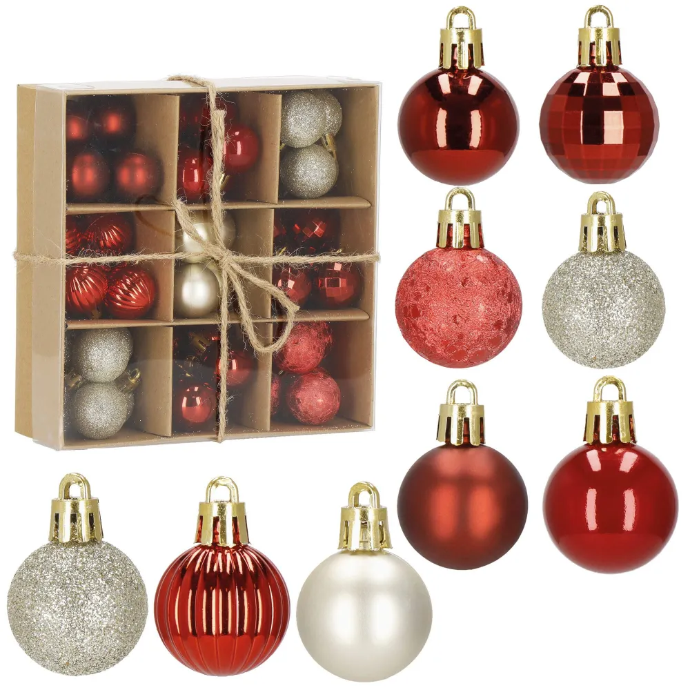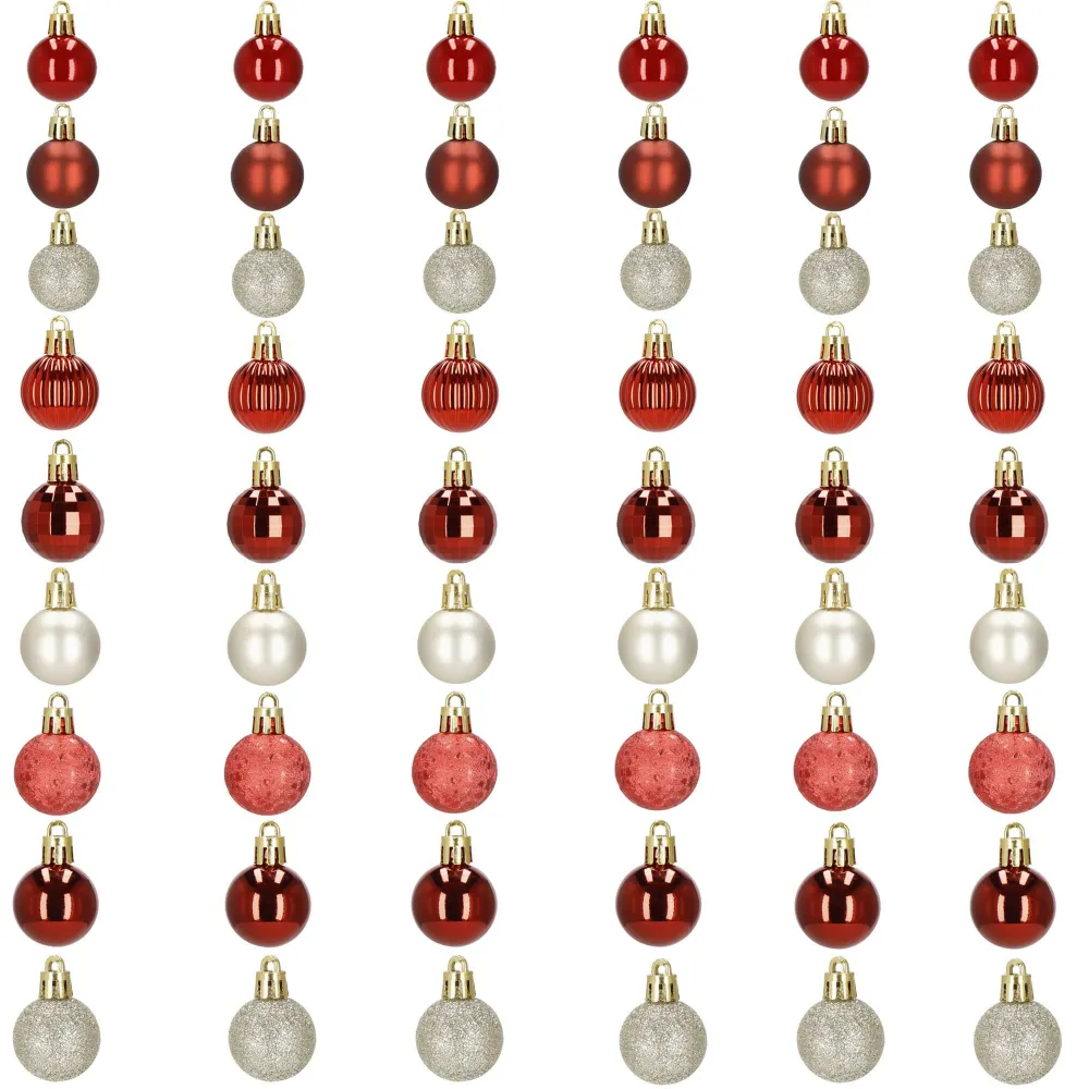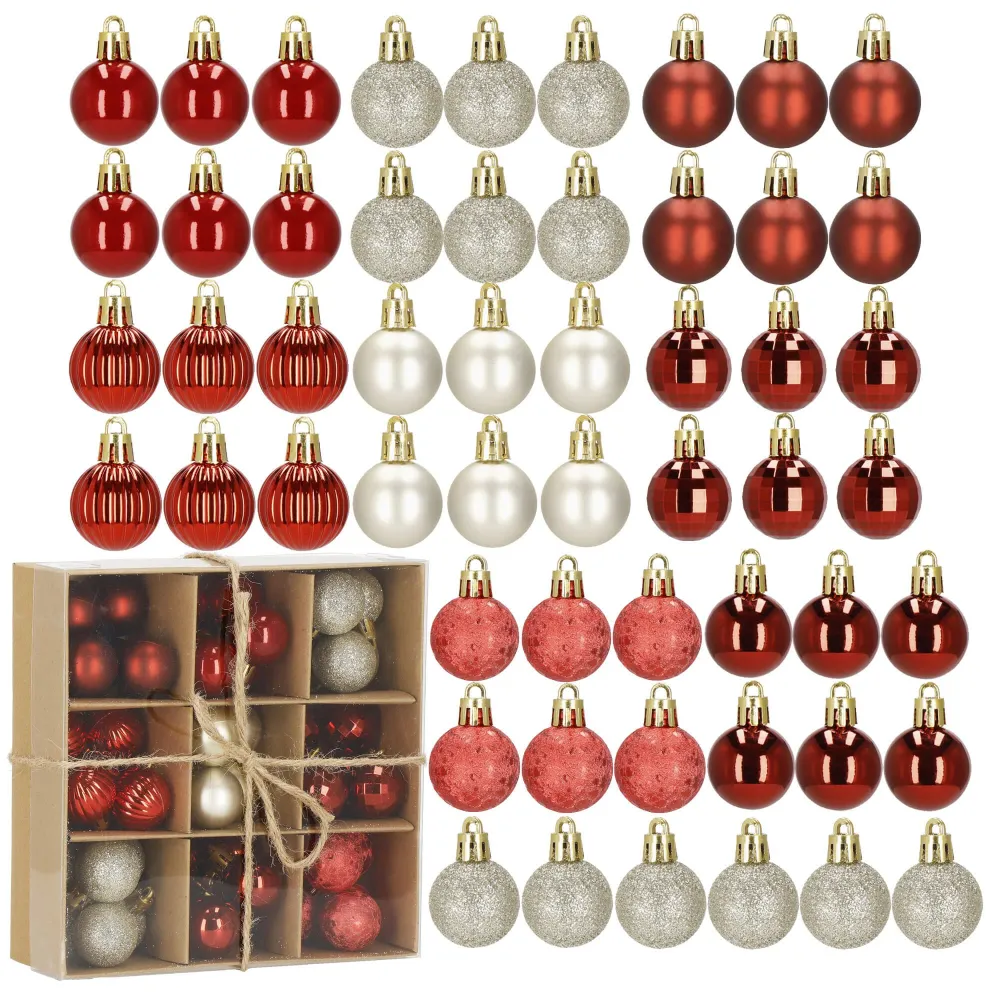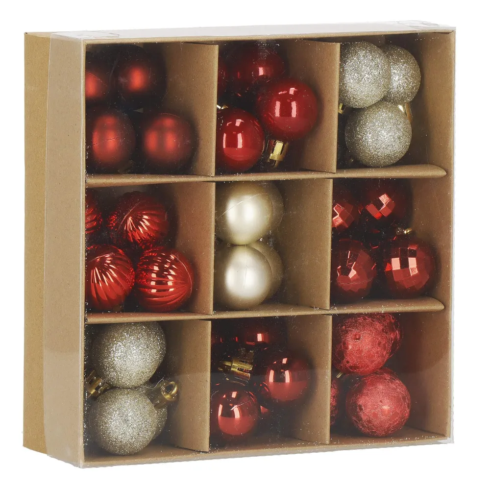 Maxi sada 54 ks červeno-zlatých baniek na stromček s piatimi rôznymi vzormi. Priemer banky 3 cm, pútko na zavesenie, nerozbitný plastový materiál. Kúzelné ozdoby na zavesenie na stromček alebo ako vianočné dekorácie. Zadarmo povrázky pre ľahké zavesenie.
