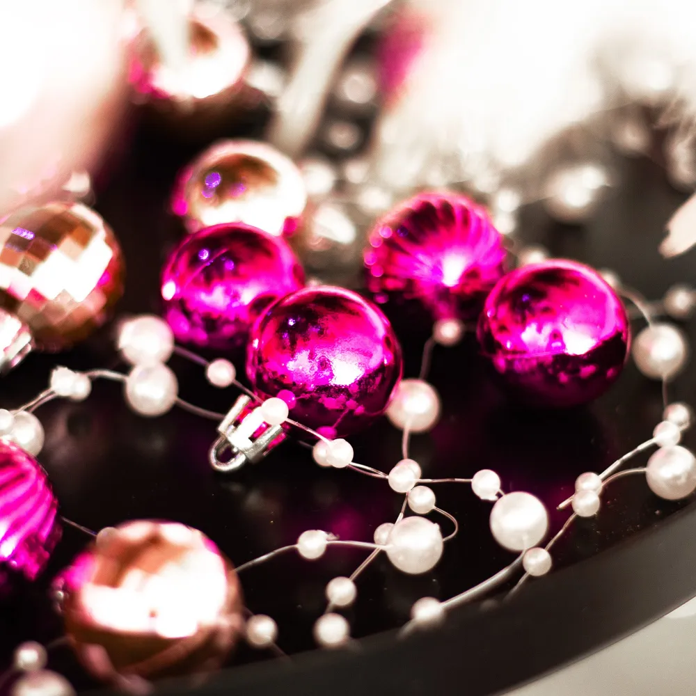 Maxi sada 54 ks ružovo-zlatých baniek na stromček s piatimi rôznymi vzormi. Priemer banky 3 cm, pútko na zavesenie, nerozbitný plastový materiál. Krásna ozdoba vianočného stromčeka alebo ako vianočná dekorácia. Zadarmo povrázky pre ľahké zavesenie.