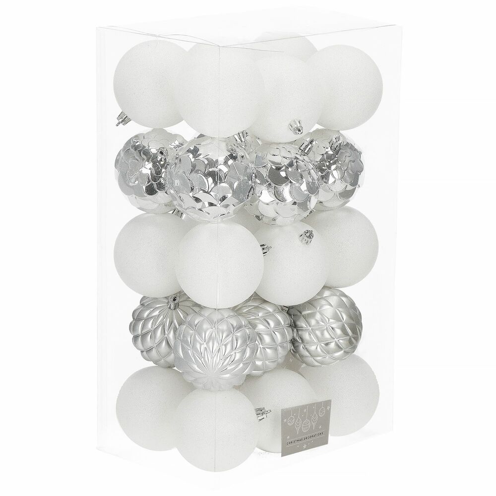 Sada 30 ks bielo-strieborných baniek na stromček so štyrmi rôznymi vzormi. Priemer banky 8 cm, pútko na zavesenie, nerozbitný plastový materiál. Decentné ozdoby na stromček alebo ako vianočné dekorácie na dotvorenie vianočnej atmosféry. Zadarmo povrázky pre ľahké zavesenie.