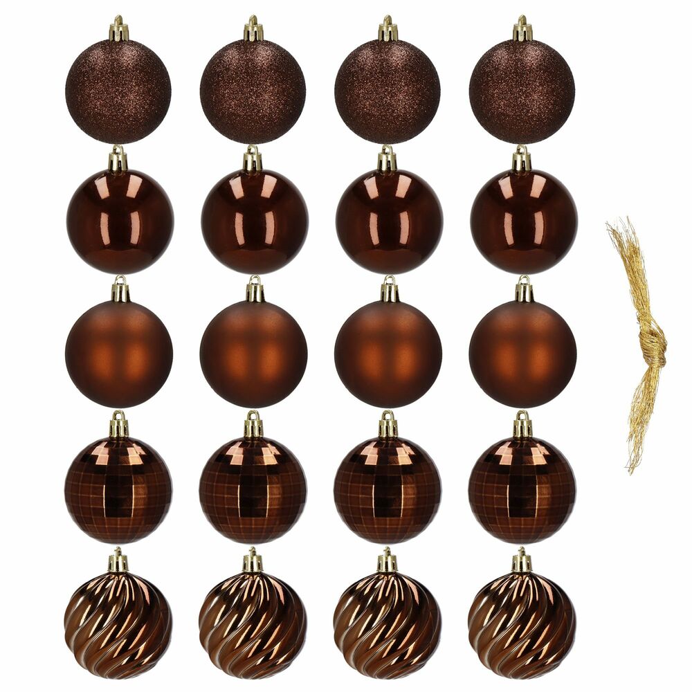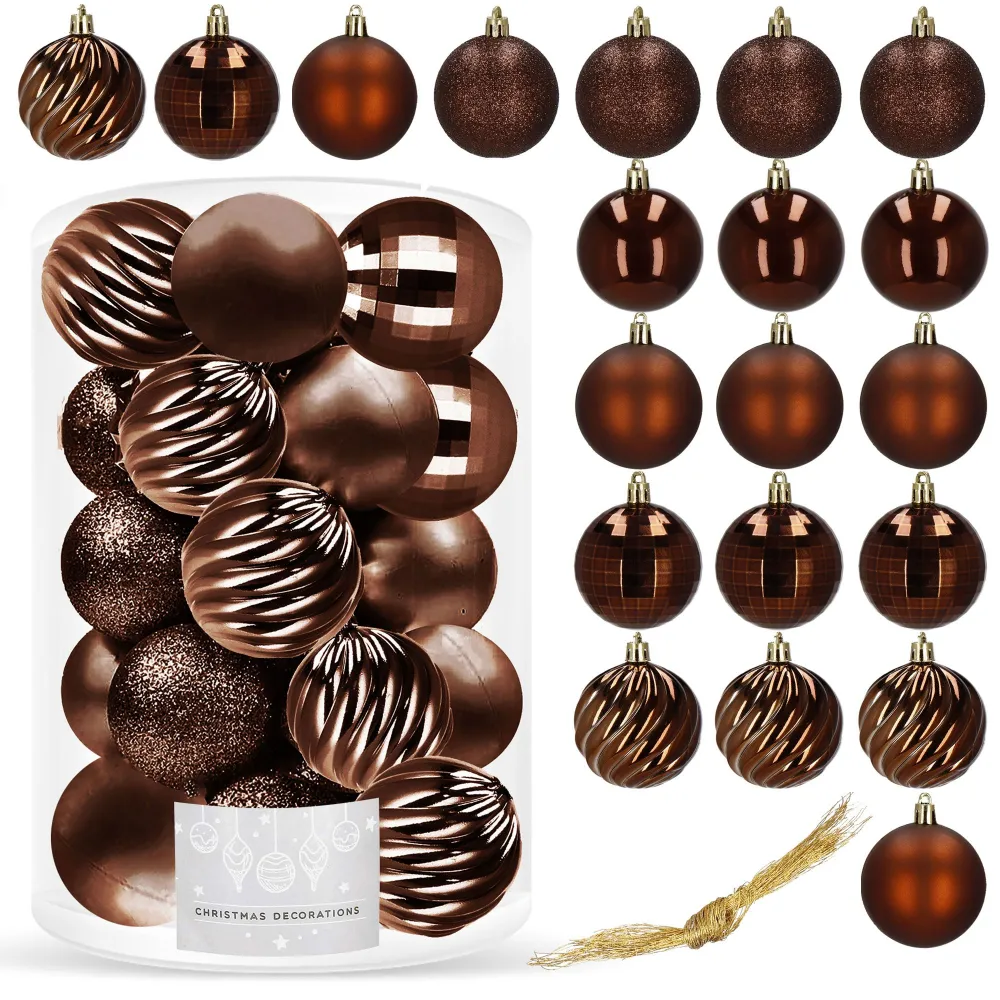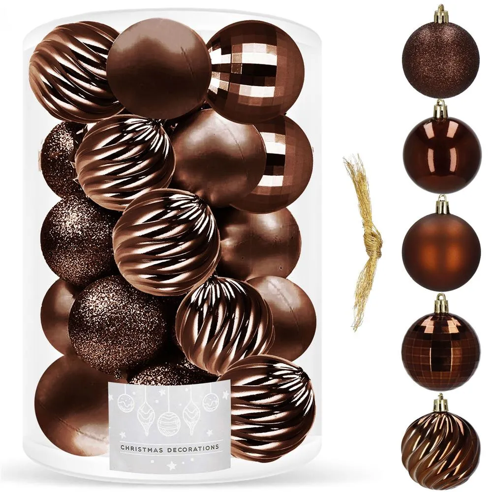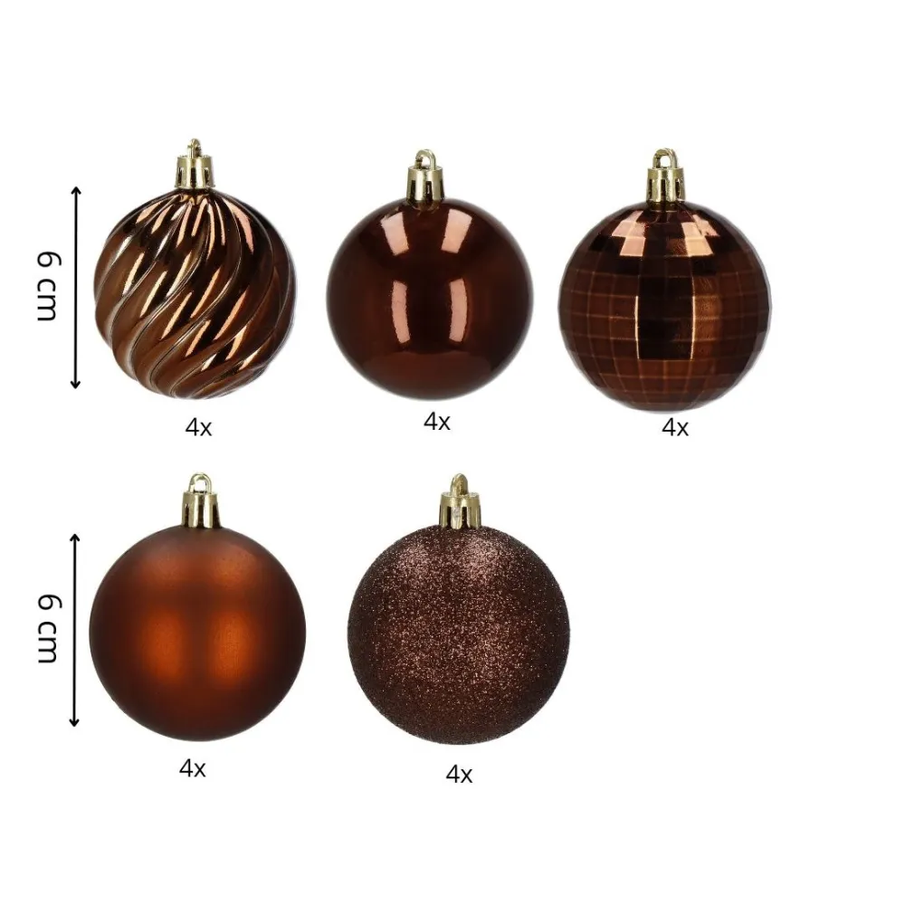 Sada 20 ks hnedých baniek na stromček s piatimi rôznymi vzormi. Priemer banky 6 cm, pútko na zavesenie, nerozbitný plastový materiál. Krásne ozdoby na zavesenie na vianočný stromček alebo ako vianočné dekorácie. Zadarmo povrázky pre ľahké zavesenie.