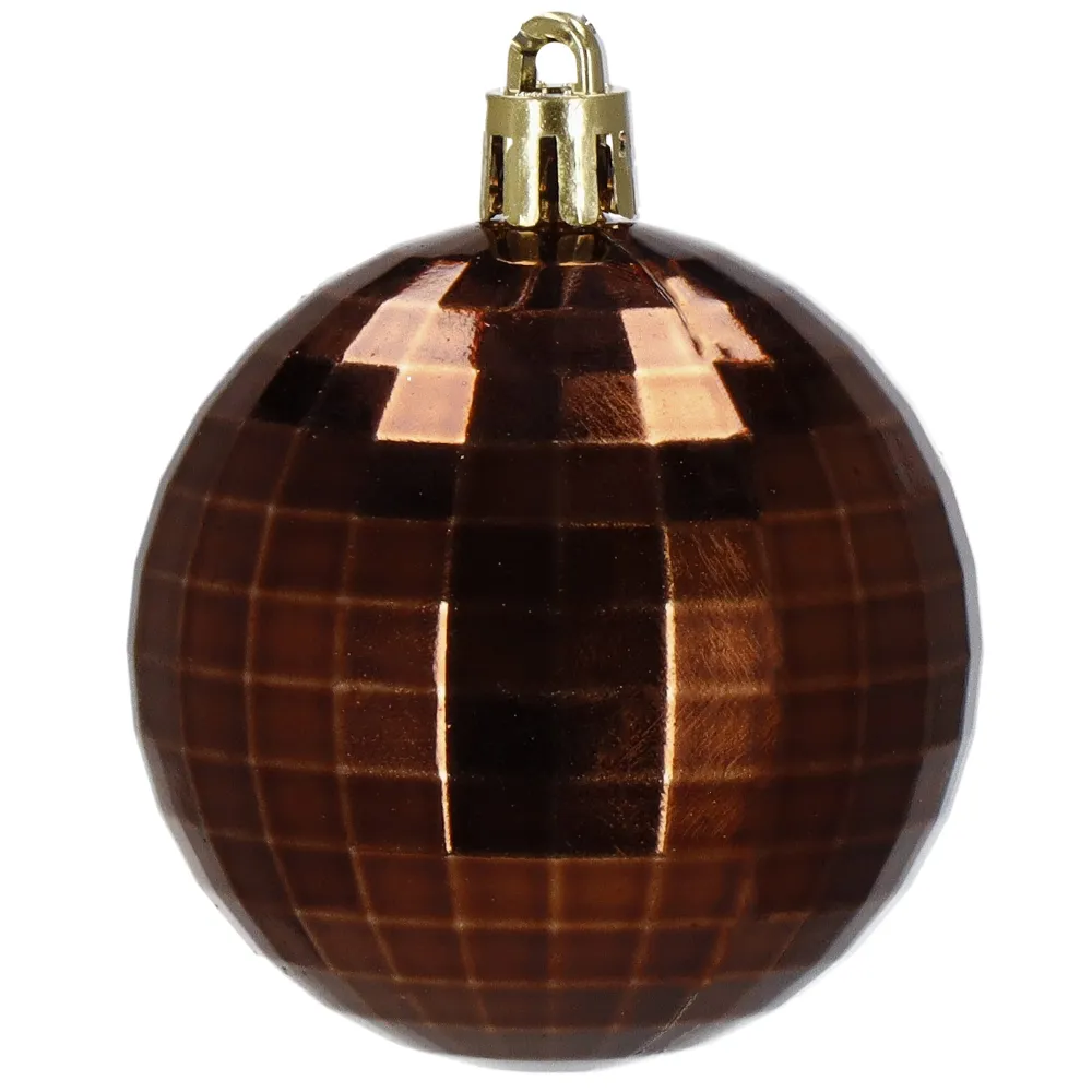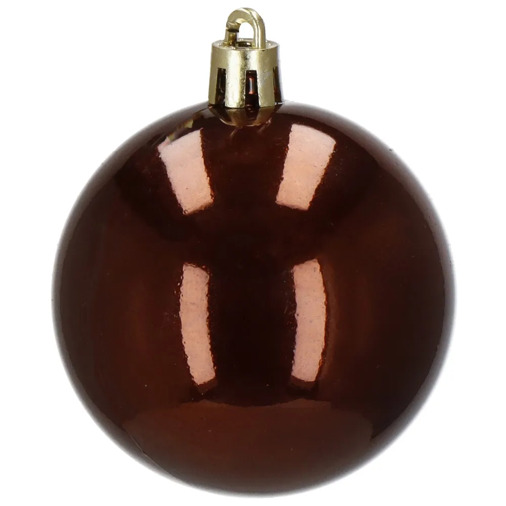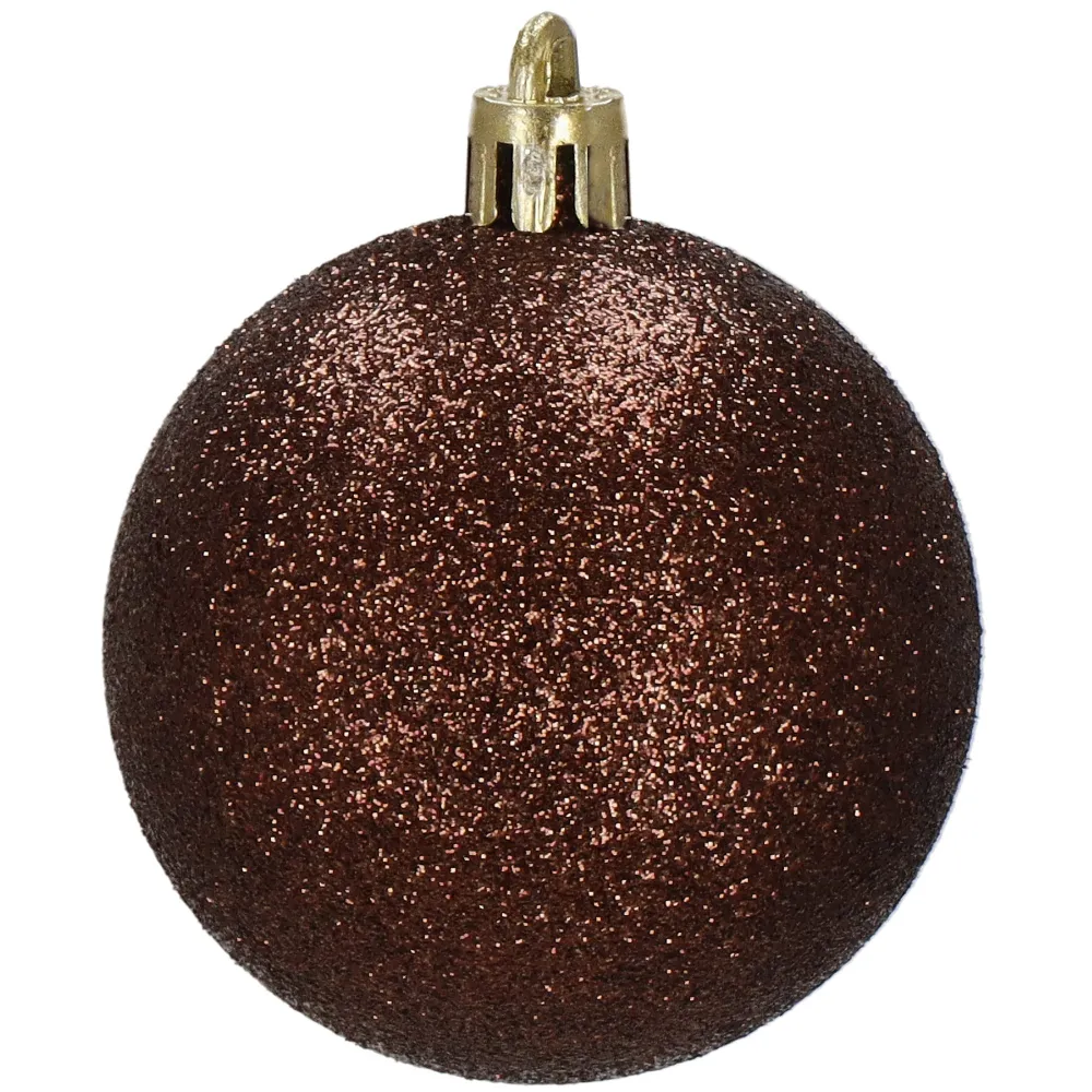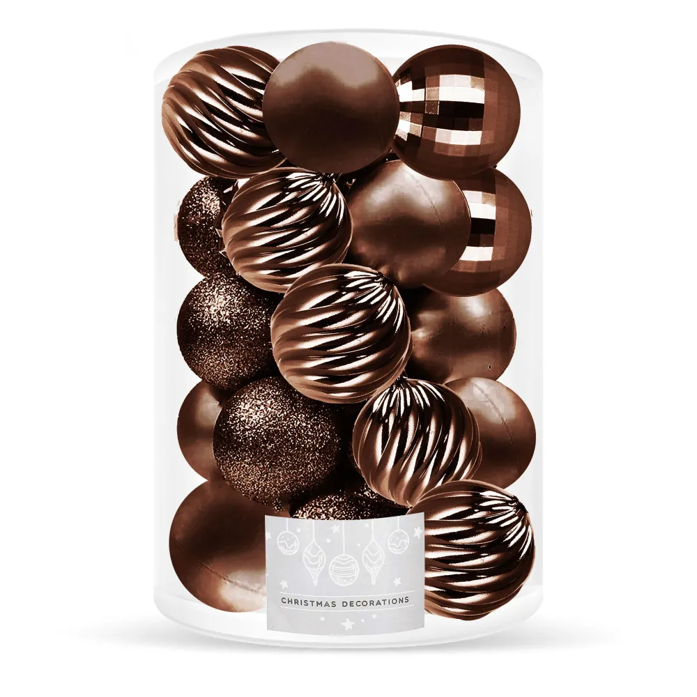 Sada 20 ks hnedých baniek na stromček s piatimi rôznymi vzormi. Priemer banky 6 cm, pútko na zavesenie, nerozbitný plastový materiál. Krásne ozdoby na zavesenie na vianočný stromček alebo ako vianočné dekorácie. Zadarmo povrázky pre ľahké zavesenie.