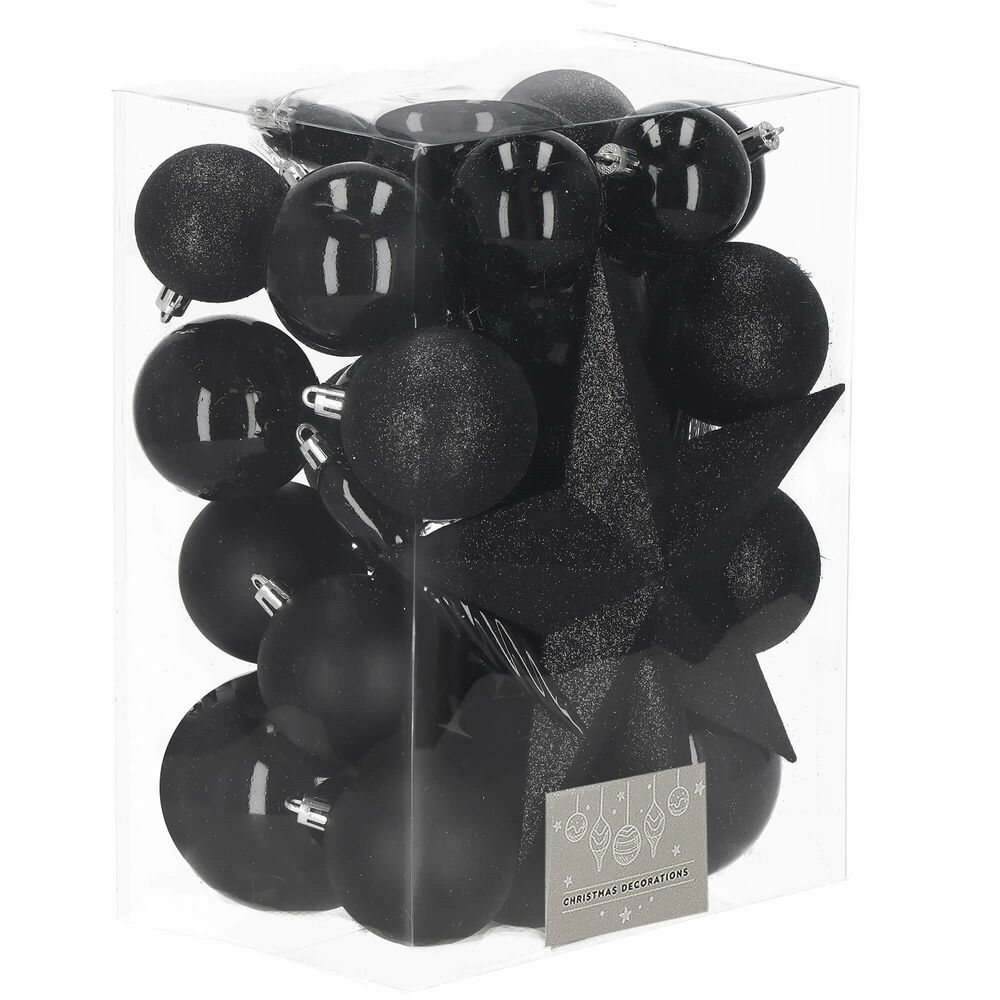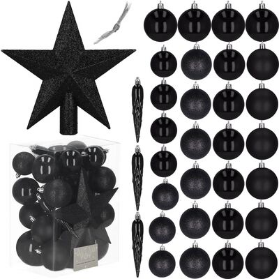 Luxusná 33 dielna sada vianočných ozdôb na stromček. Set tvoria 3 rôzne vzory ozdôb čiernej farby + prekrásna hviezda na špičku stromčeka. Všetko z nerozbitného plastového materiálu. Ideálne na výzdobu stromčeka alebo ako vianočné dekorácie. Zadarmo povrázky pre ľahké zavesenie.