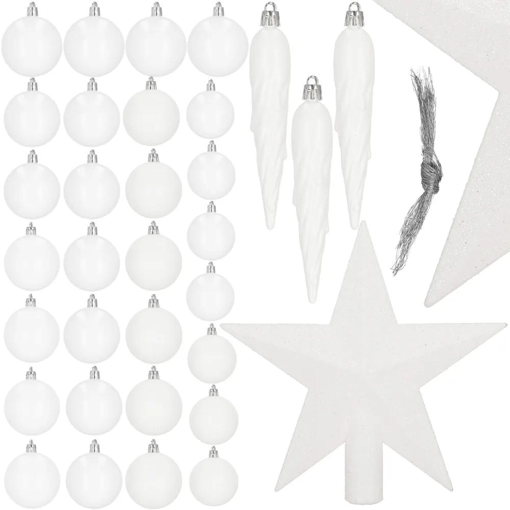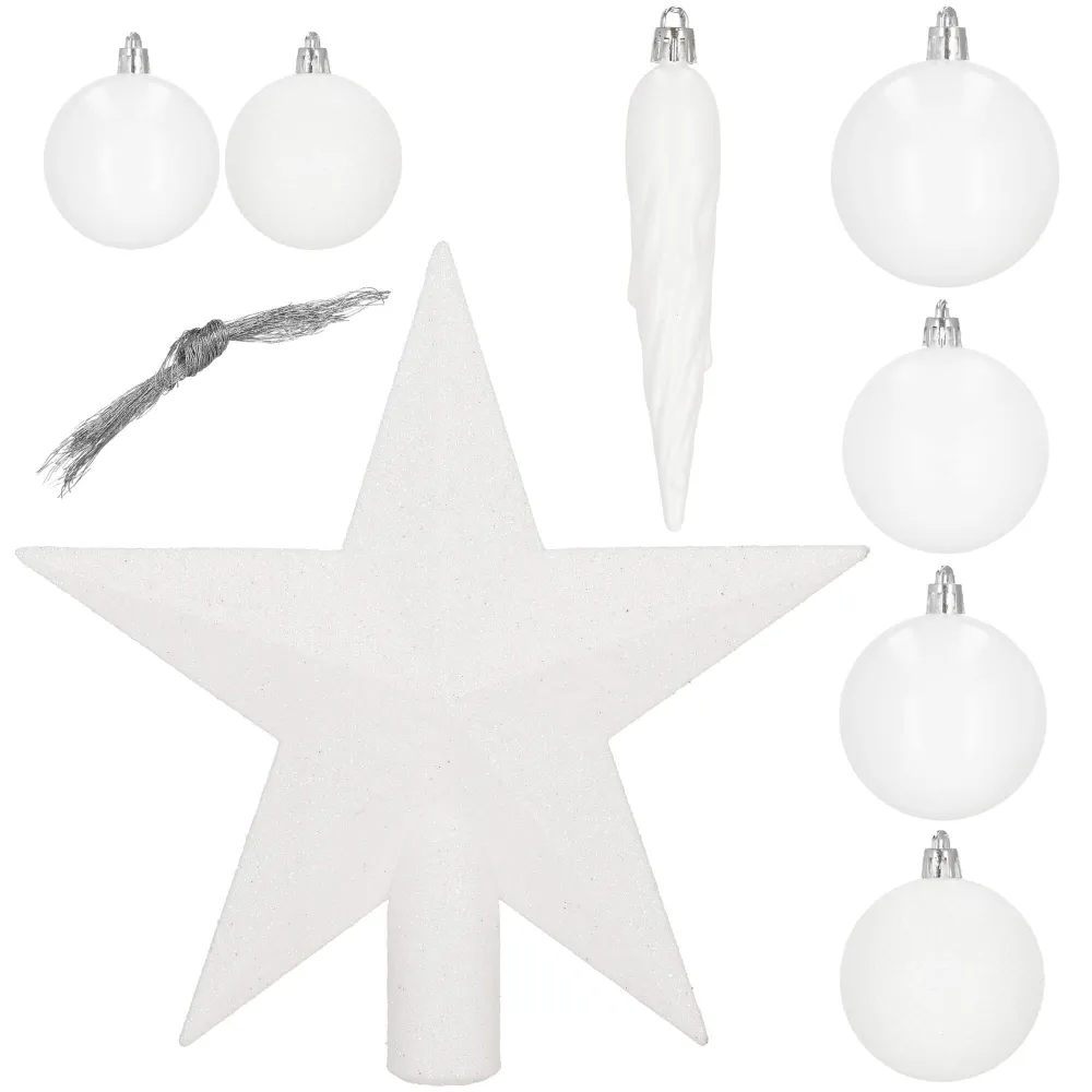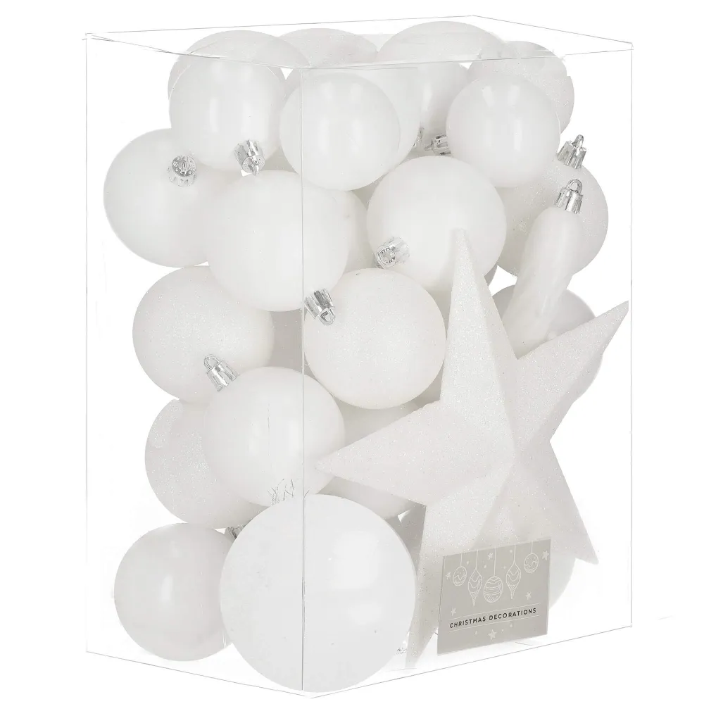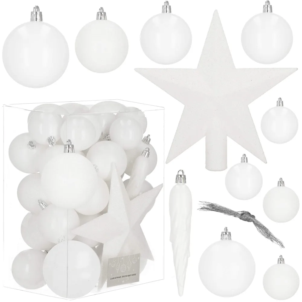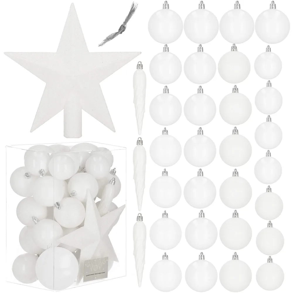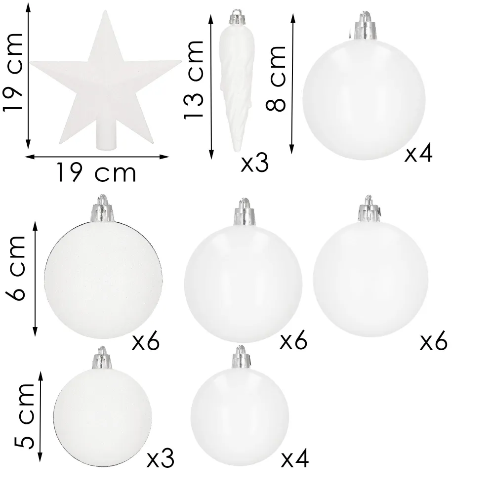 Luxusná 33 dielna sada vianočných ozdôb na stromček. Set tvoria 3 rôzne vzory ozdôb bielej farby + prekrásna hviezda na špičku stromčeka. Všetko z nerozbitného plastového materiálu. Ideálne na výzdobu stromčeka alebo ako vianočné dekorácie. Zadarmo povrázky pre ľahké zavesenie.
