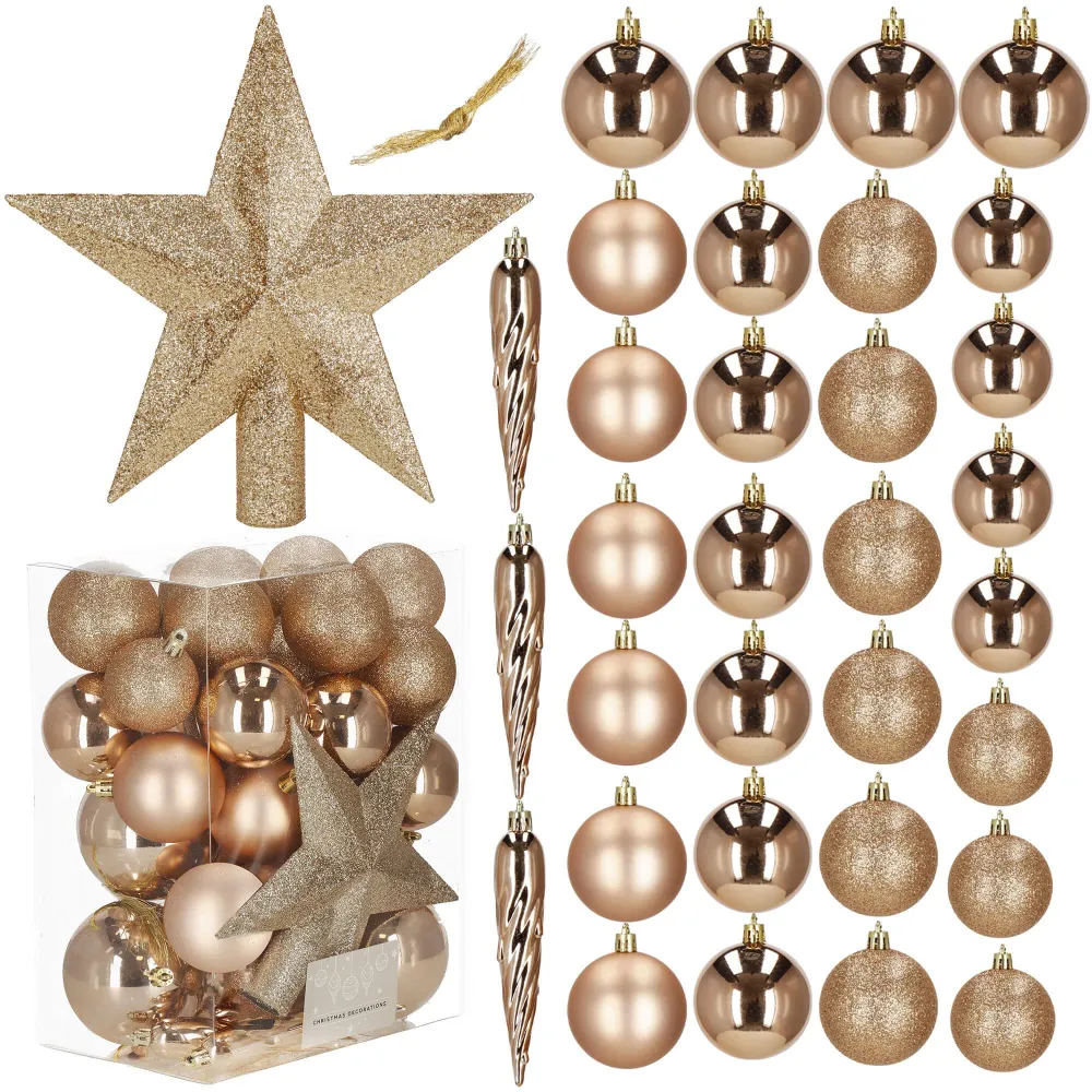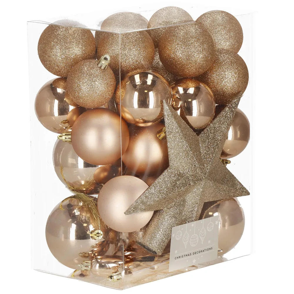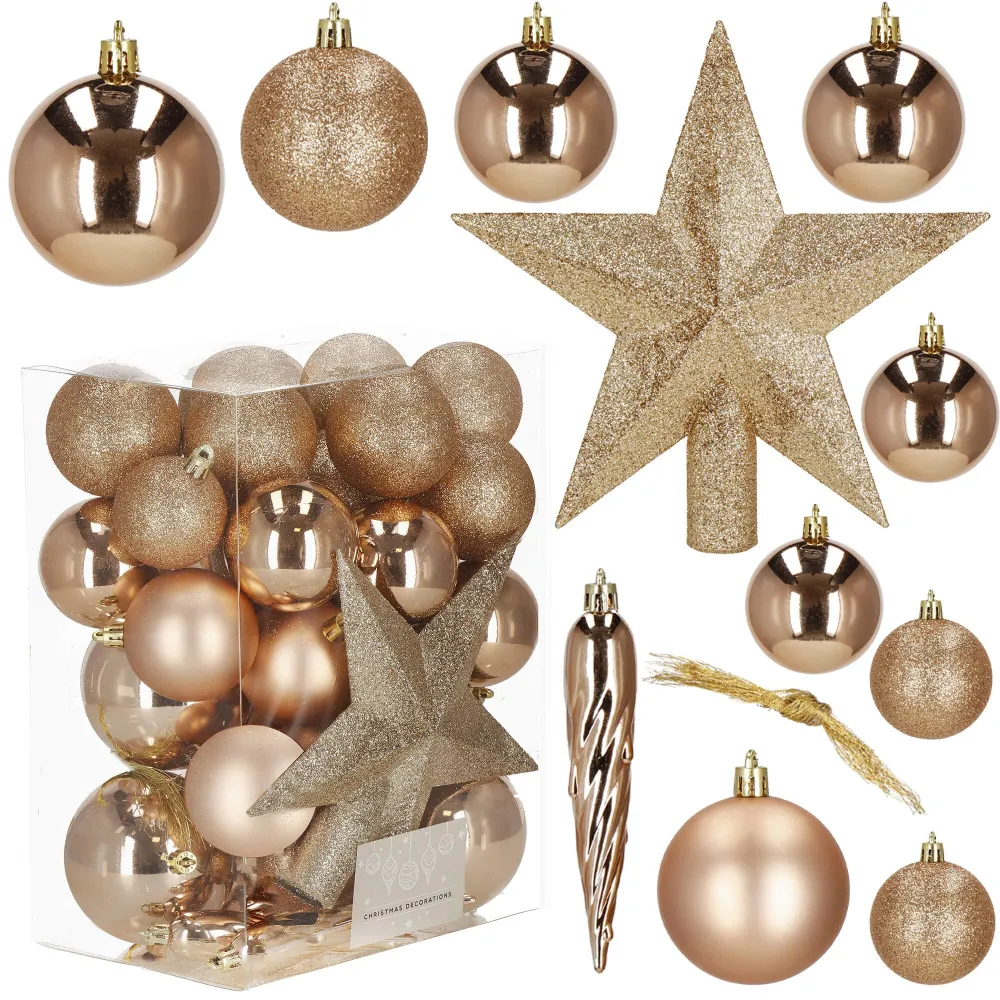 Luxusná 33 dielna sada vianočných ozdôb na stromček. Set tvoria 3 rôzne vzory ozdôb zlatej farby + prekrásna hviezda na špičku stromčeka. Všetko z nerozbitného plastového materiálu. Ideálne na výzdobu stromčeka alebo ako vianočné dekorácie. Zadarmo povrázky pre ľahké zavesenie.