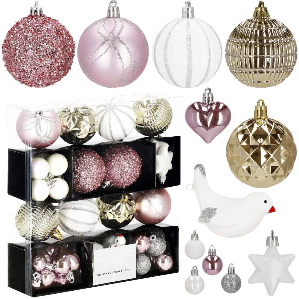 Kúzelná 38 dielna sada vianočných ozdôb na stromček. Set tvoria 4 rôzne vzory ozdôb bielej, zlatej a ružovej farby. Všetko z nerozbitného plastového materiálu. Ideálne na výzdobu stromčeka alebo ako vianočné dekorácie. Zadarmo povrázky pre ľahké zavesenie.