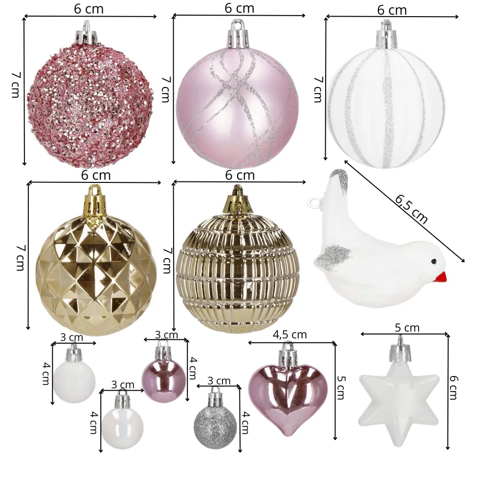 Kúzelná 38 dielna sada vianočných ozdôb na stromček. Set tvoria 4 rôzne vzory ozdôb bielej, zlatej a ružovej farby. Všetko z nerozbitného plastového materiálu. Ideálne na výzdobu stromčeka alebo ako vianočné dekorácie. Zadarmo povrázky pre ľahké zavesenie.