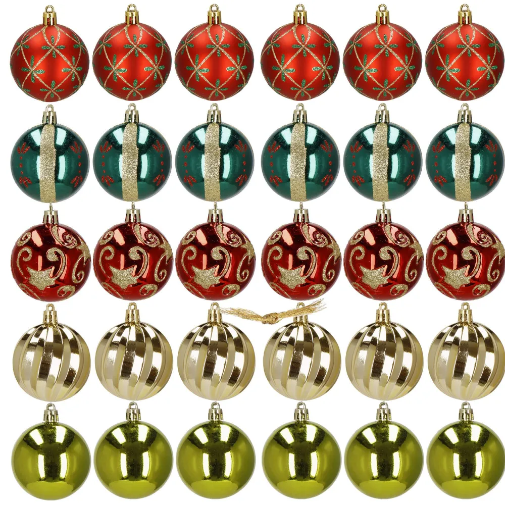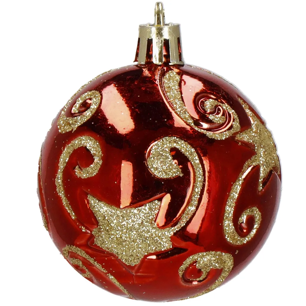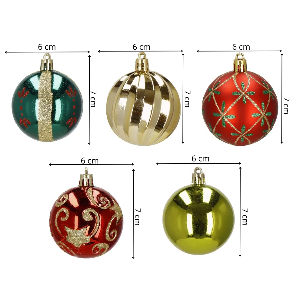 Sada 30 ks červeno-zlatých baniek na stromček so štyrmi rôznymi vzormi. Priemer banky 6 cm, pútko na zavesenie, nerozbitný plastový materiál. Ideálna ako vianočná ozdoba stromčeka alebo ako vianočná dekorácia. Zadarmo povrázky pre ľahké zavesenie.