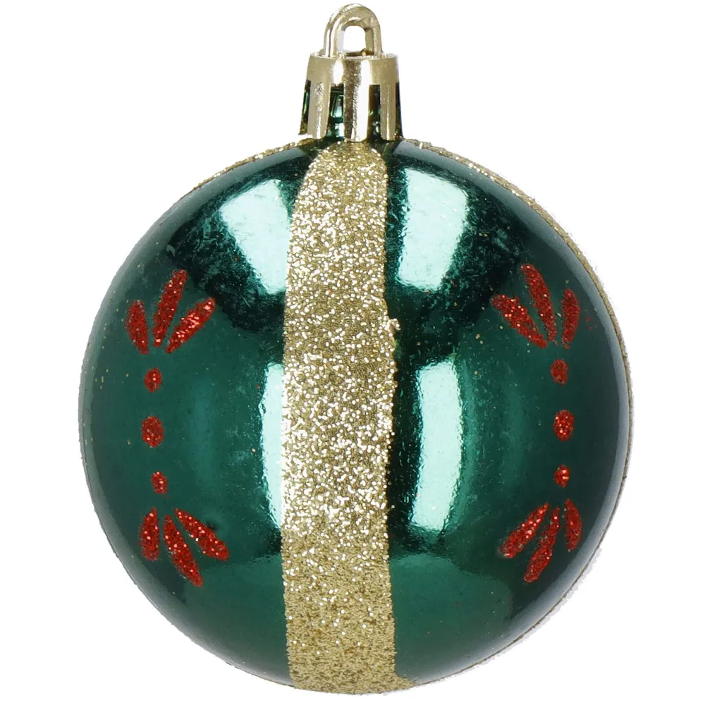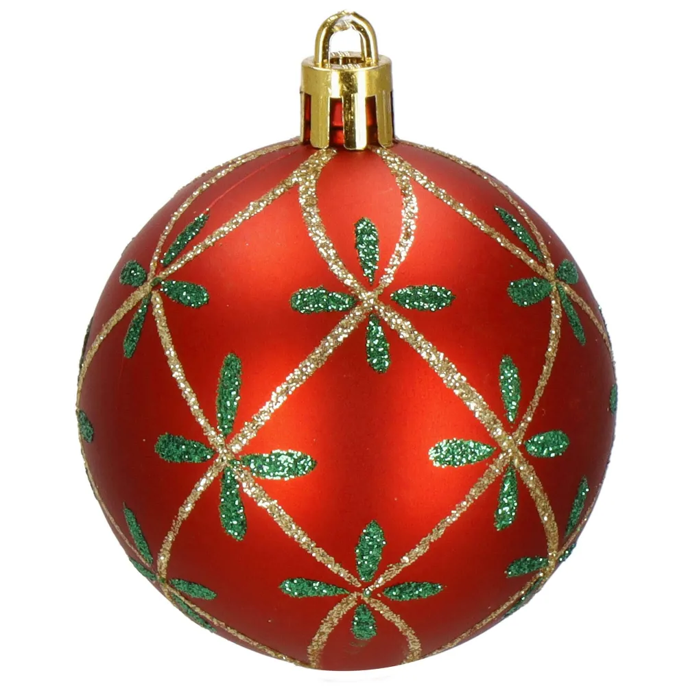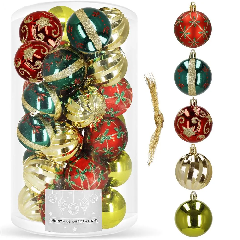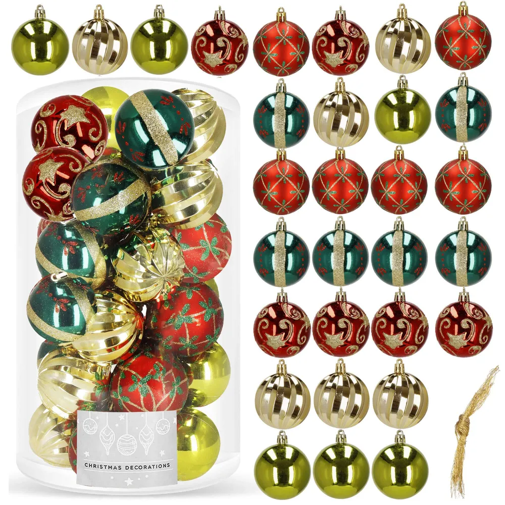 Sada 30 ks červeno-zlatých baniek na stromček so štyrmi rôznymi vzormi. Priemer banky 6 cm, pútko na zavesenie, nerozbitný plastový materiál. Ideálna ako vianočná ozdoba stromčeka alebo ako vianočná dekorácia. Zadarmo povrázky pre ľahké zavesenie.