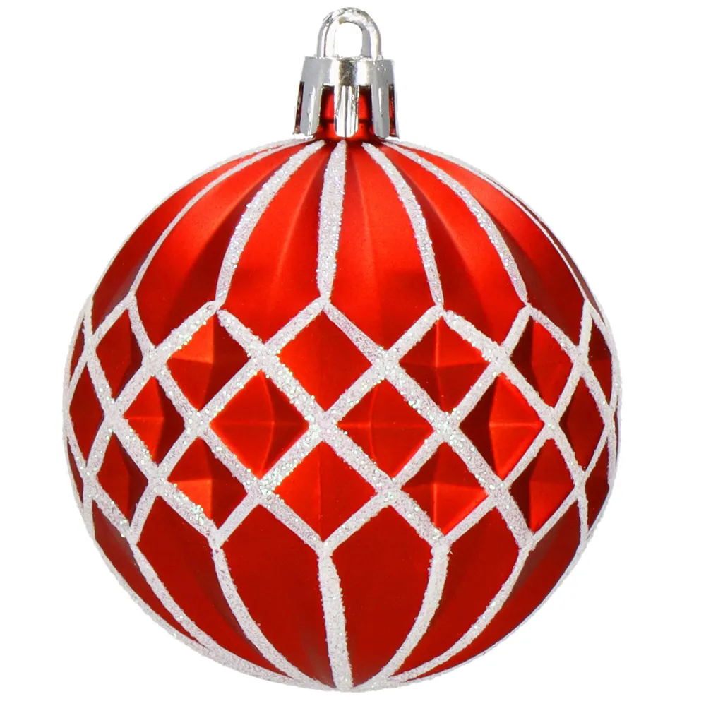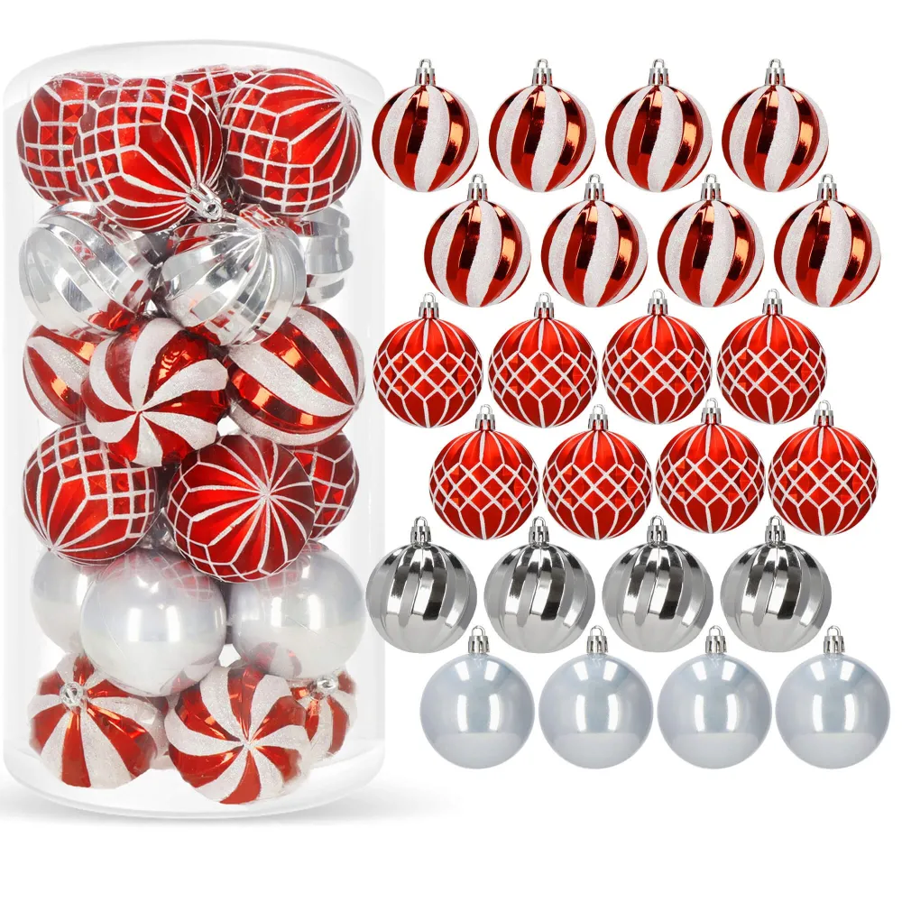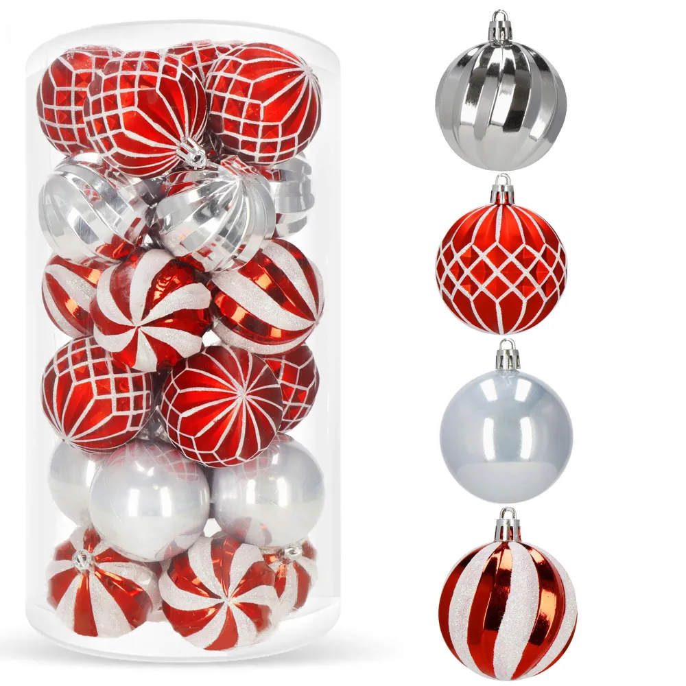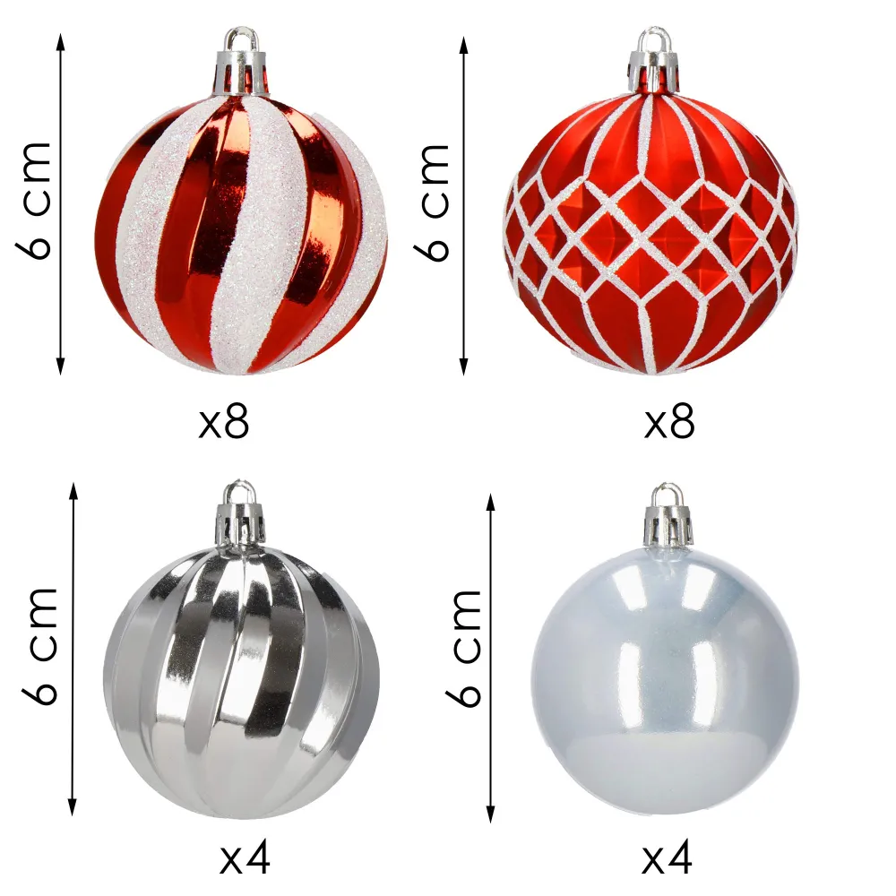 Sada 24 ks červeno-strieborných baniek na stromček s tromi rôznymi vzormi. Priemer banky 6 cm, pútko na zavesenie, nerozbitný plastový materiál. Kúzelné ako vianočná ozdoba na zavesenie na stromček alebo ako vianočné dekorácie. Zadarmo povrázky pre ľahké zavesenie.