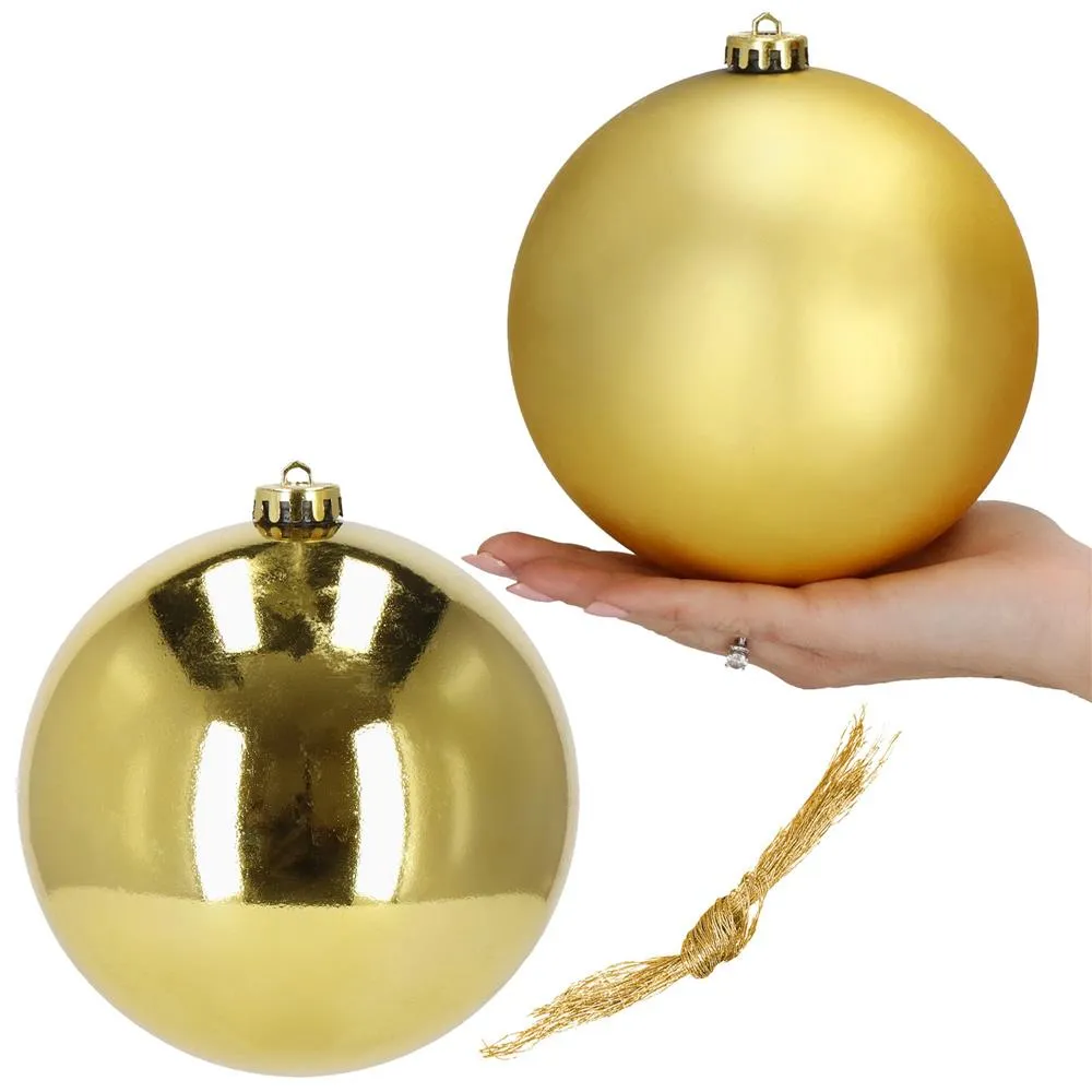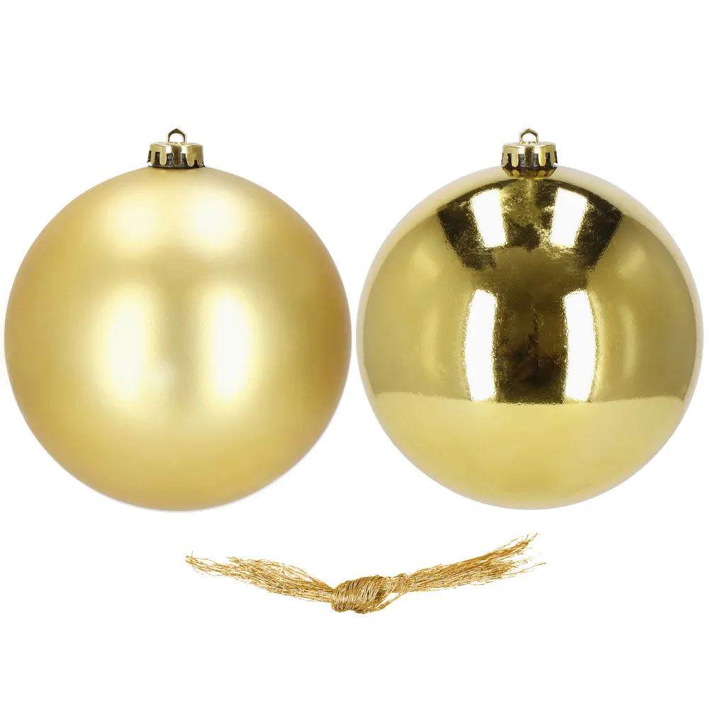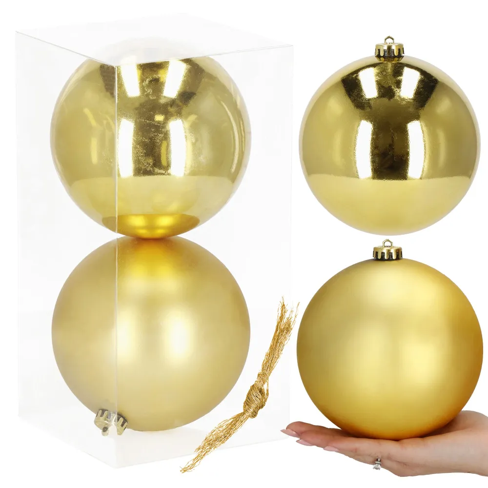 Súprava 2 ks XXL zlatých baniek na stromček s dvoma rôznymi vzormi. Priemer banky 15 cm, pútko na zavesenie, nerozbitný plastový materiál. Ideálna ako vianočná ozdoba stromčeka alebo ako vianočná dekorácia. Zadarmo povrázky pre ľahké zavesenie.