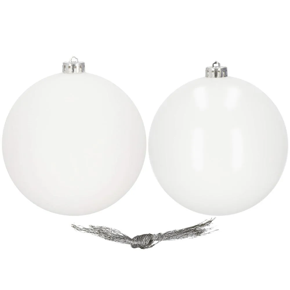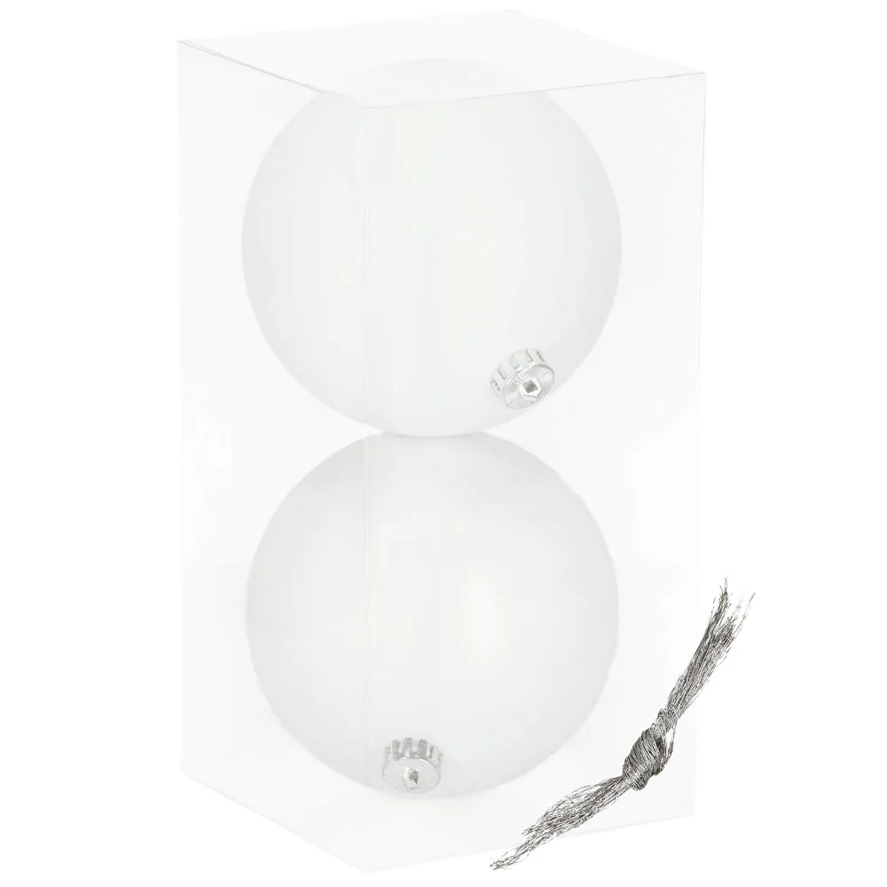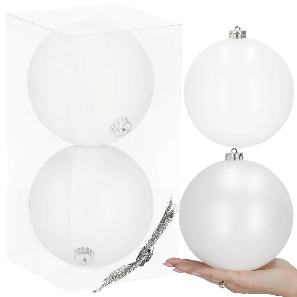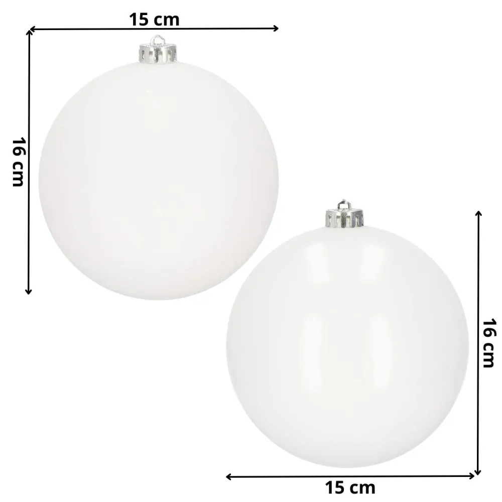 Sada 2 ks XXL bielych baniek na stromček s dvoma rôznymi vzormi. Priemer banky 15 cm, pútko na zavesenie, nerozbitný plastový materiál. Ideálna vianočná ozdoba stromčeka alebo ako vianočná dekorácia. Zadarmo povrázky pre ľahké zavesenie.
