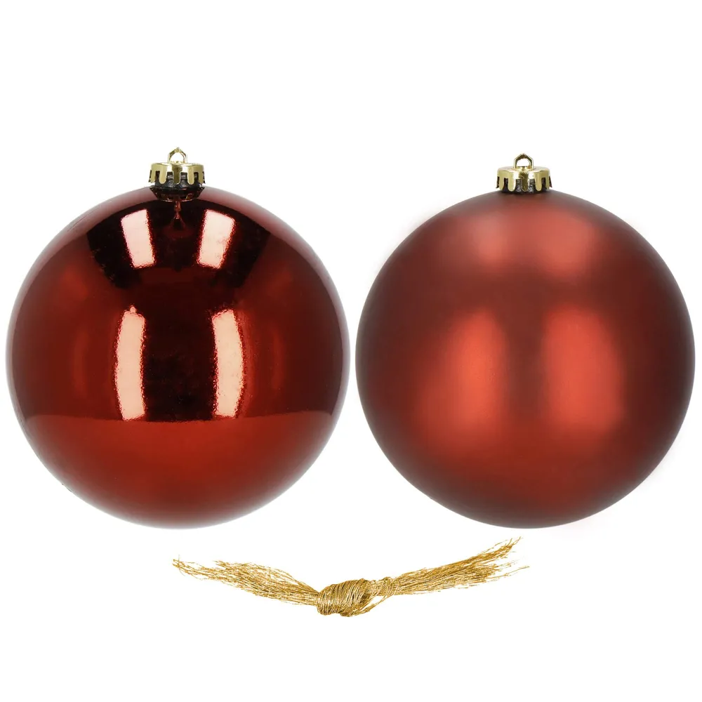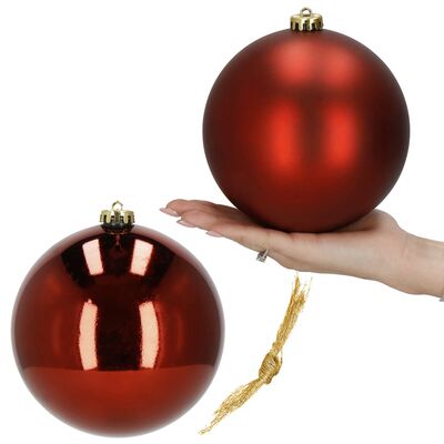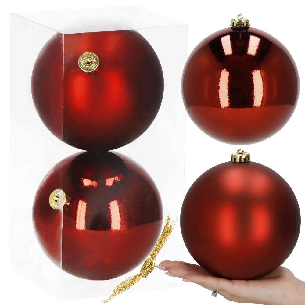 Súprava 2 ks XXL červených baniek na stromček s dvoma rôznymi vzormi. Priemer banky 15 cm, pútko na zavesenie, nerozbitný plastový materiál. Ideálna ako vianočná ozdoba stromčeka alebo ako vianočná dekorácia. Zadarmo povrázky pre ľahké zavesenie.