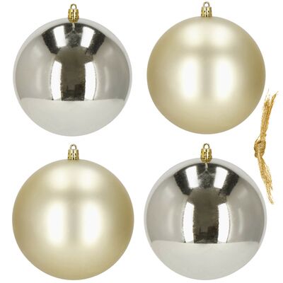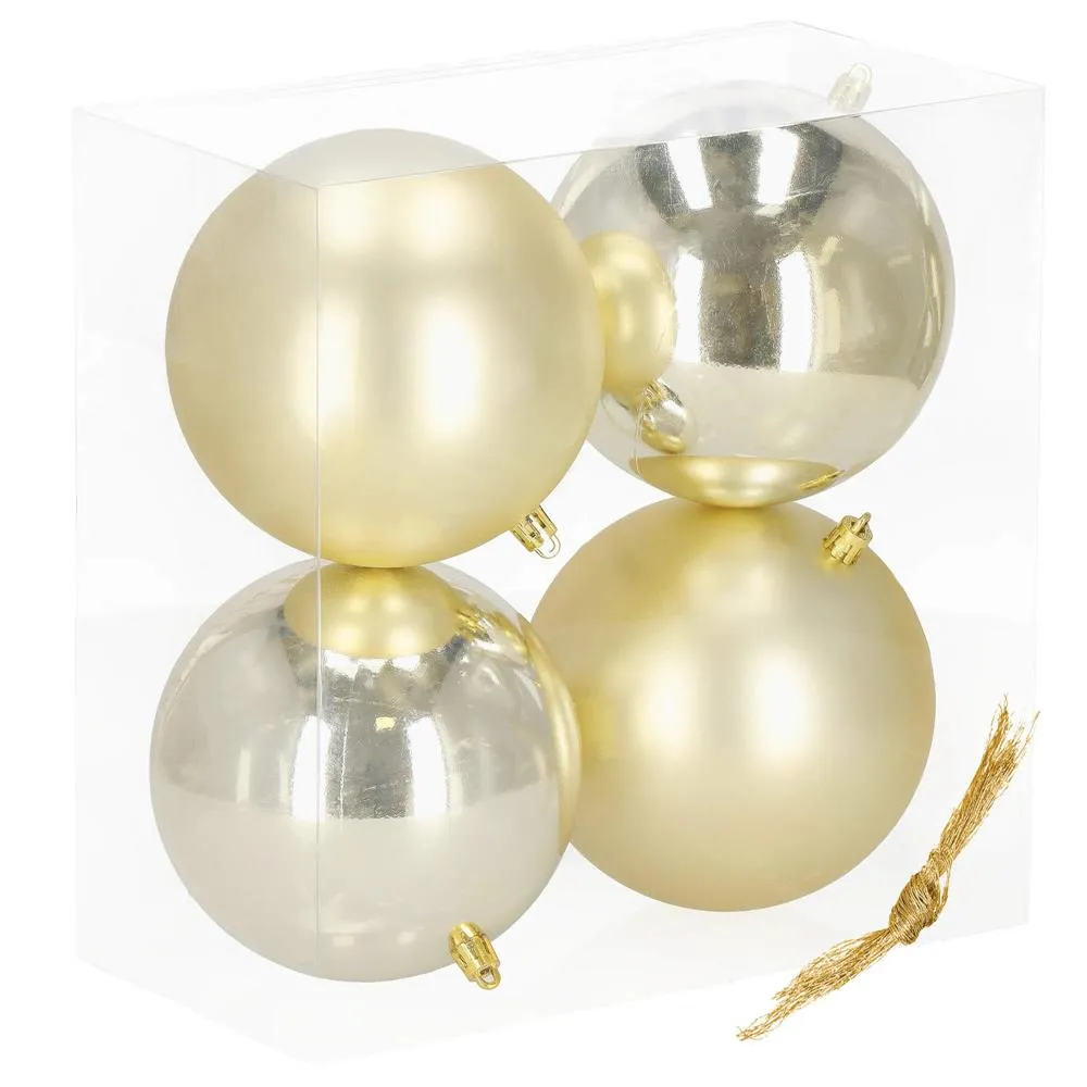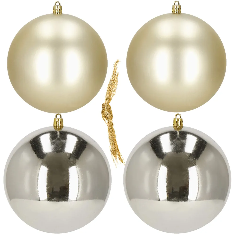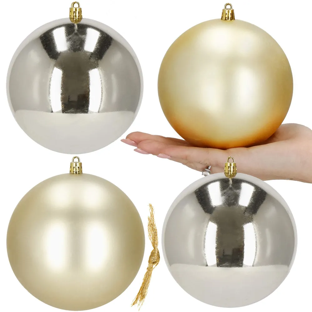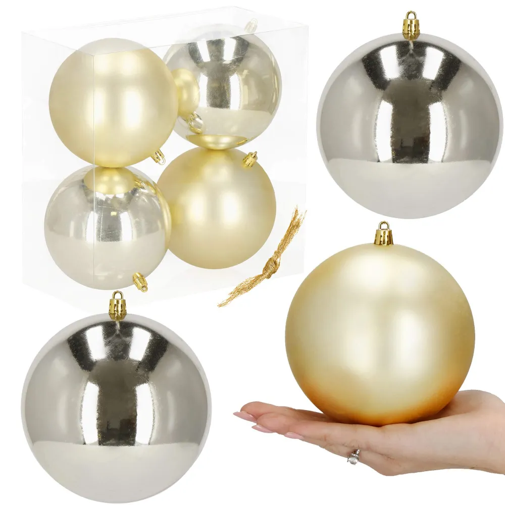 Sada 4 ks XL zlato-strieborných baniek na stromček s dvoma rôznymi vzormi. Priemer banky 12 cm, pútko na zavesenie, nerozbitný plastový materiál. Krásna vianočná ozdoba stromčeka alebo ako vianočná dekorácia. Zadarmo povrázky pre ľahké zavesenie.