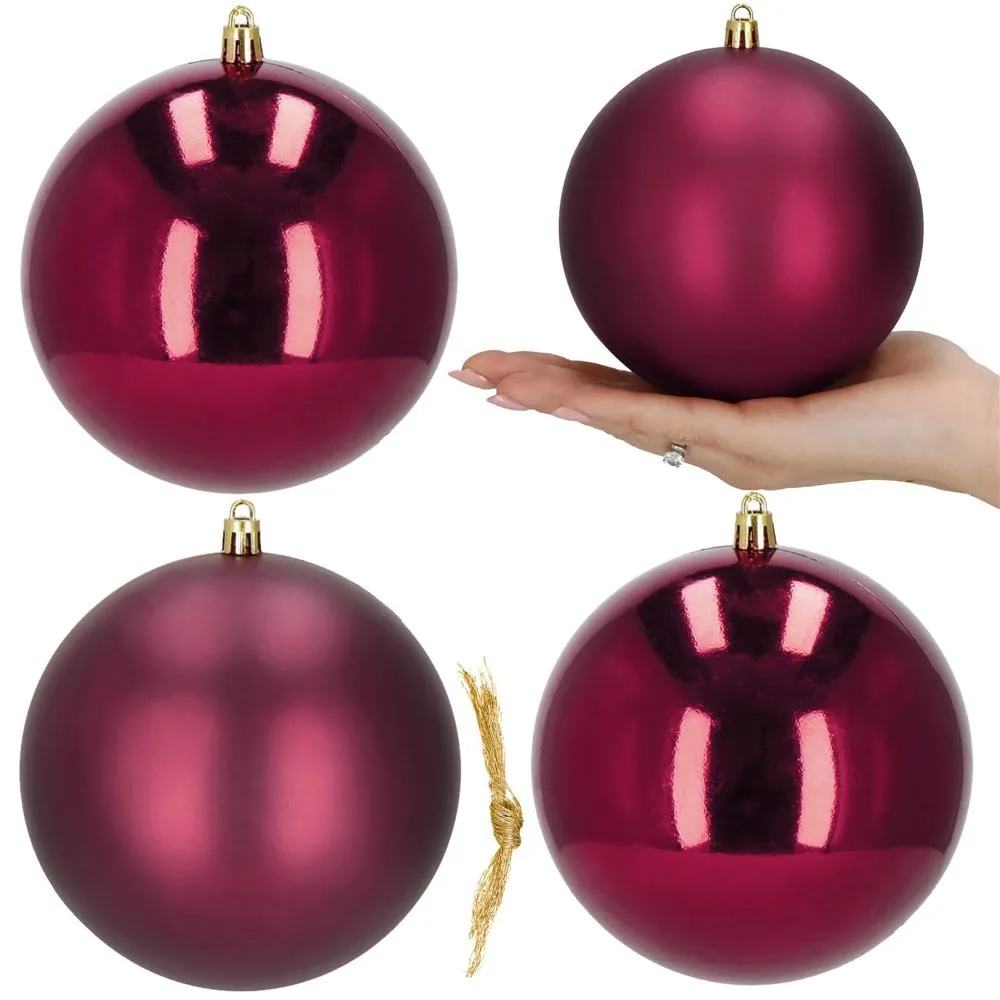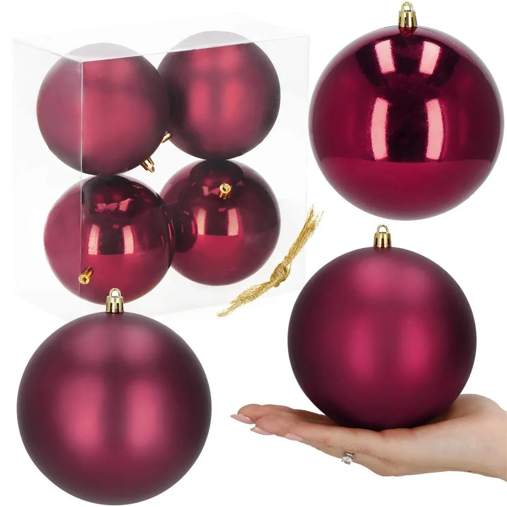 Sada 4 ks XL vínových baniek na stromček s dvoma rôznymi vzormi. Priemer banky 12 cm, pútko na zavesenie, nerozbitný plastový materiál. Krásna ozdoba vianočného stromčeka alebo ako vianočná dekorácia. Zadarmo povrázky pre ľahké zavesenie.
