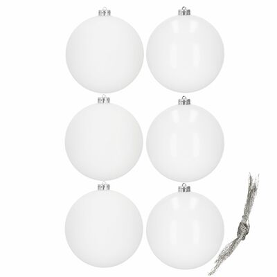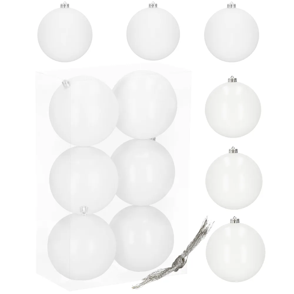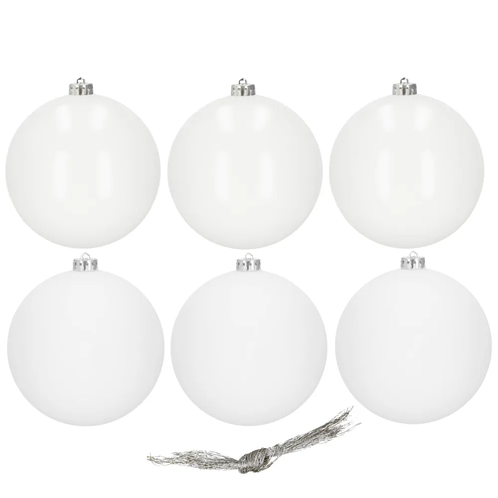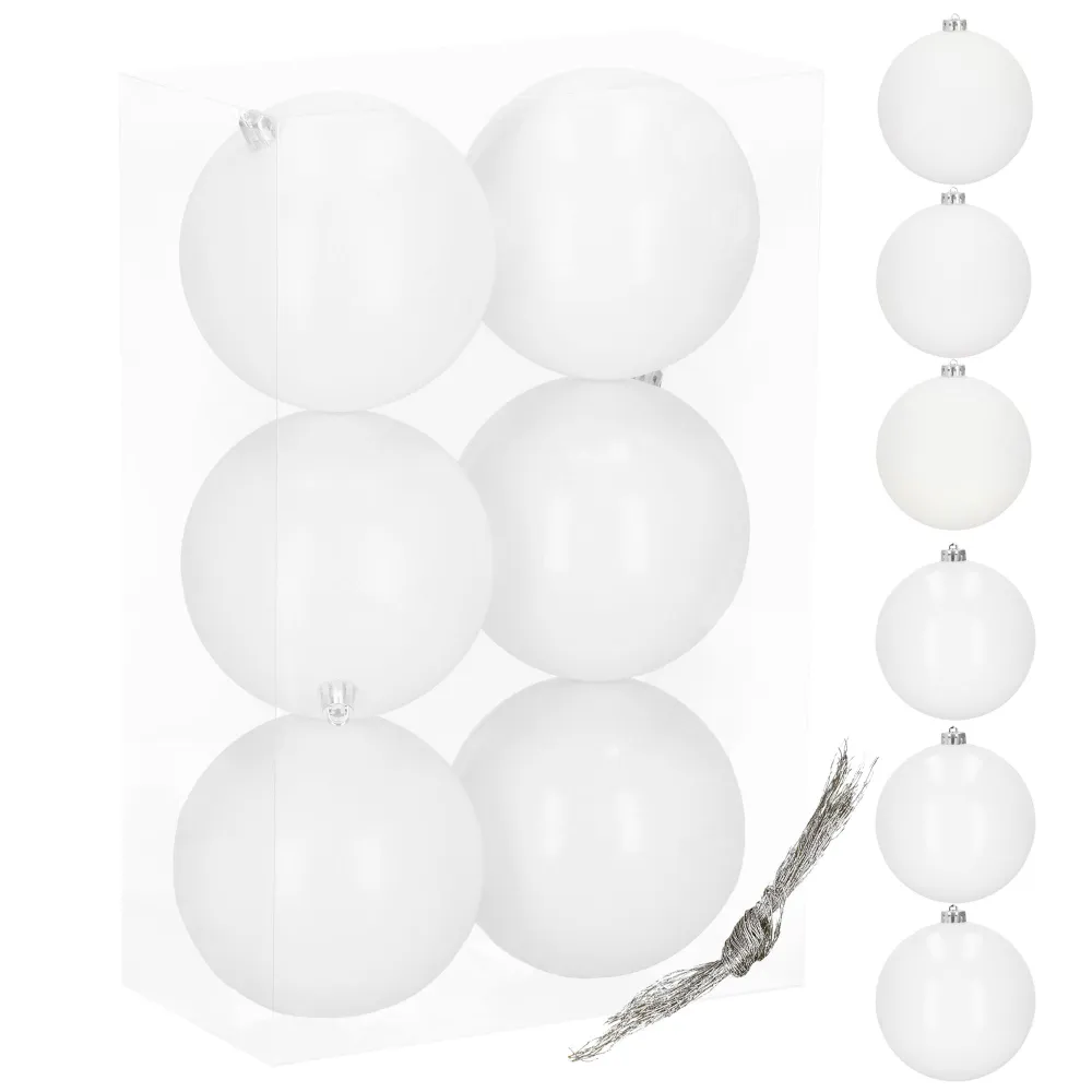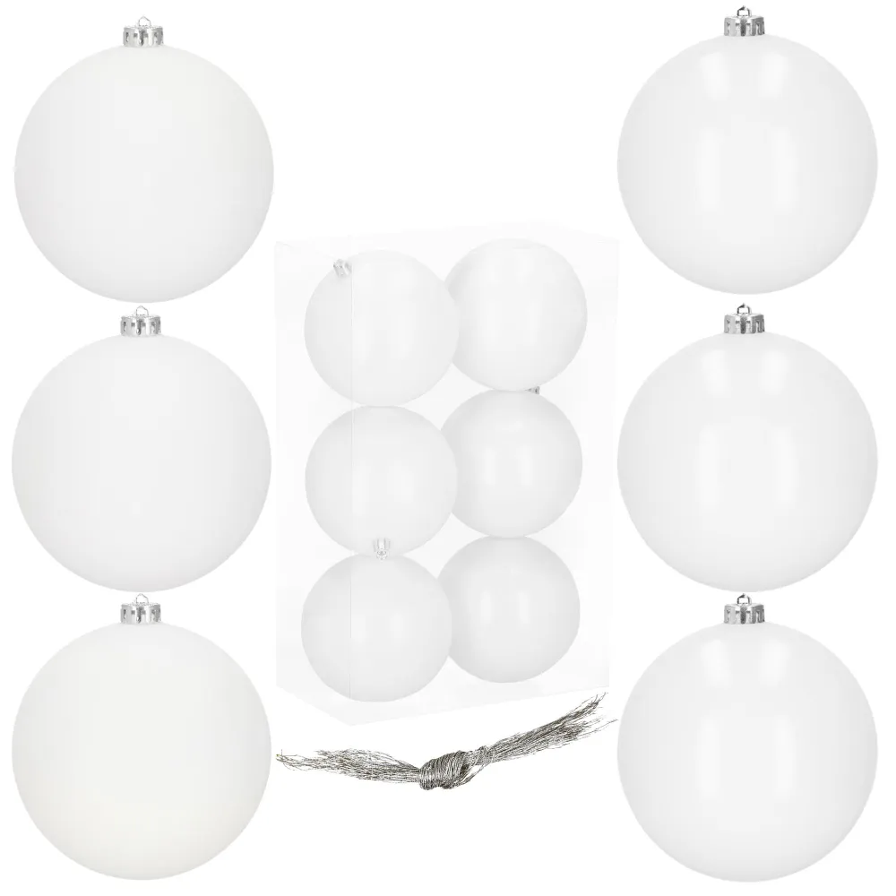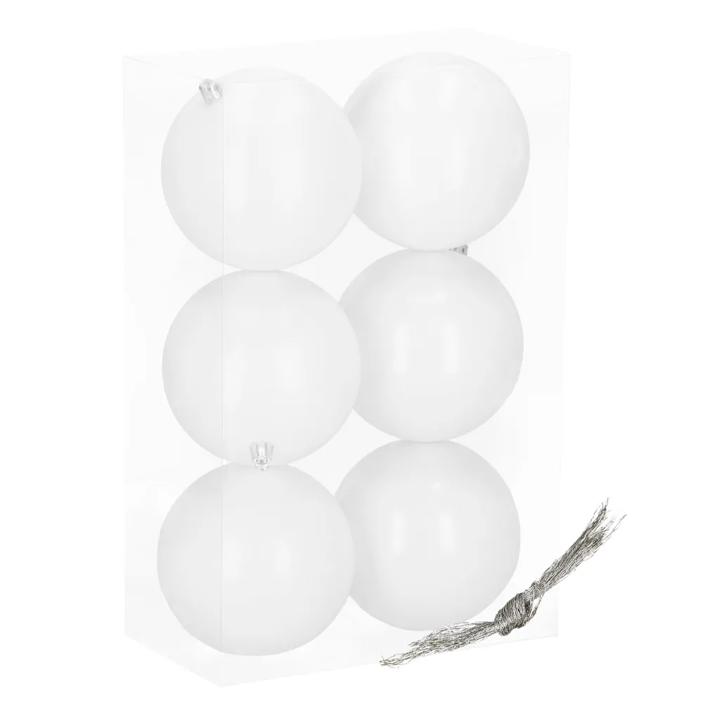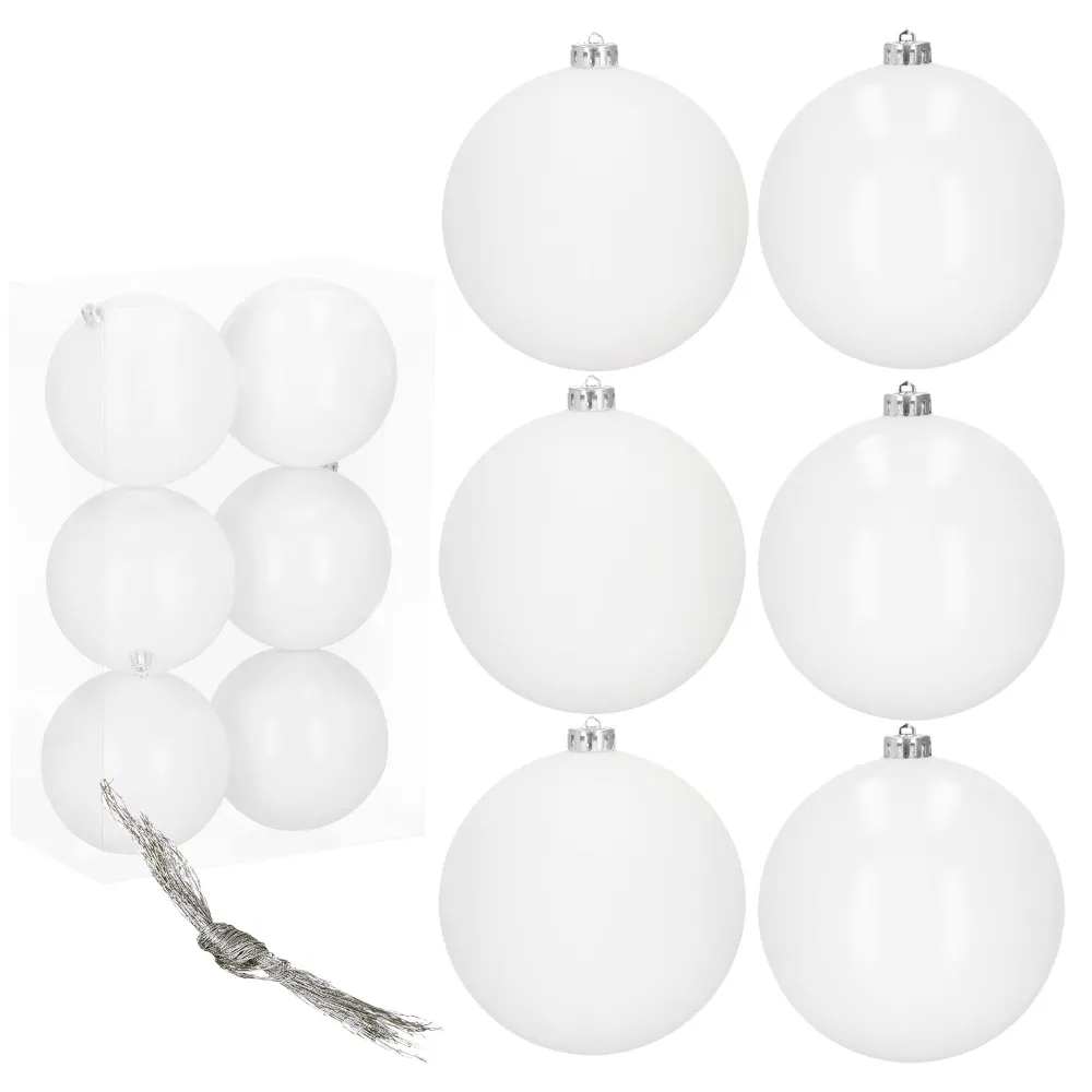 Sada 6 ks snehovo bielych baniek na stromček s dvoma rôznymi vzormi. Priemer banky 10 cm, pútko na zavesenie, nerozbitný plastový materiál. Ideálna ozdoba na zavesenie na stromček alebo ako vianočné dekorácie. Zadarmo povrázky pre ľahké zavesenie.