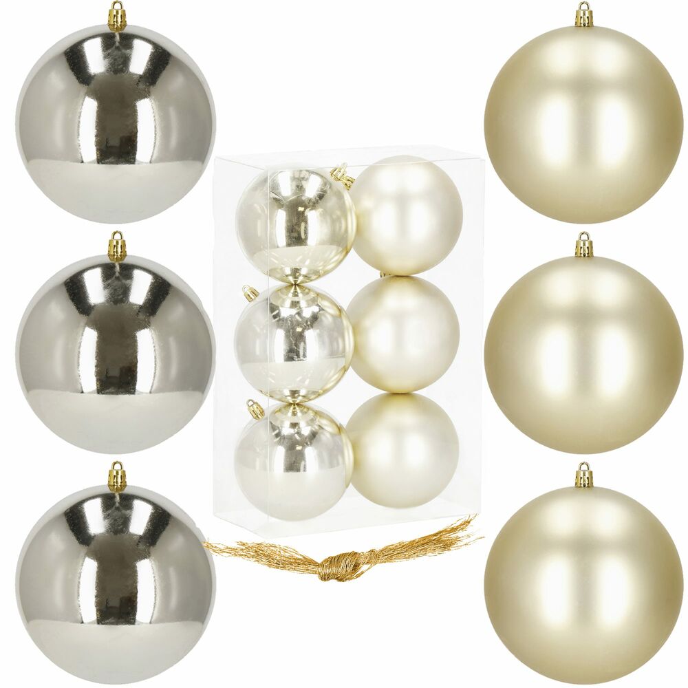 Sada 6 ks zlato-strieborných baniek na stromček s dvoma rôznymi vzormi. Priemer banky 10 cm, pútko na zavesenie, nerozbitný plastový materiál. Ideálna ozdoba na zavesenie na stromček alebo ako vianočné dekorácie. Zadarmo povrázky pre ľahké zavesenie.