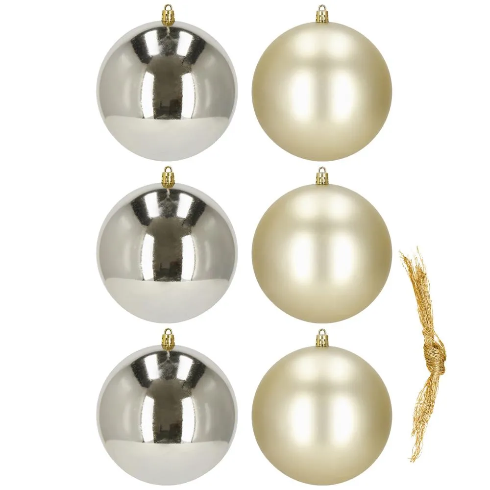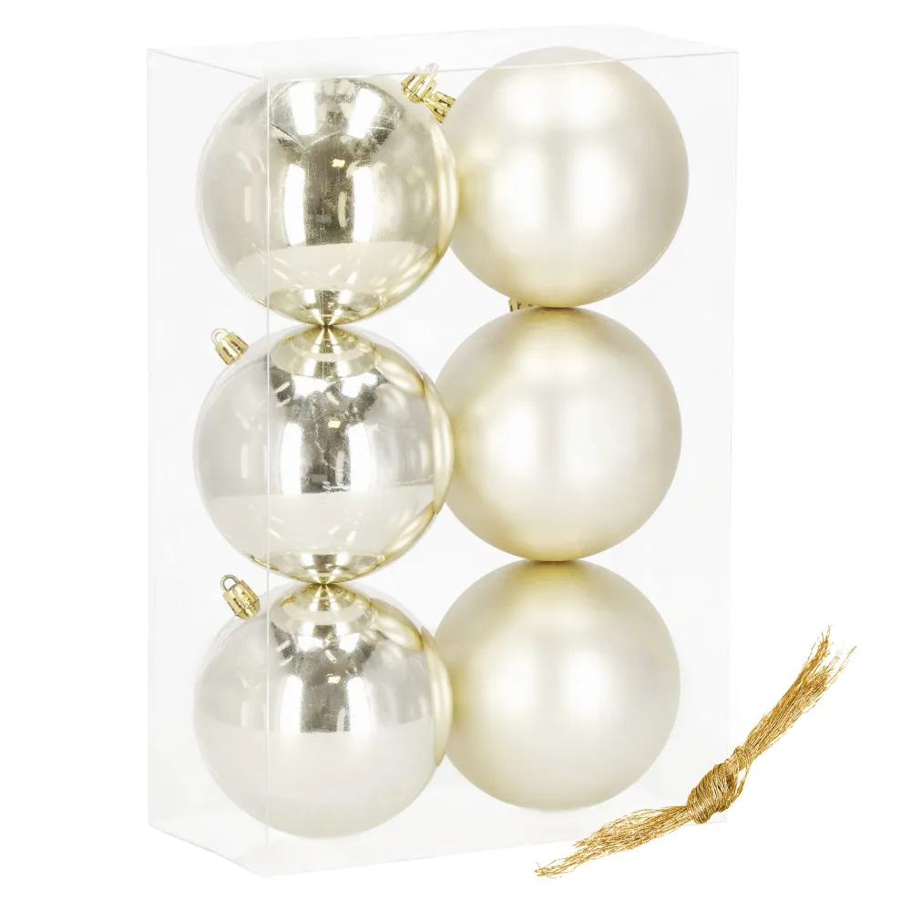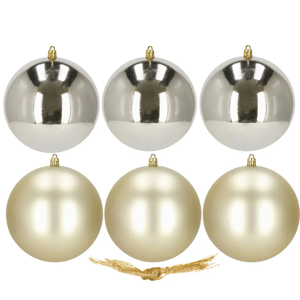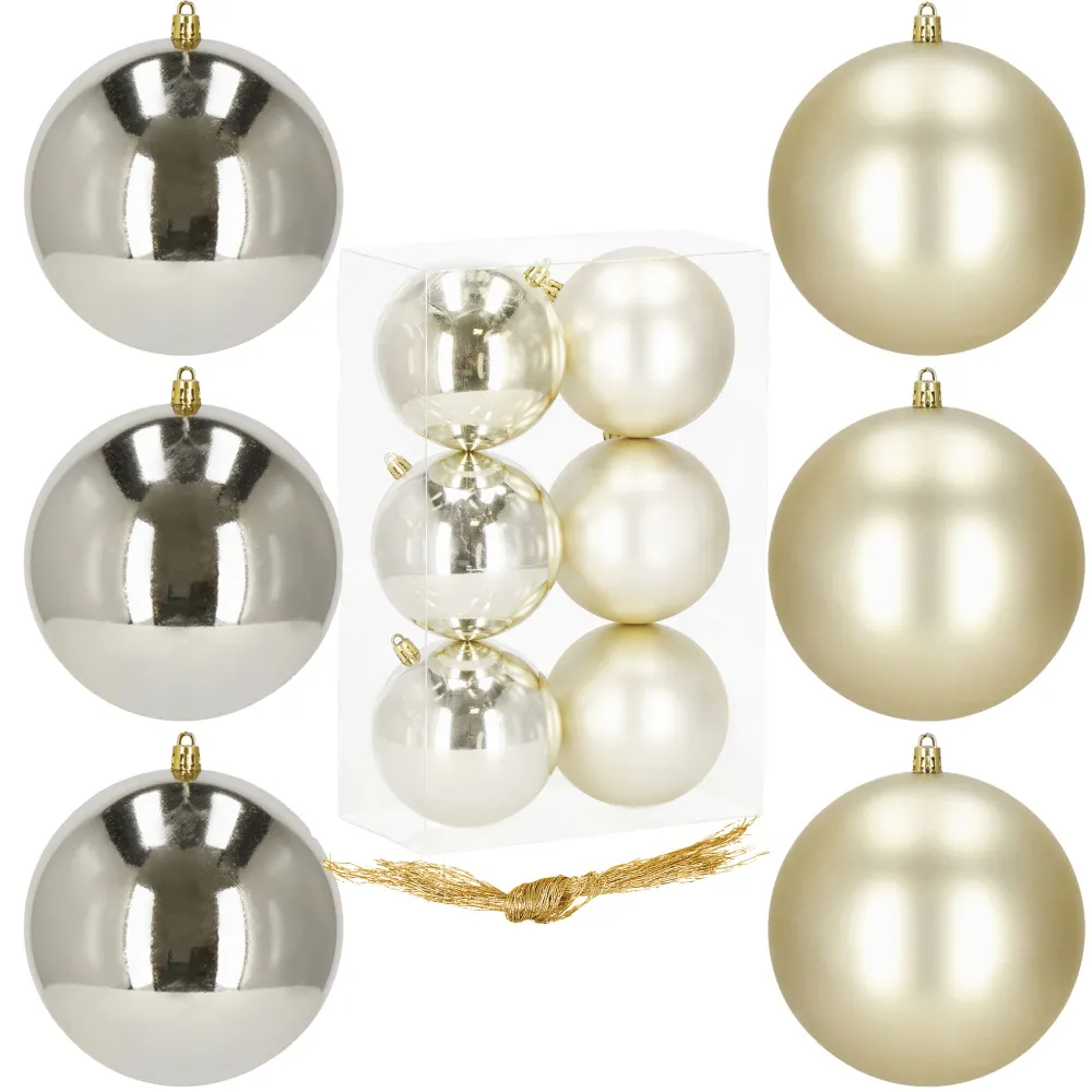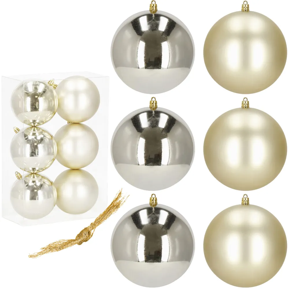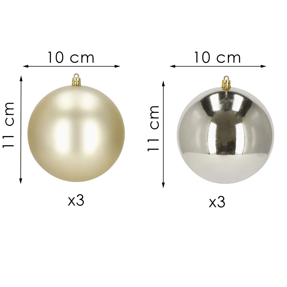 Sada 6 ks zlato-strieborných baniek na stromček s dvoma rôznymi vzormi. Priemer banky 10 cm, pútko na zavesenie, nerozbitný plastový materiál. Ideálna ozdoba na zavesenie na stromček alebo ako vianočné dekorácie. Zadarmo povrázky pre ľahké zavesenie.