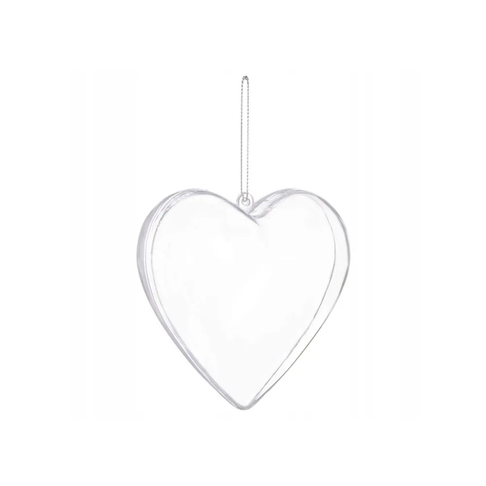 Priehľadná plastová banka v tvare srdca s možnosťou vytvorenia originálnej ozdoby. Ozdobte si vianočnú banku na stromček podľa svojich predstáv. Priemer 6 cm, nerozbitný plastový materiál, pútko a povrázok na zavesenie.
