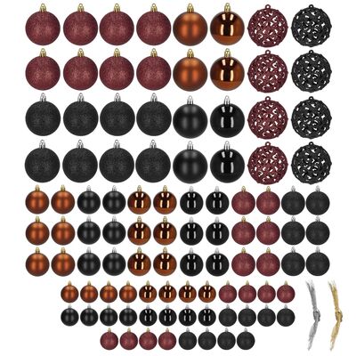 Luxusná 100 dielna sada vianočných baniek na stromček. Set tvoria 4 rôzne vzory baniek čiernej a hnedej farby o veľkostiach 3, 4 a 6 cm. Všetko z nerozbitného plastového materiálu. Nádherná ozdoba na zavesenie na vianočný stromček alebo ako vianočné dekorácie. Zadarmo povrázky pre ľahké zavesenie.