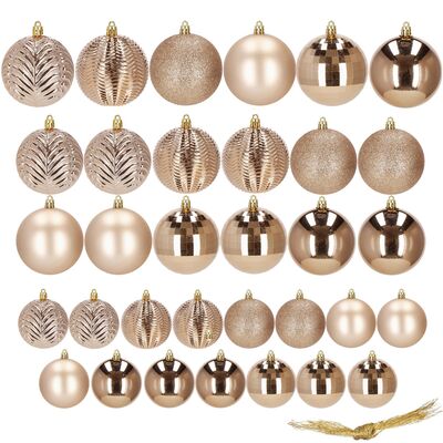Sada 33 ks zlato-ružových baniek na stromček s piatimi rôznymi vzormi. Priemer banky 4, 6 a 8 cm, pútko na zavesenie, nerozbitný plastový materiál. Ideálna ozdoba vianočného stromčeka alebo ako vianočná dekorácia. Zadarmo povrázky pre ľahké zavesenie.