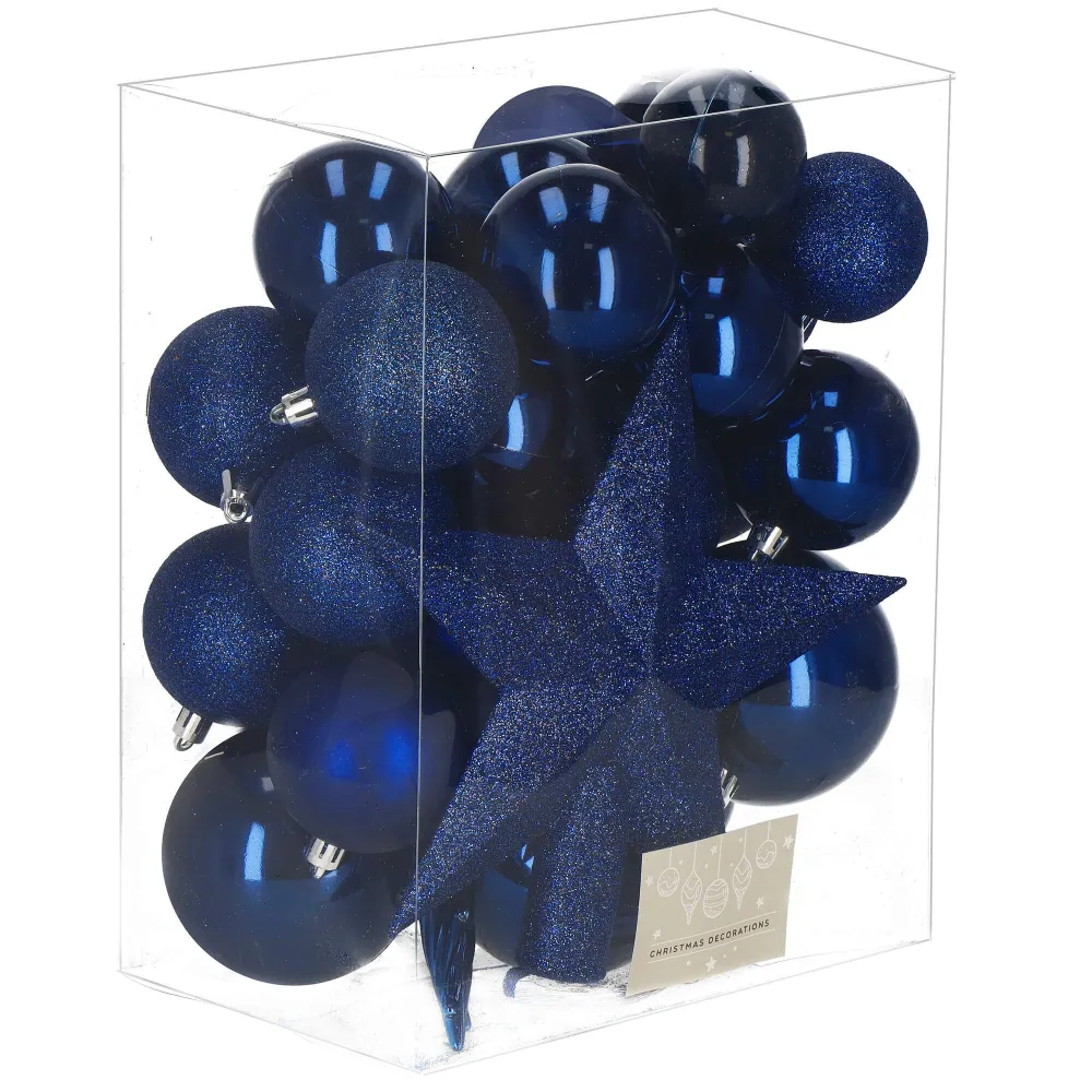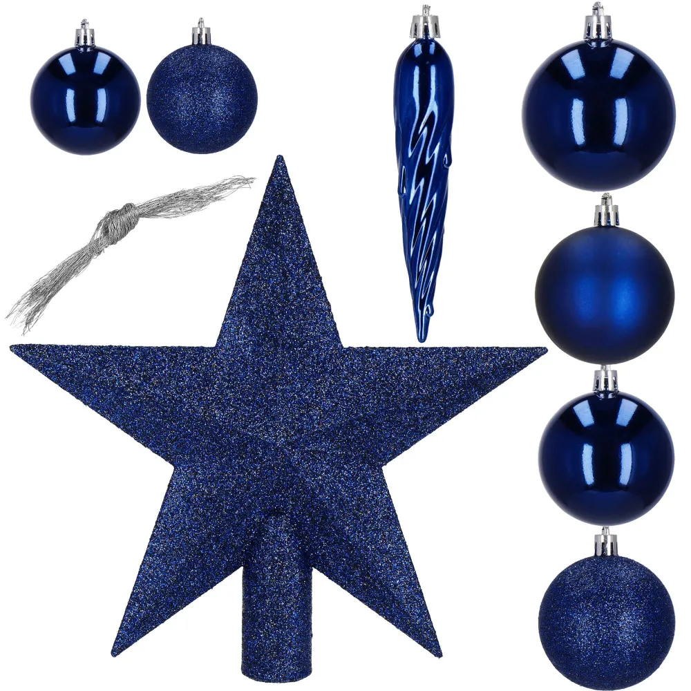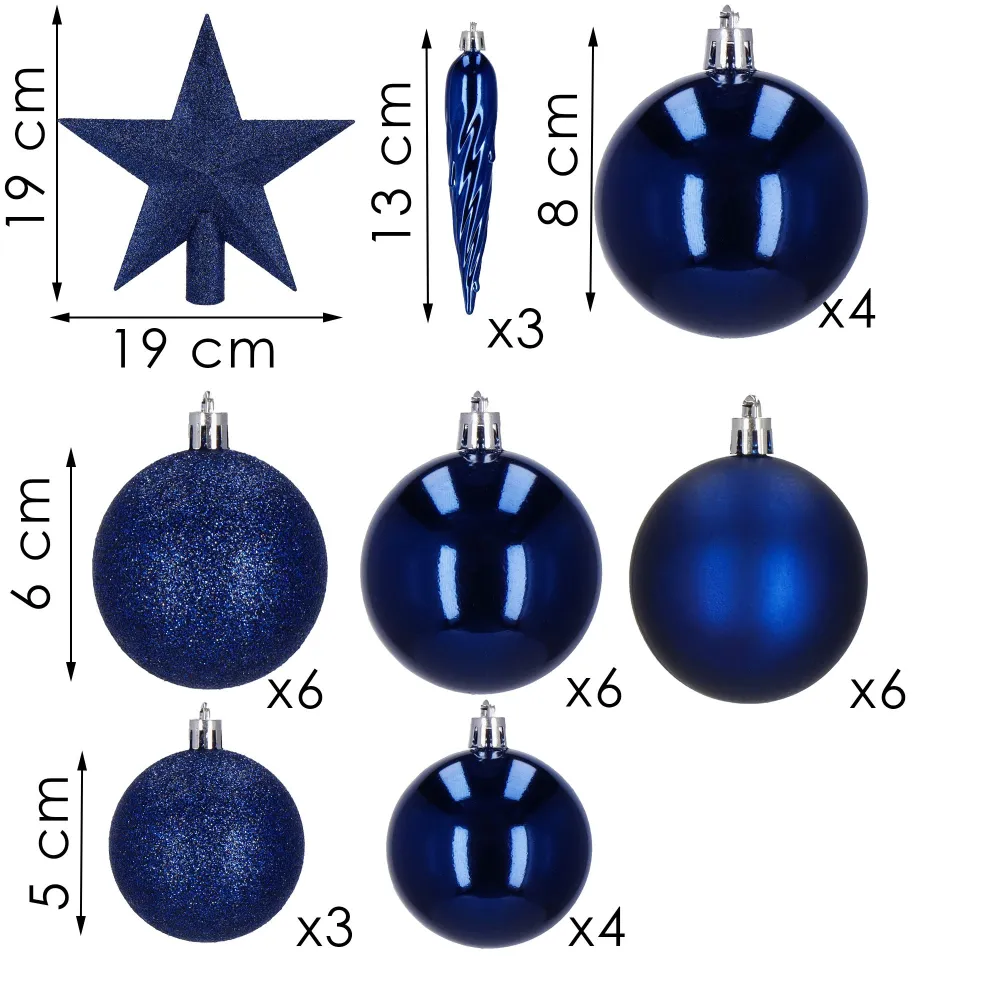 Luxusná 33 dielna sada vianočných ozdôb na stromček. Set tvoria 3 rôzne vzory ozdôb modrej farby + prekrásna hviezda na špičku stromčeka. Všetko z nerozbitného plastového materiálu. Ideálna ako ozdoba na zavesenie na stromček alebo ako vianočné dekorácie. Zadarmo povrázky pre ľahké zavesenie.