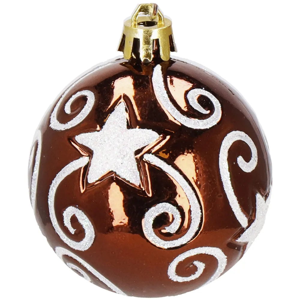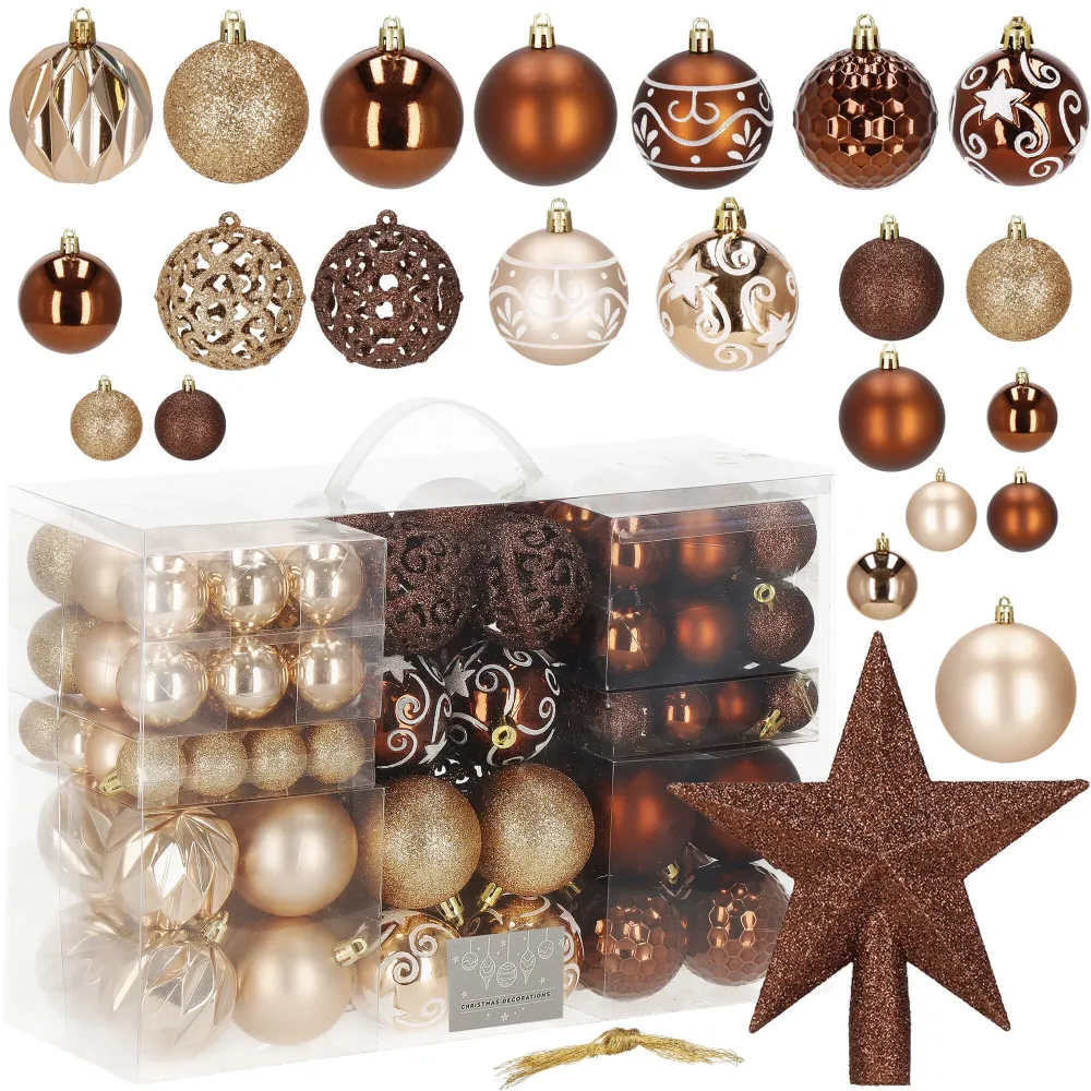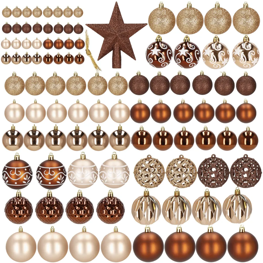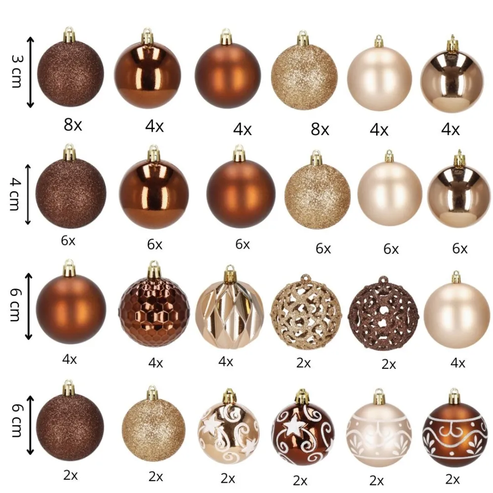 Luxusná 101 dielna sada vianočných ozdôb na stromček. Set tvoria 2 rôzne vzory ozdôb zlato-hnedej farby + prekrásna hviezda na špičku stromčeka. Všetko z nerozbitného plastového materiálu. Ideálne na výzdobu stromčeka alebo ako vianočné dekorácie. Zadarmo povrázky pre ľahké zavesenie.