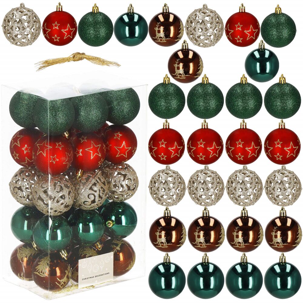 Štýlová sada vianočných ozdôb vo farebnom mixe so zlatým zdobením dodá vášmu stromčeku tradičný a elegantný vzhľad. Gule s priemerom 6 cm sú ideálne na stromček aj ako dekorácia do interiéru. Vyrobené z nerozbitného plastu, vhodné na vnútorné i vonkajšie použitie. Súčasťou balenia sú pútka na zavesenie. Celkom 30 kusov v sade.