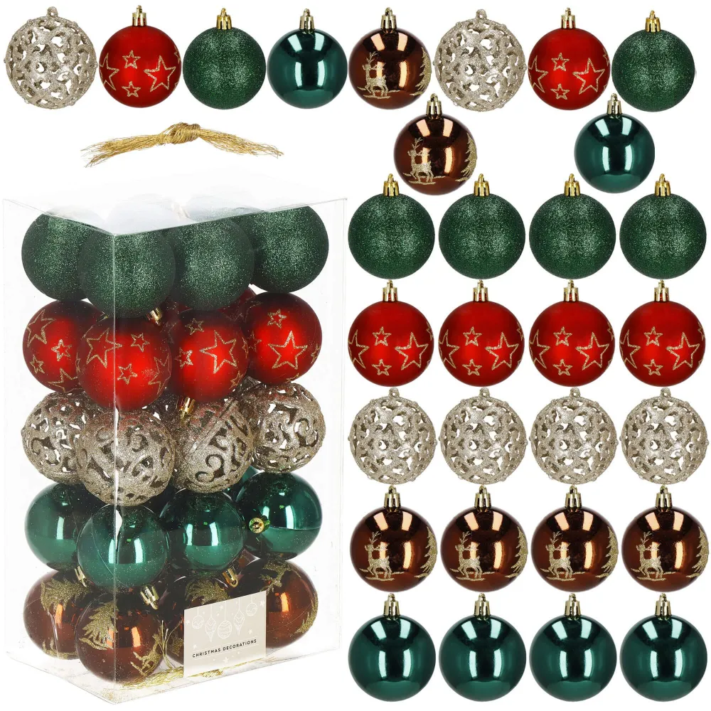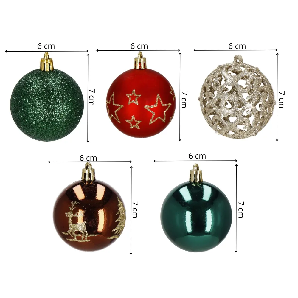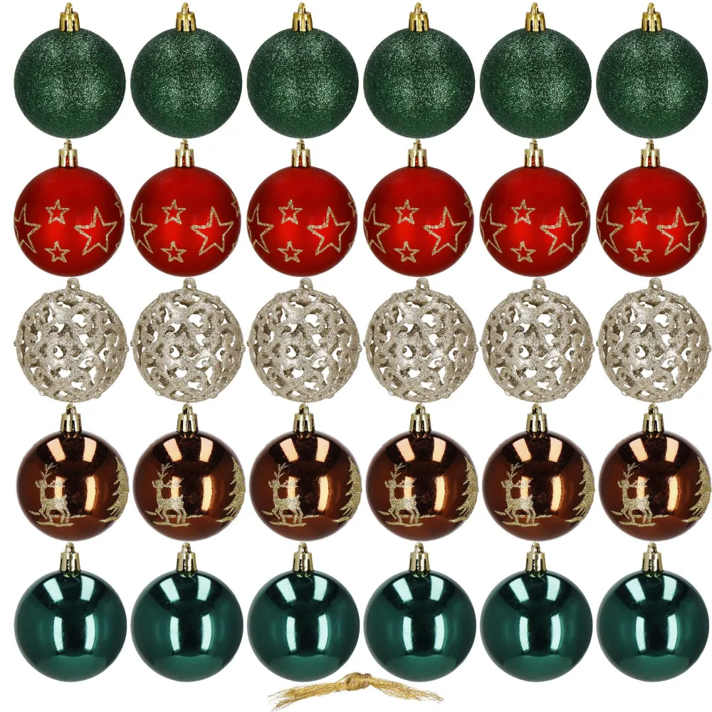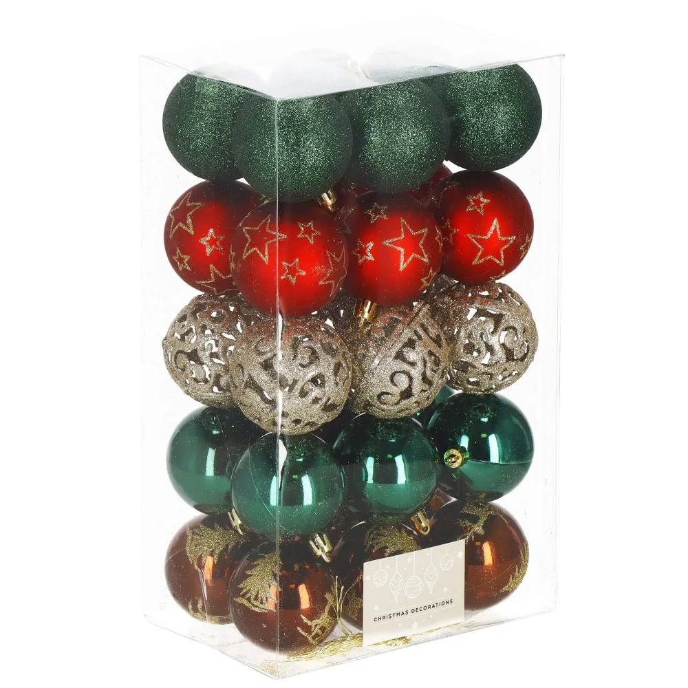 Štýlová sada vianočných ozdôb vo farebnom mixe so zlatým zdobením dodá vášmu stromčeku tradičný a elegantný vzhľad. Gule s priemerom 6 cm sú ideálne na stromček aj ako dekorácia do interiéru. Vyrobené z nerozbitného plastu, vhodné na vnútorné i vonkajšie použitie. Súčasťou balenia sú pútka na zavesenie. Celkom 30 kusov v sade.