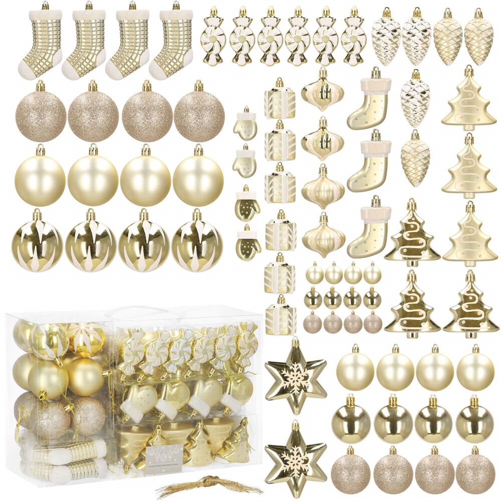 Luxusná sada vianočných ozdôb v zlatom prevedení pre dokonalú sviatočnú výzdobu. Obsahuje 77 kusov v 21 rôznych vzoroch - gule, hviezdy, stromčeky, pančuchy a ďalšie tvary. Vyrobené z nerozbitného plastu, vhodné na vnútorné i vonkajšie použitie. Súčasťou balenia sú pútka na zavesenie. Ideálne na ozdobenie vianočného stromčeka i ďalších dekorácií.