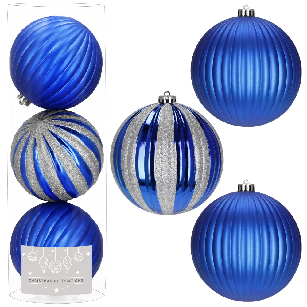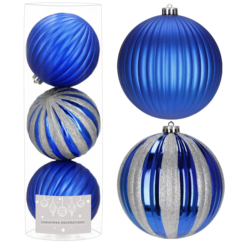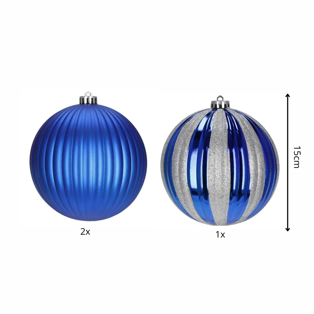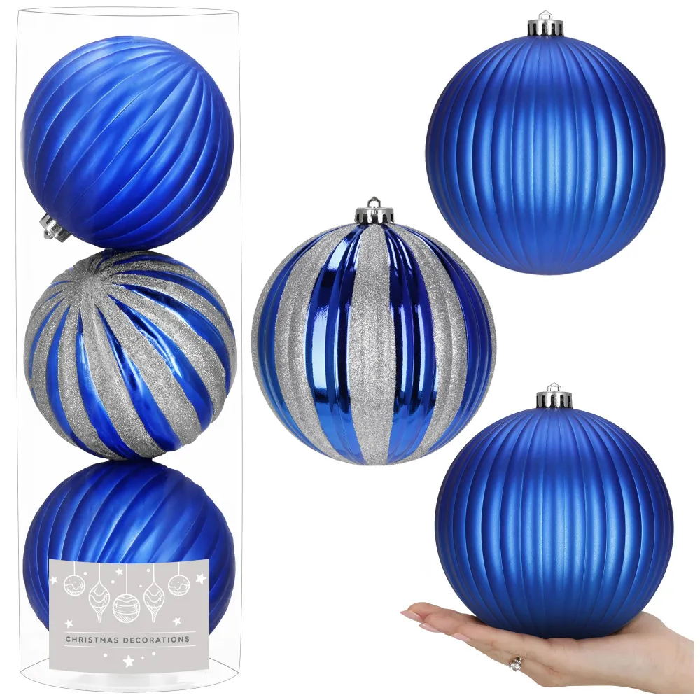 Vianočné banky modrej mix – 15 cm, sada 3 ks CA1366, dodajú vašej vianočnej výzdobe moderný a elegantný vzhľad . Kombinácia sýto modrej farby so strieborným zdobením vytvára jedinečný kontrast, ktorý pôsobí luxusne a slávnostne. Vďaka svojmu veľkému priemeru 15 cm sa tieto ozdoby stanú výrazným prvkom na vianočnom stromčeku, ale aj samostatne v rôznych dekoráciách.