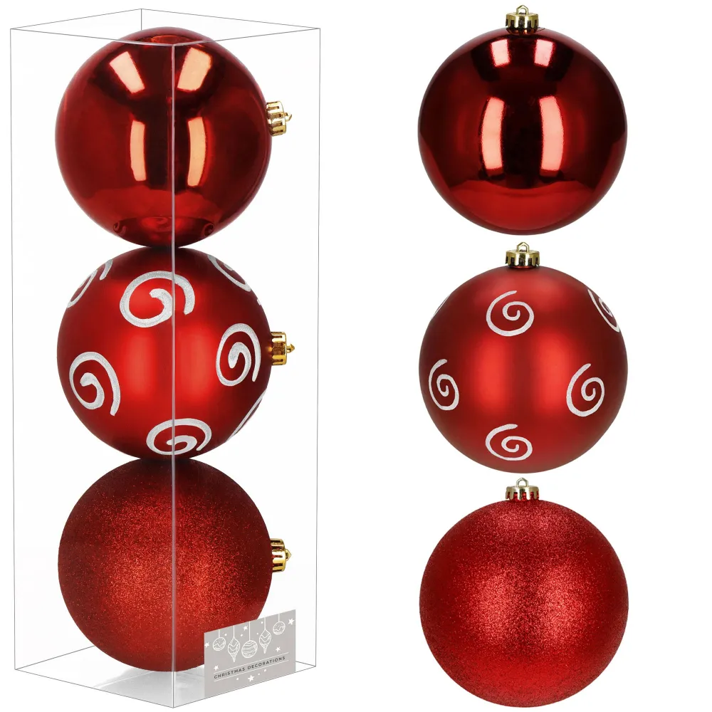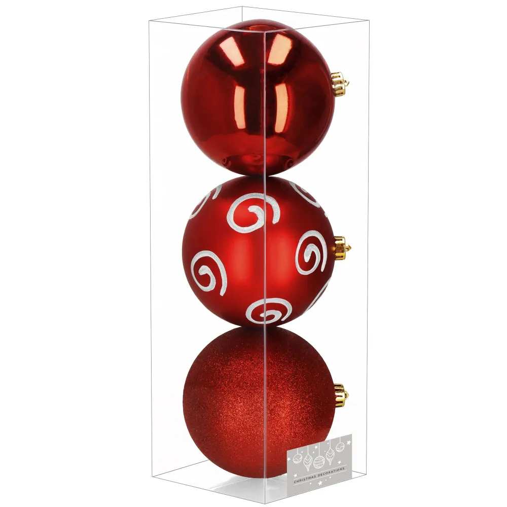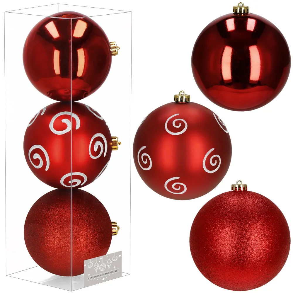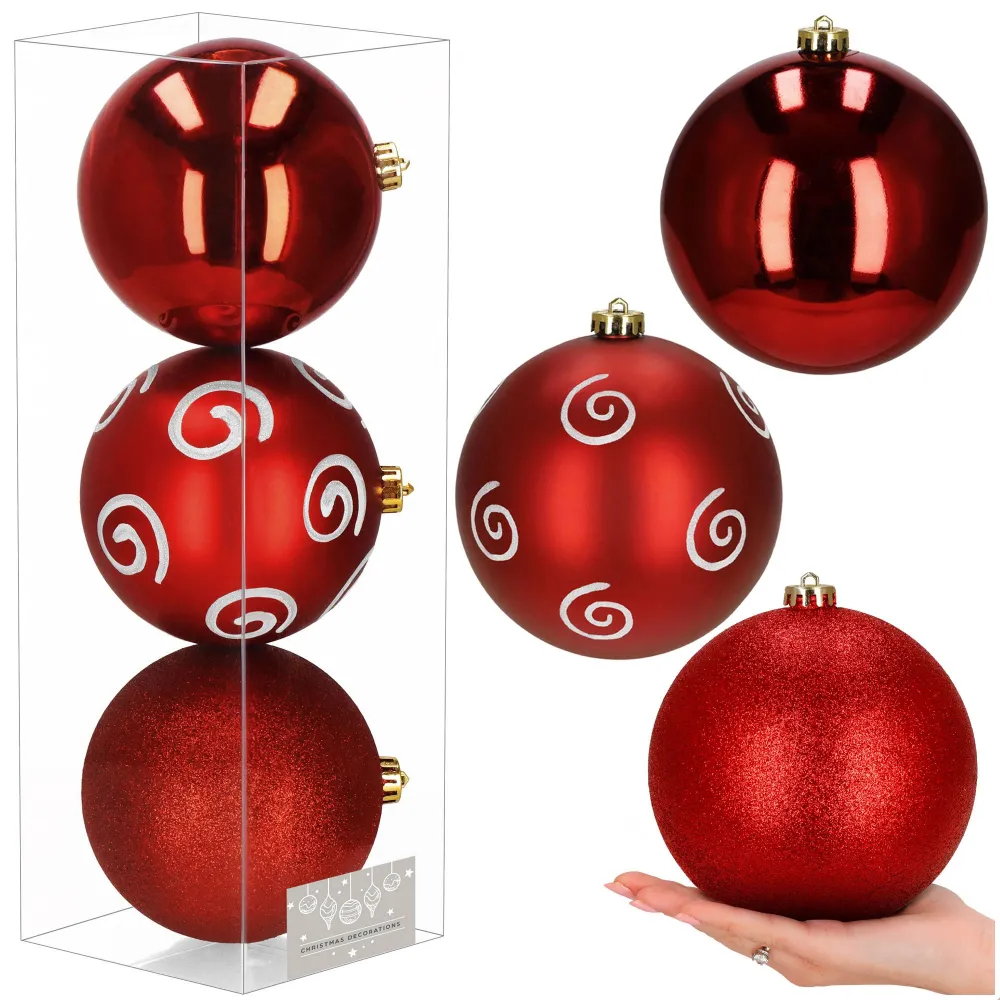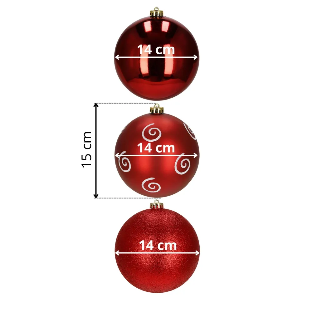 Súprava troch červených vianočných gulí s priemerom 15 cm v lesklom, matnom a trblietavom prevedení dodá vášmu domovu sviatočnú atmosféru. Sú ideálne ako ozdoby na stromček alebo dekorácie do interiéru aj exteriéru. Vďaka pútku sa ľahko zavesujú a nerozbitný plastový materiál zaručuje bezpečné použitie v každom prostredí.