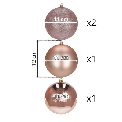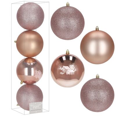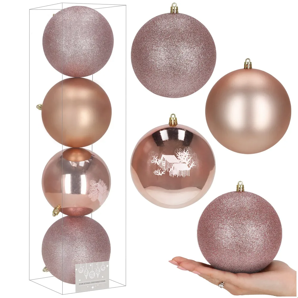 Elegantná sada vianočných ozdôb v ružovom mixe s jemným bielym zdobením vnesie do vašej výzdoby romantický a moderný nádych. Gule s priemerom 12 cm sú ideálne na vianočný stromček aj ako štýlová dekorácia. Vyrobené z nerozbitného plastu, vhodné na vnútorné i vonkajšie použitie. Súčasťou balenia sú pútka na zavesenie. Celkom 4 kusy v sade.